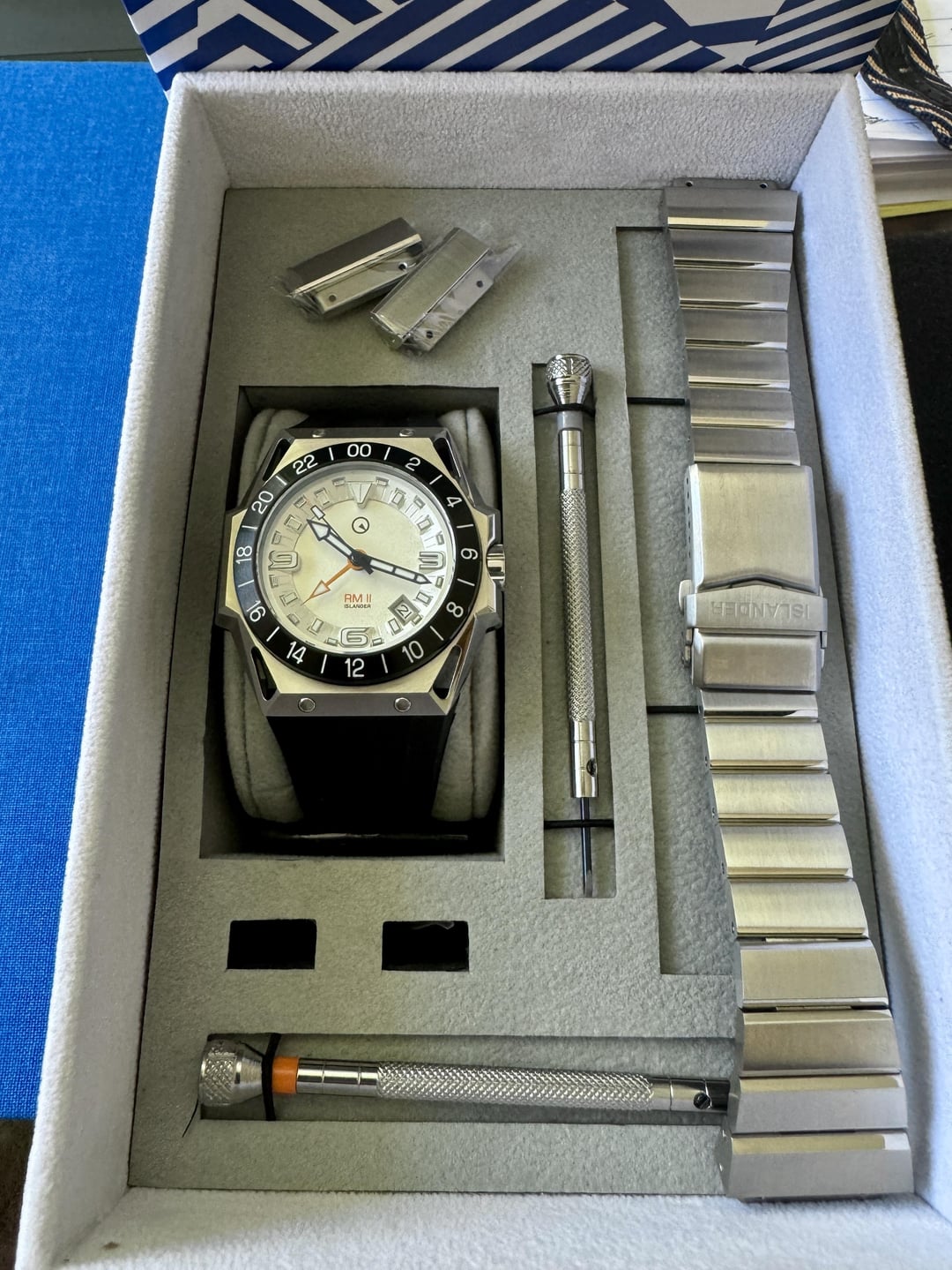 **\[WTS\] Islander x The Urban Gentry "Rangemaster II GMT"** Selling a beautiful, like new Islander x The Urban Gentry "Rangemaster II GMT" watch in original box. This limited edition was only available for a limited time and comes with all accessories (rubber sstrap, metal band, strap adapters and screw drivers. Looks and works perfectly. ***From Islander website*** Introducing the 3rd watch in the Rangemaster collection. This year, the Limited Edition model returns as an automatic traveler’s GMT, with a case style that was clearly born in the future. The most ambitious Rangemaster yet has been redesigned from the ground up – not only the watch, but the packaging as well. Taking inspiration from the first Rangemaster (a modernized, everyday field watch) and iconic 1970s and 80s era film and watch designs, the Rangemaster II GMT leaps one step further toward tomorrow with a bigger, bolder, more assertive concept—much like an excellent sequel to your favorite sci-fi movie. Limited to 500 pieces, 250 black (ISL-266) and 250 white (ISL-267). FULL KIT INCLUDES: * Watch on bracelet * Extra deployant rubber strap * Screwdriver for sizing bracelet * Screwdriver for changing bracelet * Silicone cover to place over watch for protection when changing strap * Pair of strap adapters * Extra spring bars and screws * Certificate of Authenticity with LE number PRODUCT FEATURES * Movement:Miyota 9075 Traveler GMT, handwind and hacks * Case:Stainless steel, skeletonized lugs, 43.2mm x 13.8mm, 45.4mm tip to tip * Back:Solid embossed caseback * Crystal:Flat sapphire with inner AR * Band:Stainless steel with deployant buckle, + bonus rubber strap * Water Resistant:150 meters * Weight:204 grams (on bracelet) * Warranty:1 year **Price**: **$525** Shipped **Payment types accepted**: Venmo, Zelle or ApplePay are best options.