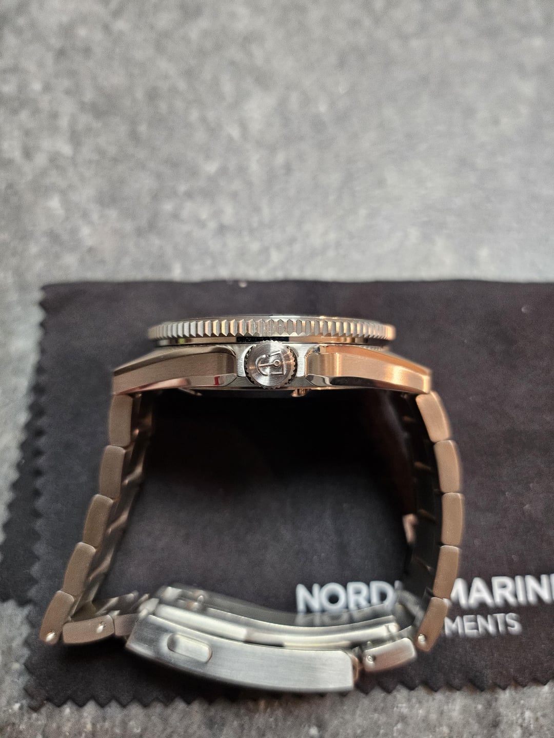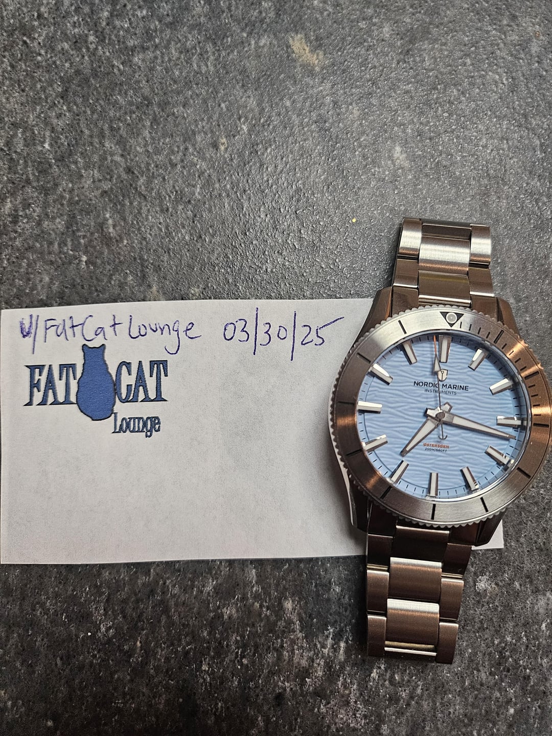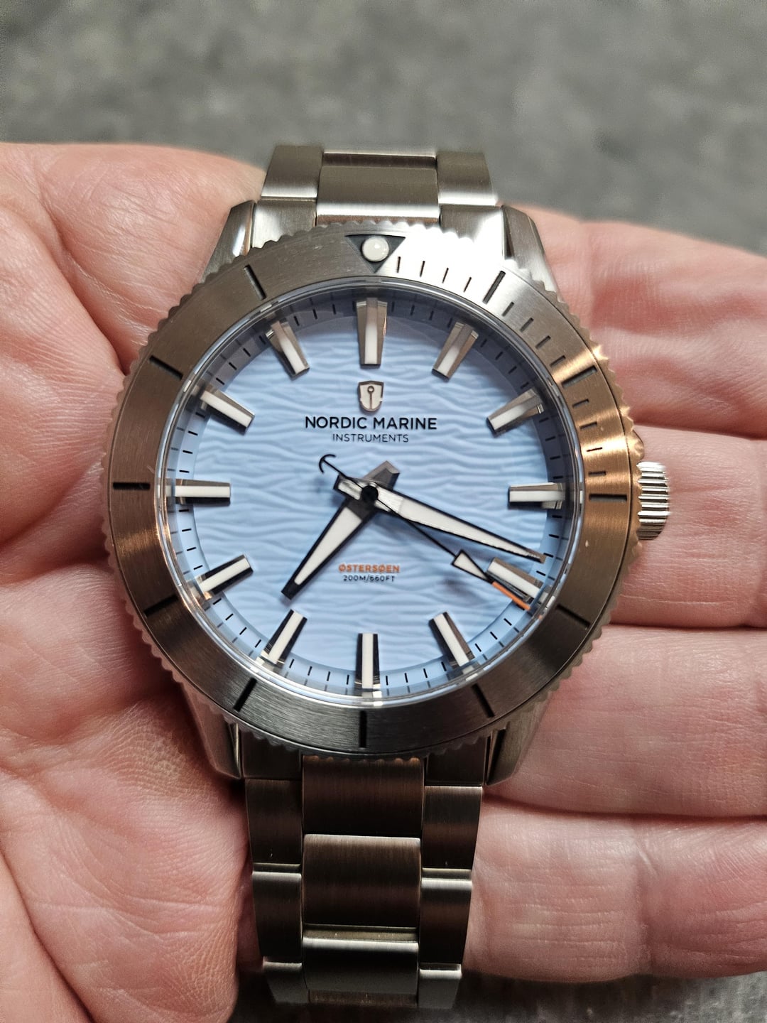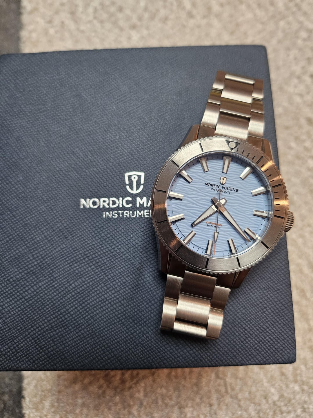 For sale: Nordic Marine Instruments Ostersoen Himmelbla Watch condition: Pre-owned. Watch is in mint condition. Dimensions: - 40mm case width - 11.9mm case thickness - 48mm case length / lug-to-lug - 20mm lug width tapers to 16mm at clasp - Bracelet fits up to 8.5-inch wrists Includes: Box, papers, full links, watch roll. Price: $499 Payment: PayPal F&F, Venmo, Zelle, and PayPal G&S (add 3%) accepted. Shipping: Free USPS shipping within CONUS. Location: Fernandina Beach, Florida Trades: No trades at this time.