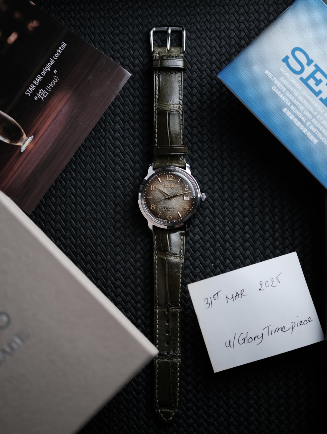 Up for sale is the Seiko Presage Hojicha SARY183/SRPF43J1 Limited Edition – 0894 / 7,000 pieces – full set in excellent condition. **[Album](https://imgur.com/a/starbar-hou-d7YaaeG)** **[Timestamp](https://i.imgur.com/19wTQVy.jpeg)** These limited edition watch are inspired by one of the world’s leading bartenders, Mr. Hisashi Kishi, and his special cocktails that capture the “scenes from Kyoto.” The dial of this watch has a pattern that is reminiscent of Kyoto’s famous tea leaves. This is a special edition that allows you to feel the deep flavors and tastes drawn from the rich ingredients of Kyoto. The stainless steel case measures 38.5mm in diameter, 11.8mm thick, with a 45.4mm lug-to-lug length and 20mm lug width – offering a comfortable fit on most wrist sizes. Inside beats Seiko’s in-house caliber 4R35 automatic movement, running at 21,600 beats per hour with a 41-hour power reserve. **Included :** The watch comes in full set, including the original box, instruction manual, warranty card, hang tag, and the special artisan cocktail recipe card – a signature touch of this limited release. I replaced the original strap with alligator pattern leather strap. Overall in excellent condition, no big scratches/dents. Theres some hairline wear on crown side ( please see the album ) Price: **$680 + $35 flat shipping (via FedEx/DHL – I cover half). Not accepting trades. Payment via PayPal Friends & Family or Goods & Services (+4.6% fee covered by the buyer). Thank you, please message me with any questions or if you’re interested. Feel free to have a look at my watches. Instagram: @watchtique