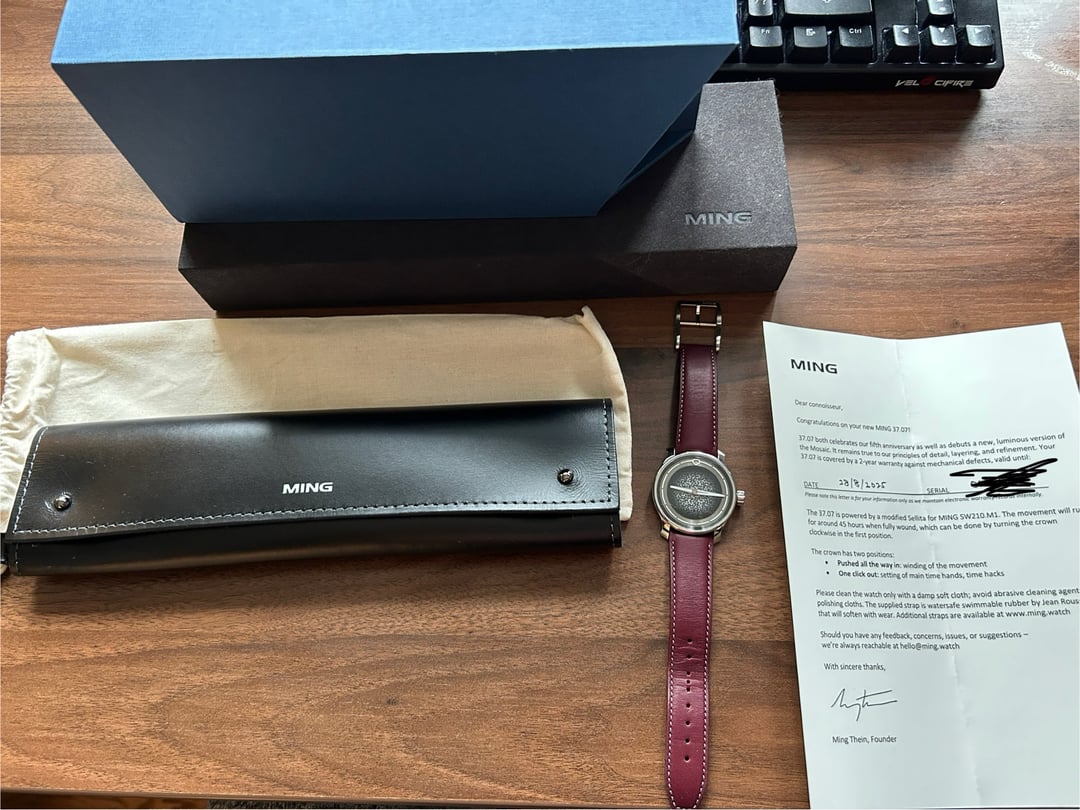For sale is a 2023 Ming 37.07 - Mosaic Dial - full kit - $2500 I bought this brand new from Ming when released. Warranty is good until 8-28-25. The watch is in great condition, but does show light signs of wear – mainly light hairlines, but crystal (front and back) are clean. See pictures for specifics and happy to send more pics if needed. ABOUT THE WATCH * 38mm diameter, 10.9mm thick, 44.5mm lug-to-lug * 20mm lug width * 316L stainless steel, domed sapphire crystal front and rear * Double-sided antireflective coating on both crystals * Composite dial with circular brushed, printed and luminous metal base and double surface printed and gradient fade sapphire dial * 100m water resistance * Sellita for MING SW210.M1, anthracite skeletonized bridges with contrast rhodium circular brushing * Manual winding with \~40h power reserve at full wind WHAT'S INCLUDED: * Watch * Full box and papers (Ming leather travel pouch, dustbag, box, warranty which runs through 8/28/2025) * Original Leather Strap (Worn) PRICE AND PAYMENT METHOD: * Price: $2,500 * Shipping: USPS priority from Chicago to CONUS. * Payment Method: Venmo, Zelle, or Paypal F&F only PICTURES: * Pictures: [https://imgur.com/a/OebJ6rb](https://imgur.com/a/OebJ6rb) * Video1: [https://imgur.com/bYxai0x](https://imgur.com/bYxai0x) * Video 2: [https://imgur.com/UiOiTkV](https://imgur.com/UiOiTkV) * Timestamp: [https://imgur.com/a/0s7Axf6](https://imgur.com/a/0s7Axf6) * Original Product Page: [https://www.ming.watch/products/ming-37-07](https://www.ming.watch/products/ming-37-07)
