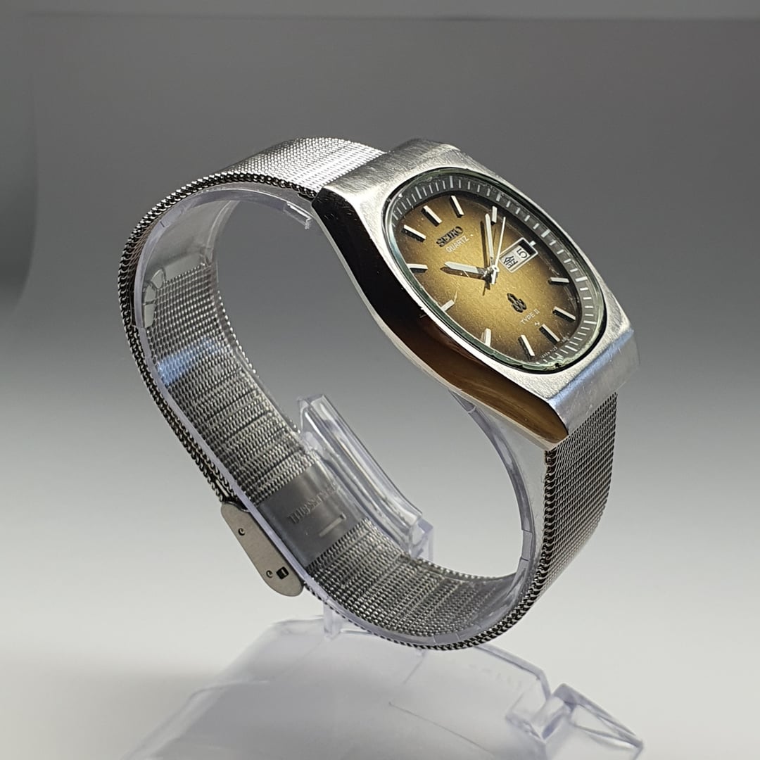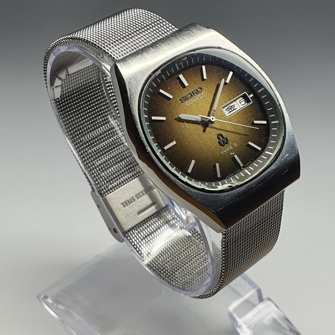 For sale is this vintage Seiko Type-II 7123-503B, made in Japan, in November of 1978. The Type-II series by Seiko, only sold in Japan, was aimed at making a quartz series of quality that was more affordable than the QT/QR/QZ cal.38 and cal.48 series that preceded it despite most of the line being more expensive than the automatic offerings. This example has a beautiful "mocha" or tiger-eye sunburst dial which is unique to this listing, you won't find another like it. It contrasts very well to the white-tipped pencil hands and protruding white baton markers. The dial has applied Seiko logo as well as the single quartz crystal logo and a printed "Type II" and Daini factory lightning bolt symbol (made during their fierce rivalry with the Suwa factory). The silver date wheel can display Japanese Kanji or English days of the week with Saturday in blue and Sunday in red (rest in black). The case shape is very '70s with the TV-style dial cutout. The bracelet is a brand new adjustable Milanese mesh bracelet and will fit most wrists. The quartz calibre 7123 is beautiful to look at - an early quartz movement from the golden age of quartz when Seiko was at the forefront of the quartz revolution, making high-quality movements built to last compared to a lot of cheap quartz movements you get nowadays. Condition is good being almost 50 years old. General wear is expected. Dimensions are: 36mm x 40.5mm x 8.8mm Lug Width 19mm Looking for $125 net (buyer pays Paypal fees) International tracked shipping: $10 More pics: [https://flic.kr/s/aHBqjC6WW3](https://flic.kr/s/aHBqjC6WW3) Bought in Japan. \*Returns accepted but return postage costs are the buyer's responsibility in all circumstances