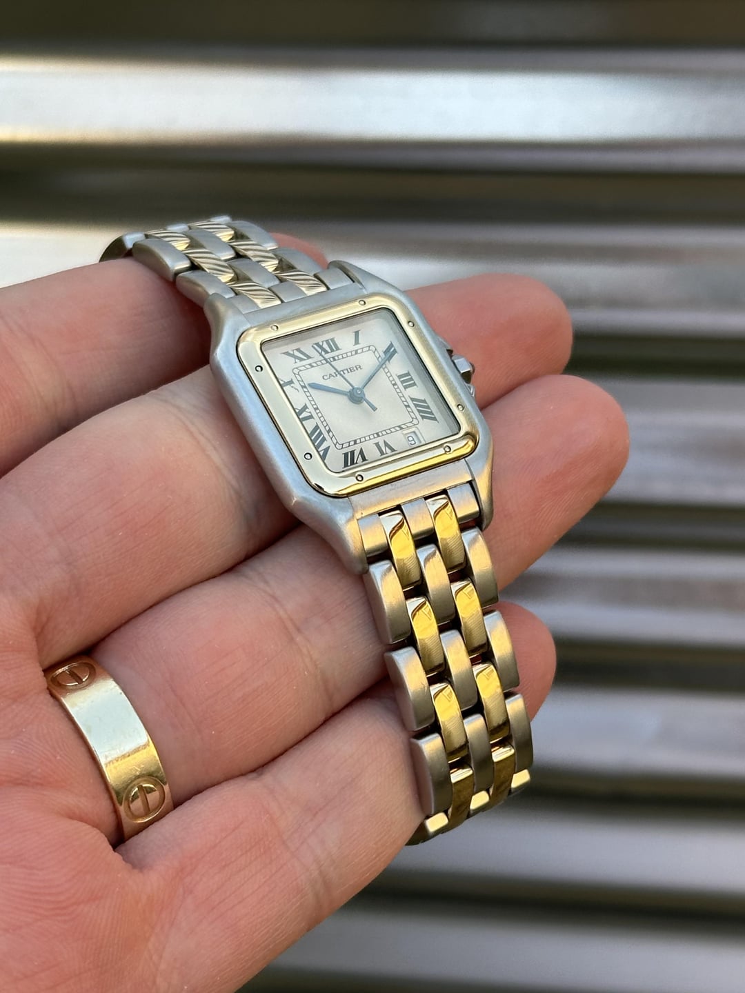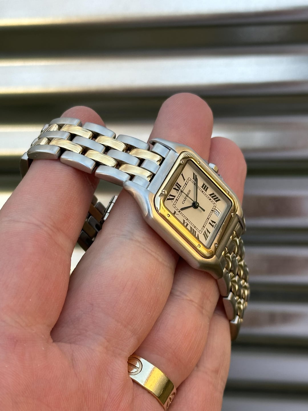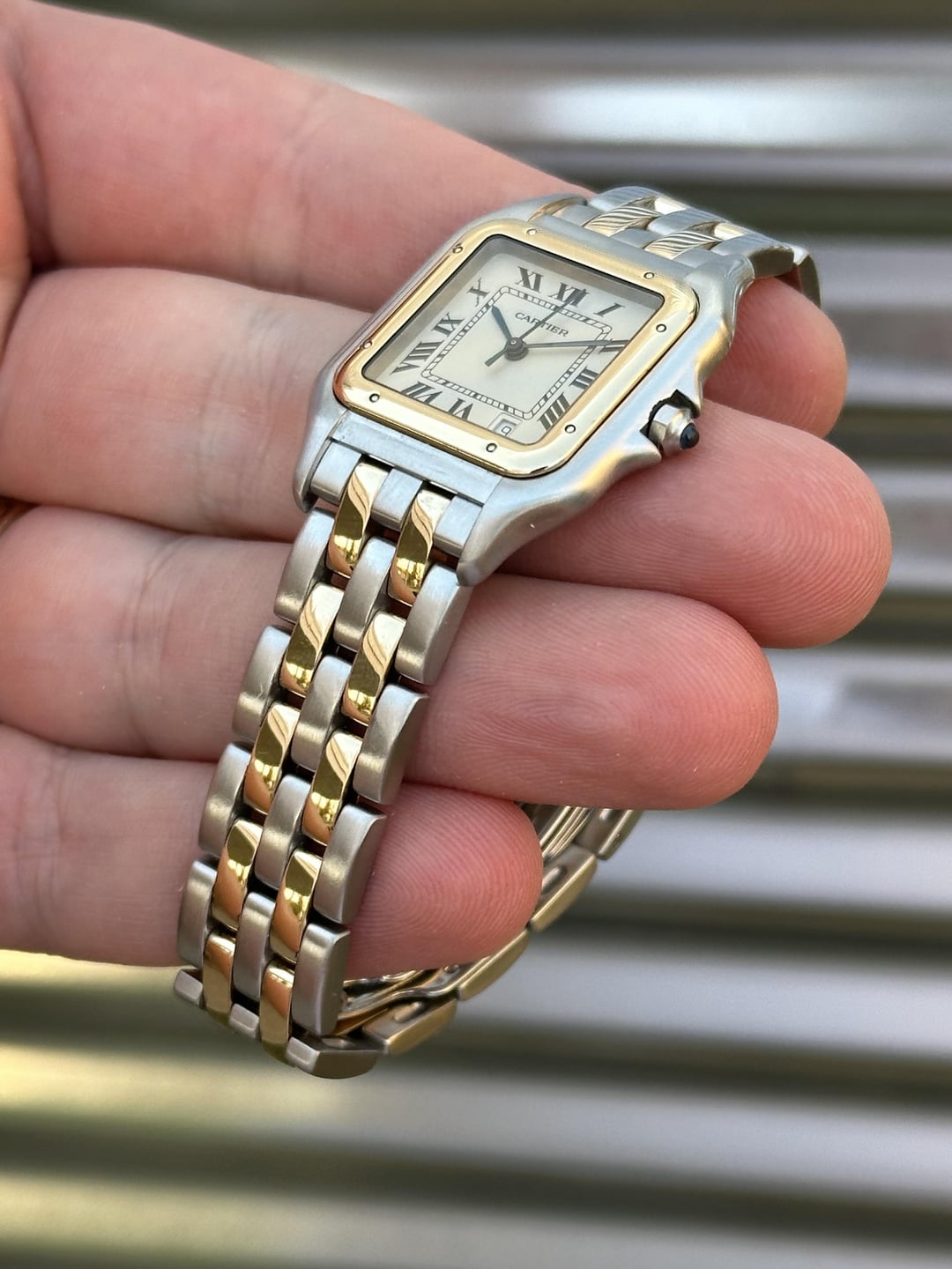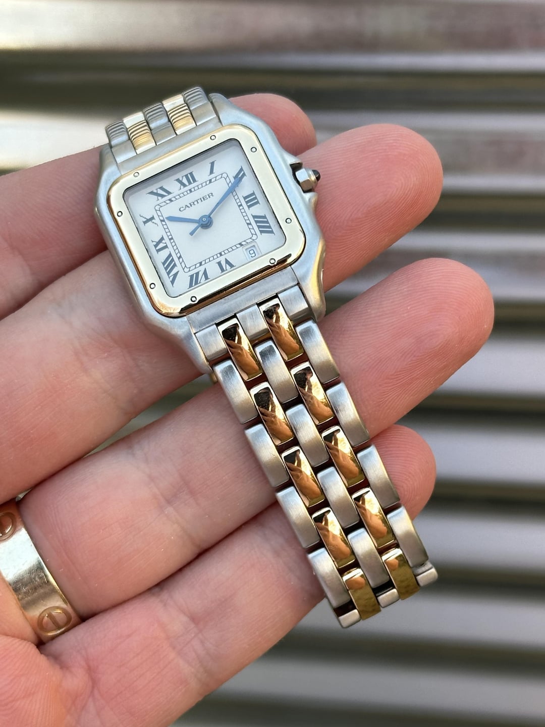 Here is a two-tone Cartier Panthere, 27mm x 36mm. This is a really nice example of a panther, and it’s ready to be enjoyed or given as a gift. Reference number: W25028B6 Year: 1994 COMES with BOX & PAPERS, as well as the original purchase receipt. (see second picture for everything that’s included) 💰5️⃣0️⃣0️⃣0️⃣+✈️ The watch is in overall excellent pre owned condition- see pics for details. Clean case all around. Free of any major dings or scratches. The 18k gold bezel is nice and clean. No dings.The crystal is free of scratches and chips. It features a cream dial that’s in good shape. No marks on the dial. This is the bigger size so it has a date function, unlike the smaller 22mm model. The 18k 2-row bracelet is in excellent shape. No stretch on the band. Clean 18k gold links and stainless has a clean satin finish. Lots of links on the bracelet so it fits about a 6.75” wrist. Overall really nice example. 💰5️⃣0️⃣0️⃣0️⃣+✈️ We accept Zelle/Wire as payment. Overnight fully insured shipping. I have plenty of references across different platforms so buy with confidence. Follow our instagram @215Watches for daily deals. Thank you for your time [photo album](https://imgur.com/a/Ku5l1eJ) [time stamp](https://imgur.com/a/bx0bb6X)