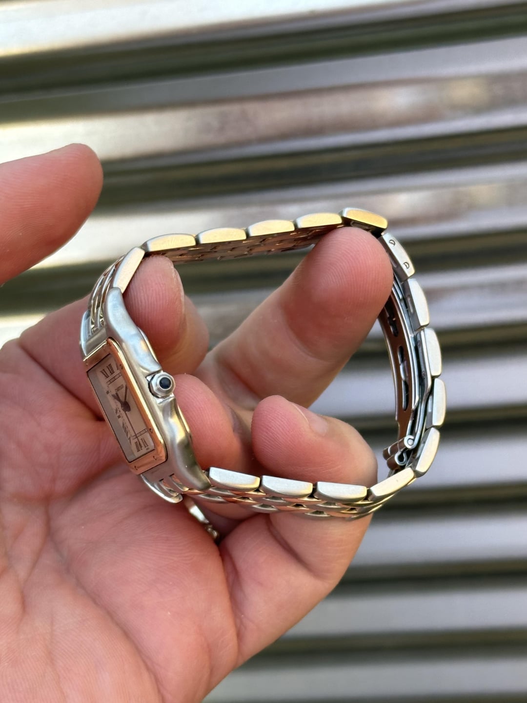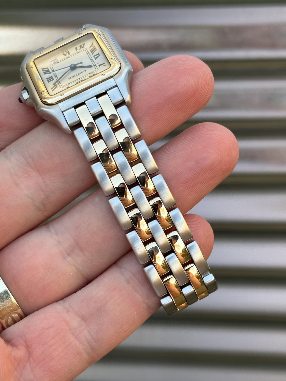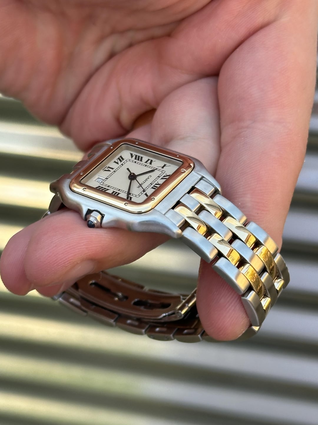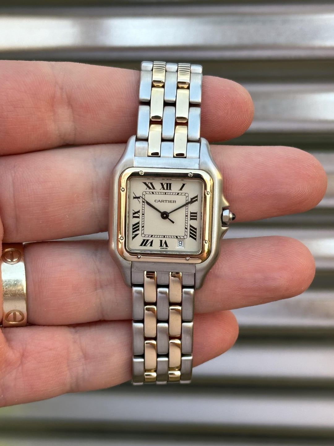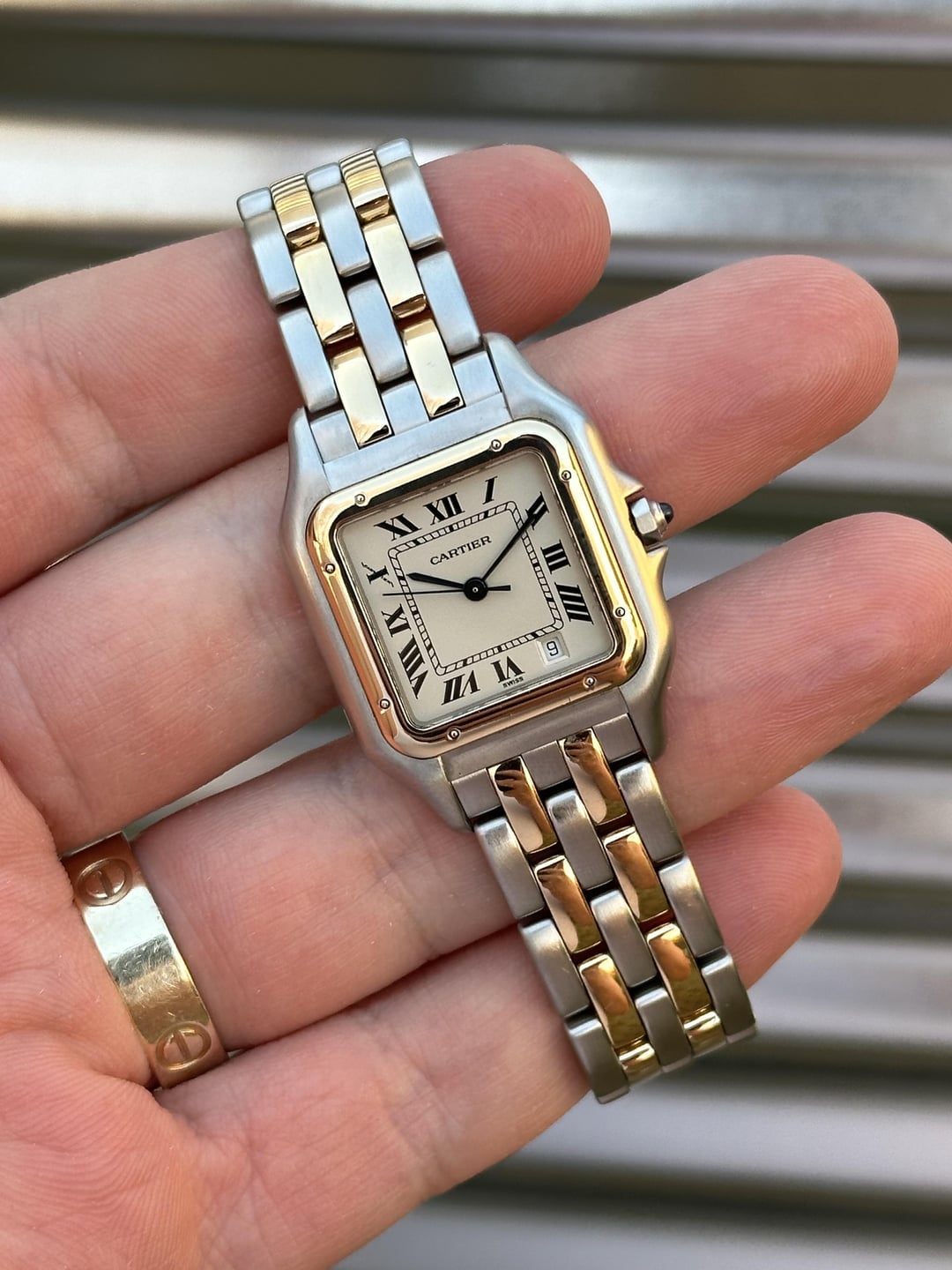 Here is a two-tone Cartier Panthere, 27mm x 36mm. This is a really nice example of a panther, and it’s ready to be enjoyed or given as a gift. Reference number: W25028B6 Year: 1994 COMES with BOX & PAPERS, as well as the original purchase receipt. (see second picture for everything that’s included) 💰5️⃣0️⃣0️⃣0️⃣+✈️ The watch is in overall excellent pre owned condition- see pics for details. Clean case all around. Free of any major dings or scratches. The 18k gold bezel is nice and clean. No dings.The crystal is free of scratches and chips. It features a cream dial that’s in good shape. No marks on the dial. This is the bigger size so it has a date function, unlike the smaller 22mm model. The 18k 2-row bracelet is in excellent shape. No stretch on the band. Clean 18k gold links and stainless has a clean satin finish. Lots of links on the bracelet so it fits about a 6.75” wrist. Overall really nice example. 💰5️⃣0️⃣0️⃣0️⃣+✈️ We accept Zelle/Wire as payment. Overnight fully insured shipping. I have plenty of references across different platforms so buy with confidence. Follow our instagram @215Watches for daily deals. Thank you for your time [photo album](https://imgur.com/a/Ku5l1eJ) [time stamp](https://imgur.com/a/bx0bb6X)
