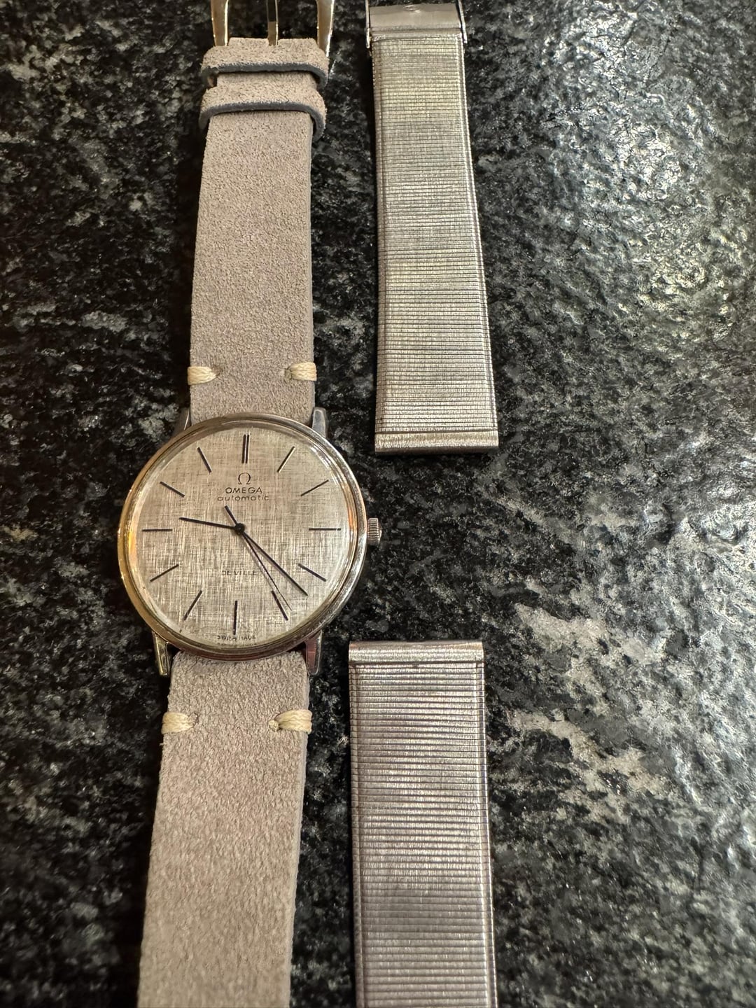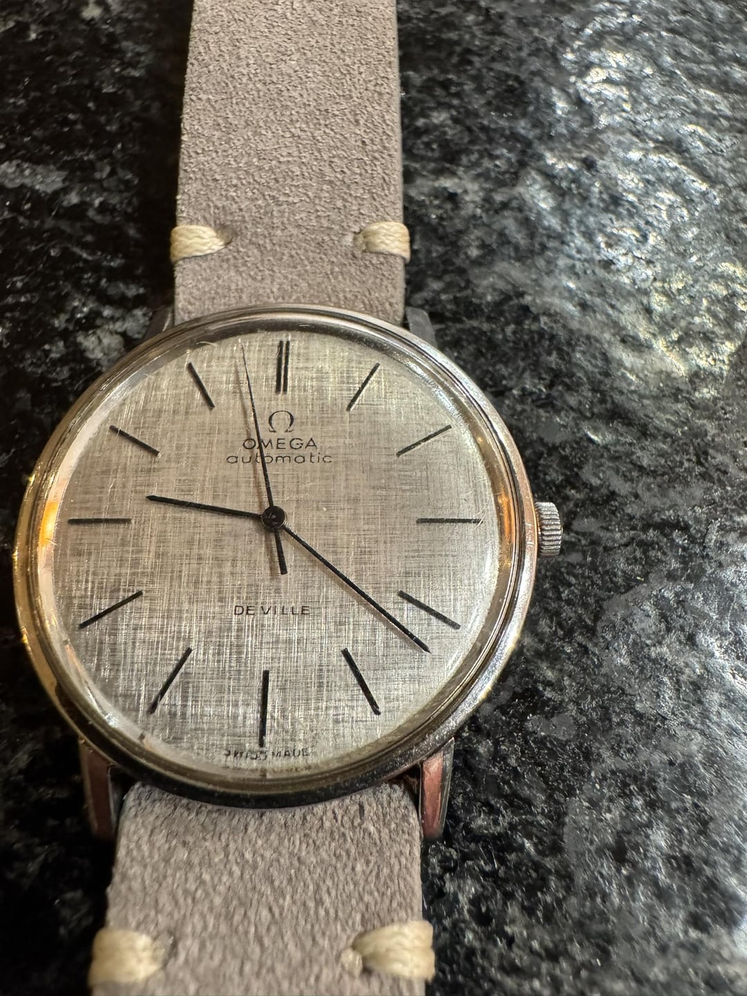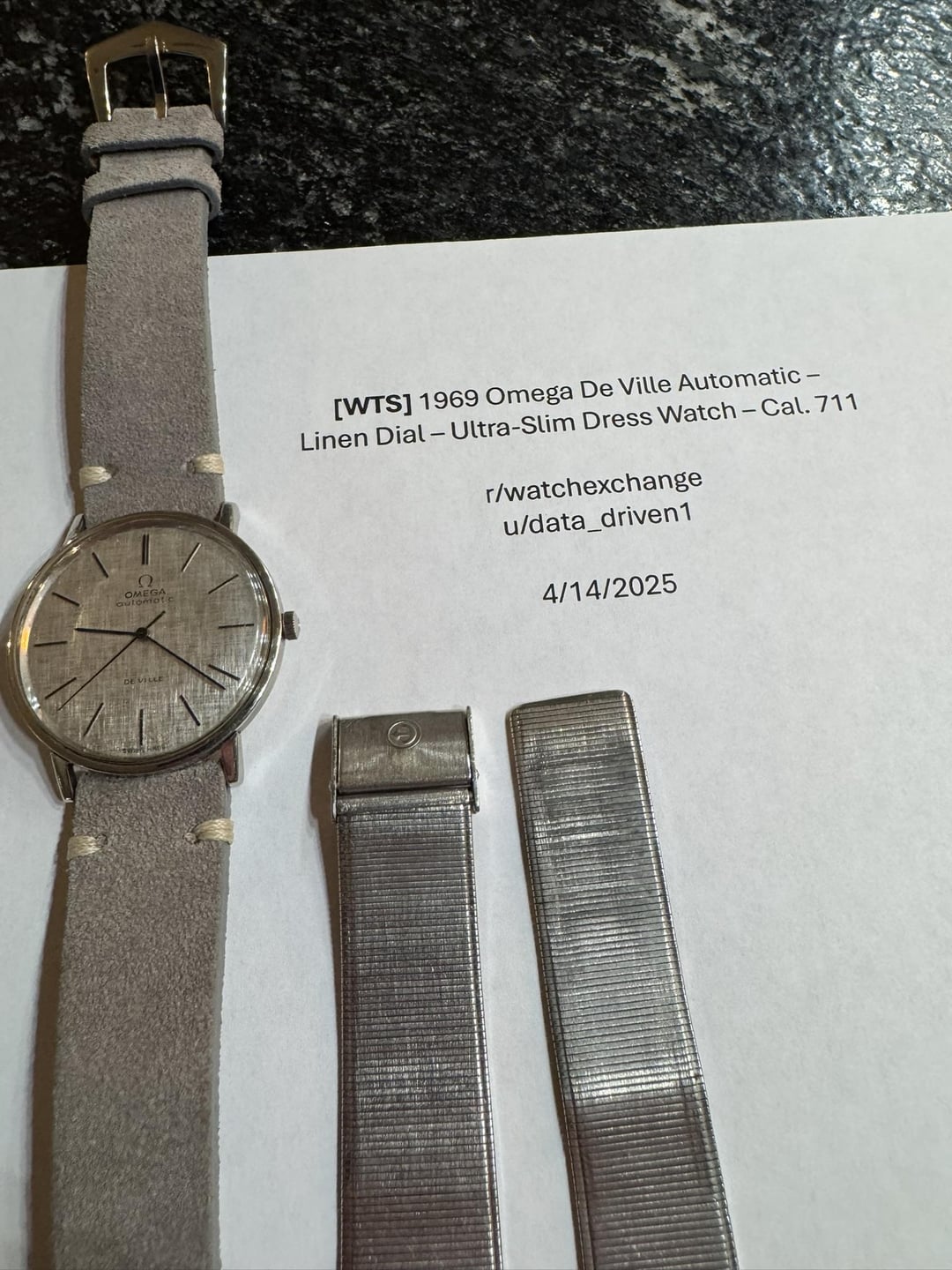 Happy Monday r/watchexchange! Up for sale is a beautiful vintage **Omega De Ville Automatic**, featuring a rare **silver linen-textured dial** and ultra-thin profile. The dial is original and gorgeous in the light — a fine example of Omega’s 60s–70s dress watch craftsmanship. I bought this recently on watchex. LOVE the watch, but realized when I got it that it is really close in appearance to another vintage Omega I have (1971 silver-dial Seamaster). I am trying to be measured about the number of watches in my collection – so having two vintage Omega’s that close in appearance convinced me to let one go. Feel free to DM with any questions! **Details**: * **Model**: Omega De Ville Automatic * **Movement**: Cal. 711 ultra-thin automatic (runs well) * **Case**: Stainless steel, approx. 34mm * **Dial**: Silver linen texture, applied markers * **Crystal**: Acrylic, clean * **Strap** x2: Vintage stainless mesh bracelet (likely aftermarket but suits the style) + Grey Suede strap I added from Milano Straps * **Condition**: Very good vintage condition. Dial and hands are clean, case has light wear. Keeps time reliably. No quickset date. * **Includes**: Watch head and two straps - no box/papers **Price:** $600 shipped (USA) **Payment:** PayPal F&F or Zelle **Shipping:** USPS Priority – CONUS only
