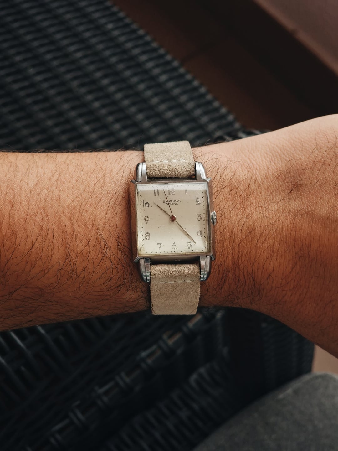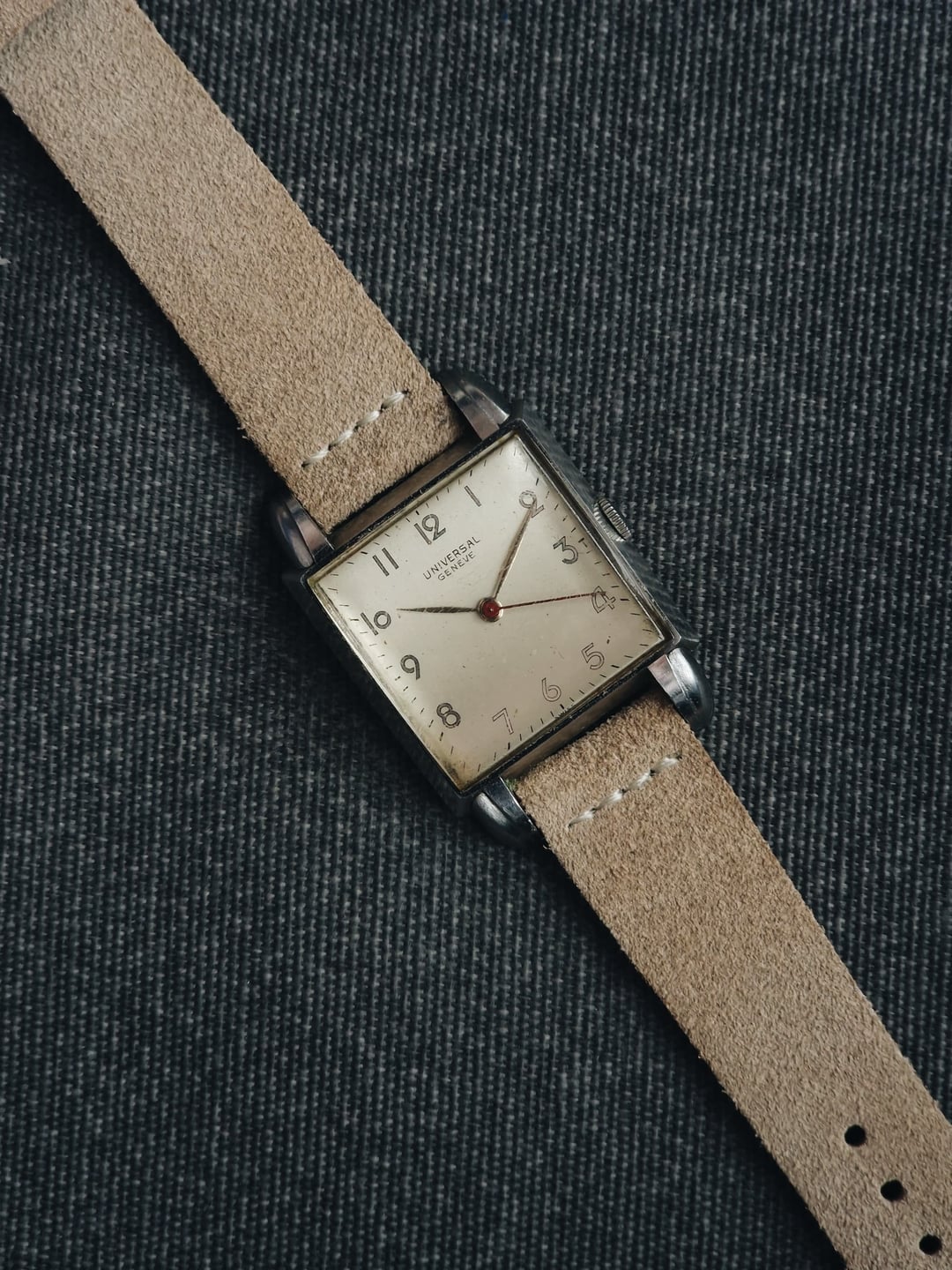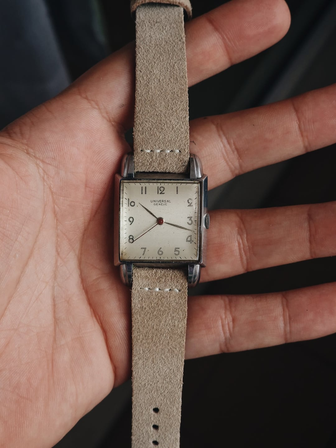 Probably one of the coolest (and rarest) tank-style watches I’ve seen by Universal Genève. It features a stunning case with beefy lugs, a crisp white/champagne dial, and a gorgeous thick crystal for a ton of vintage charm. Just look at it – it’s huge! Inside the Enversteel case is the UG caliber 265, a workhorse 17-jewel movement from the 1940s. According to the serial number in the caseback, the watch was made in 1945. Looks great for a piece that’s 80 years old, don’t you agree? **Condition:** Very good for its age. No major scratches or scuffs. The crystal has some wear, but replacing it would be sacrilegious. The dial also has some patina. Please see the pictures for a better description. **Case Size:** 27 x 39.2mm Enversteel stainless steel case with a thickness of 6.0mm (10.5mm if you count the crystal) and a lug width of 16mm. **Movement:** Universal Genève 265, manual wind, 17 jewels. I don’t know its service history, but everything is working as it should. **Price:** Asking $650. Please add $20 for worldwide shipping. Payment methods include Wise, ACH transfer, Revolut, Bitcoin (On-Chain or Lightning), or PayPal G&S for buyers with solid references. Add +6% for currency conversion fees on the latter. I’m located in Portugal, but worldwide shipping isn’t an issue. Established seller with over 220 transactions – buy with confidence! Make sure to follow me on Instagram (@daily.worn) to check out the newest additions. [Pictures](https://imgur.com/a/OuP6dGg) [Timestamp](https://imgur.com/a/6dLEneH)