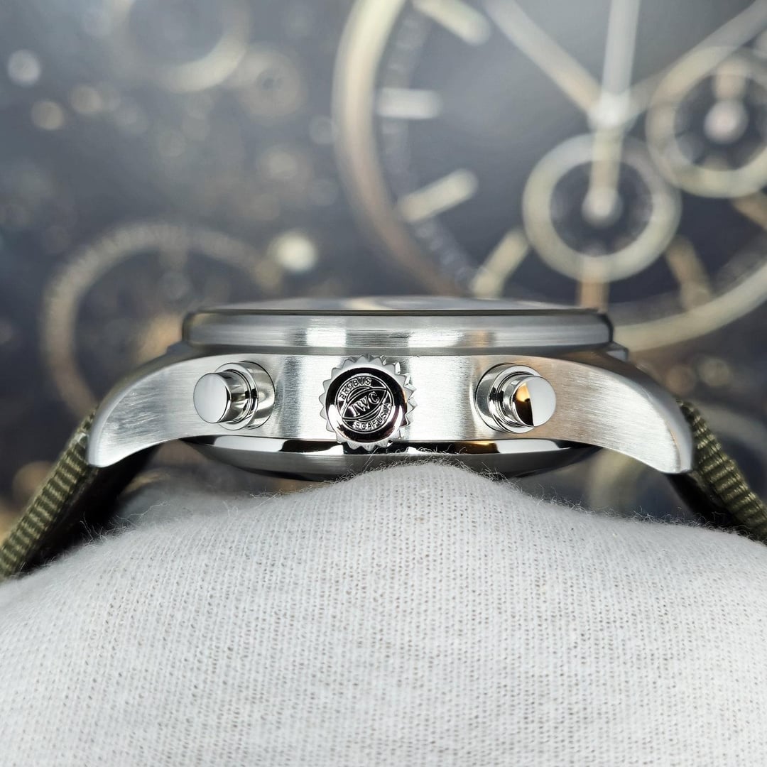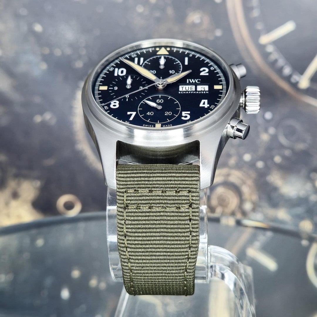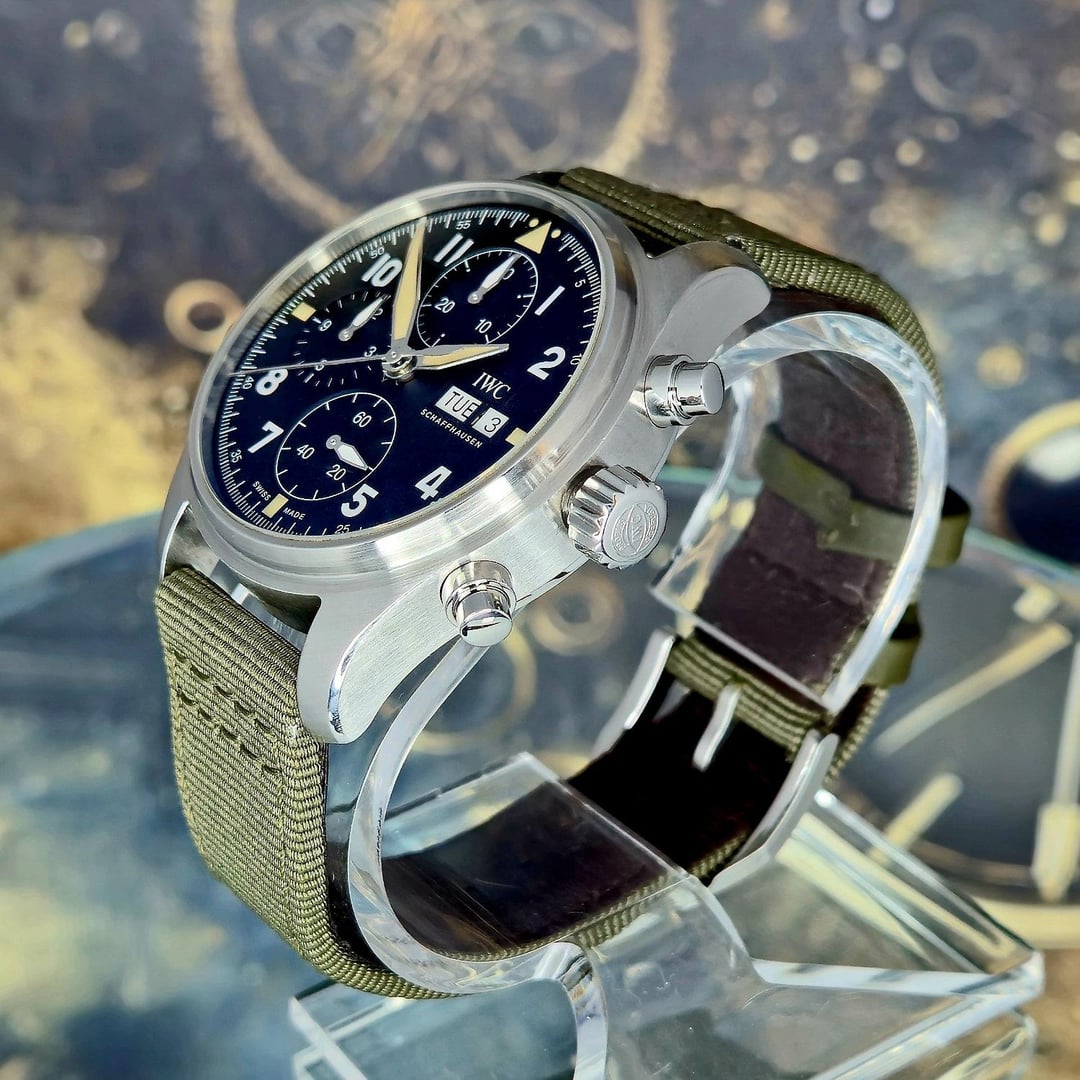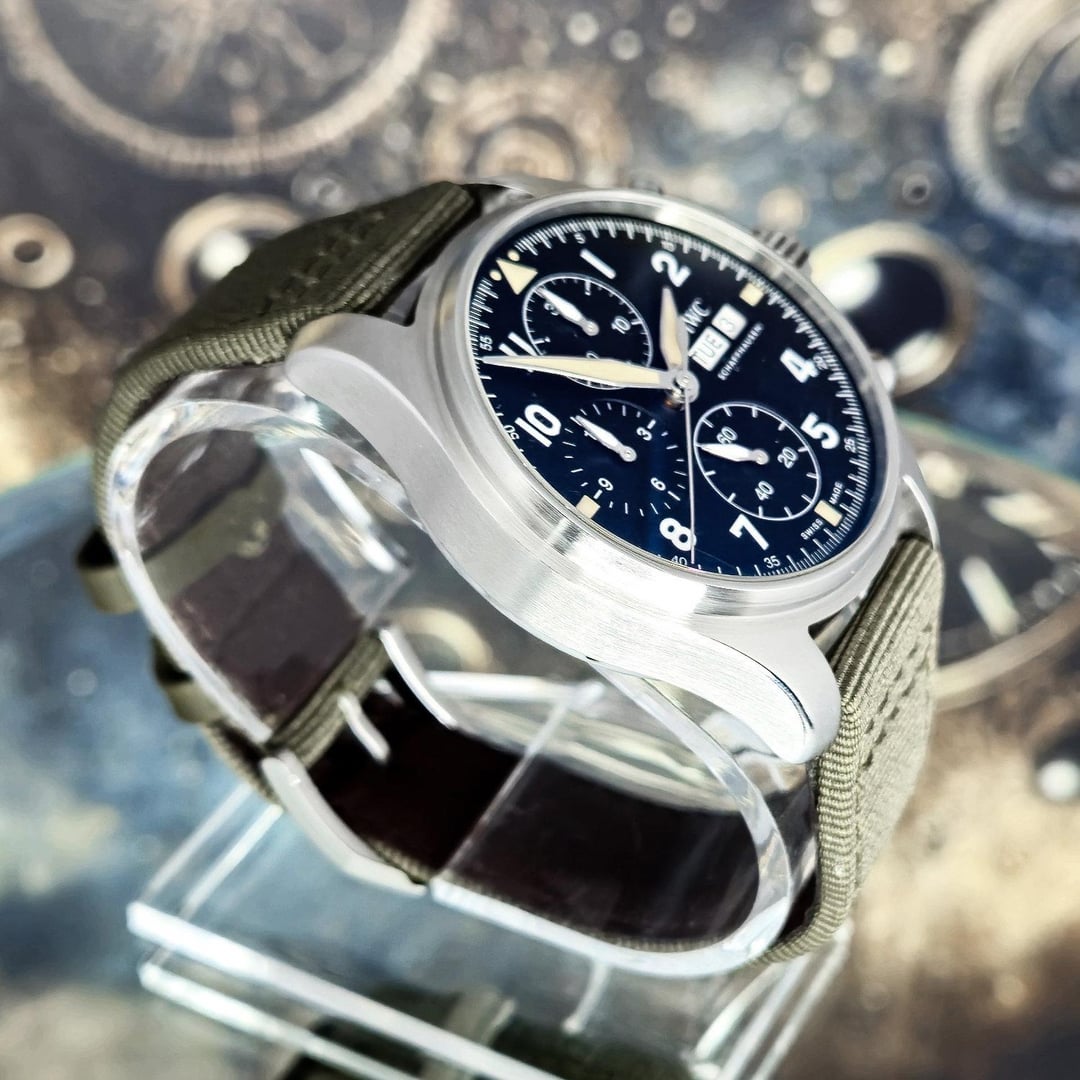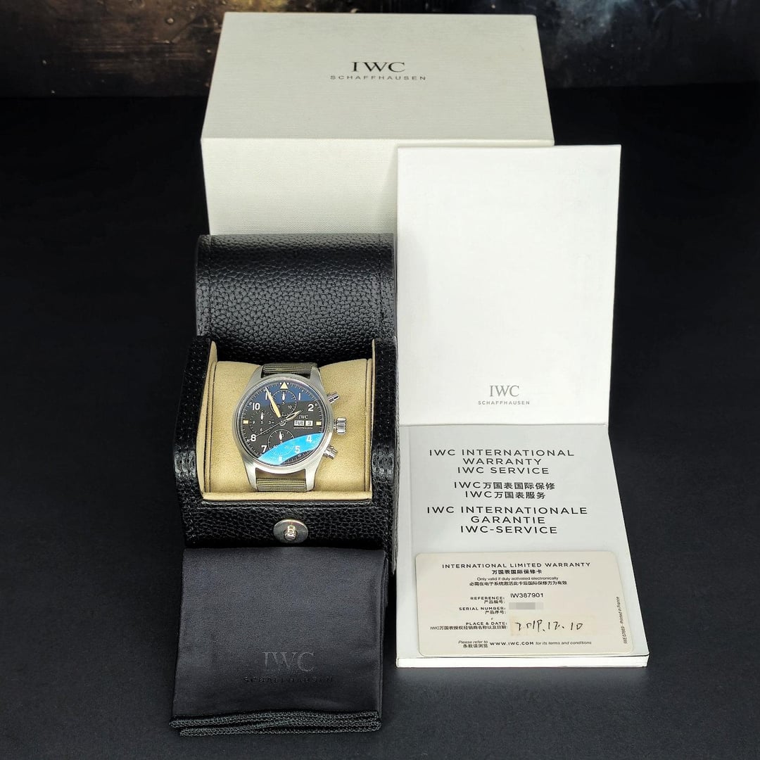 **PRICE:** $3997 + Label \---------------------------------------- **INCLUDES:** Original inner and outer boxes Warranty card Manual Cleaning cloth Bonus New leather travel case Additional brown leather strap shows wear \---------------------------------------- **CONDITION:** Excellent condition. The watch functions flawlessly and has been tested on a timegrapher. \---------------------------------------- **DESCRIPTION:** Model: IW387901 Case Diameter: 41.0 mm Case Material: Stainless steel Bezel: Fixed stainless steel Dial Color: Black with luminescent Arabic numerals Crystal: Sapphire, convex, antireflective coating on both sides Movement: Automatic, IWC-manufactured 69380 calibre Power Reserve: 46 hours Functions: Chronograph, day and date display, small hacking seconds Water Resistance: 6 bar (60 meters) Strap: Green textile strap with stainless steel buckle \---------------------------------------- 120-Day Seller Warranty on the internal movement of the watch. \---------------------------------------- **PAYMENT and SHIPPING:** Wire Transfer, Zelle, ACH FedEx Next Day Insured Shipping Timestamp: [https://imgur.com/llpto5M](https://imgur.com/llpto5M) I can easily be found through a Google Search. Over 40 deals done through FB, eBay, and Chrono. Strong referrals. IG coastaltimepieces\_usa
