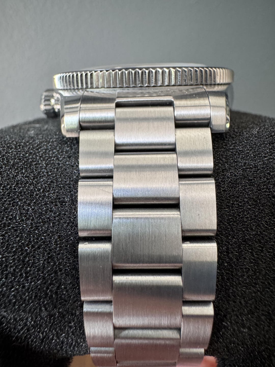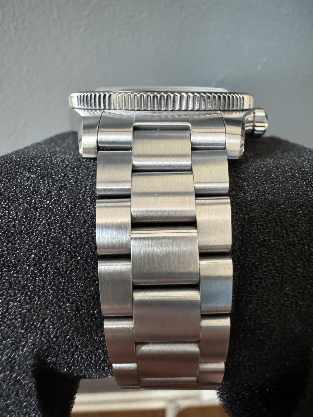 Available is a Traska Freediver in Charcoal Black (no date), a robust dive watch presented as a full kit in excellent condition. • Condition: Excellent • Includes: Full kit (box, papers, bracelet) • Price: $625 shipped CONUS • Payment: Zelle preferred Specifications: • Case: 40.5mm diameter, 10.5mm thick, 48mm lug-to-lug; 316L stainless steel with scratch-resistant coating; screw-down crown • Movement: Miyota 9039 automatic, 42-hour power reserve • Water Resistance: 200m • Crystal: Boxed double-domed sapphire with inner AR coating • Bezel: 120-click unidirectional, ceramic insert • Bracelet: 20mm oyster-style, tapers to 16mm, quick-adjust clasp • Dial: Matte black, applied indices, BGW9 lume For more details, refer to the Traska website: traskawatch.com
