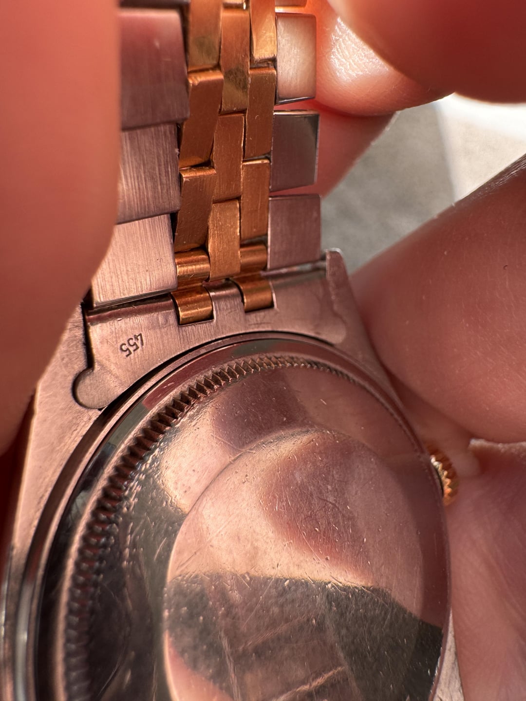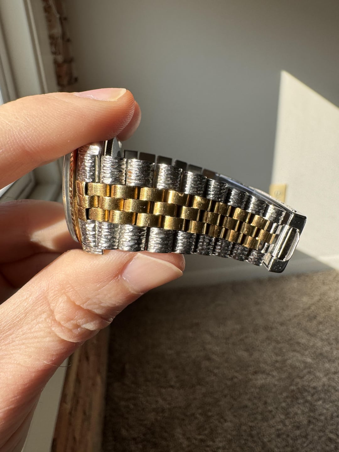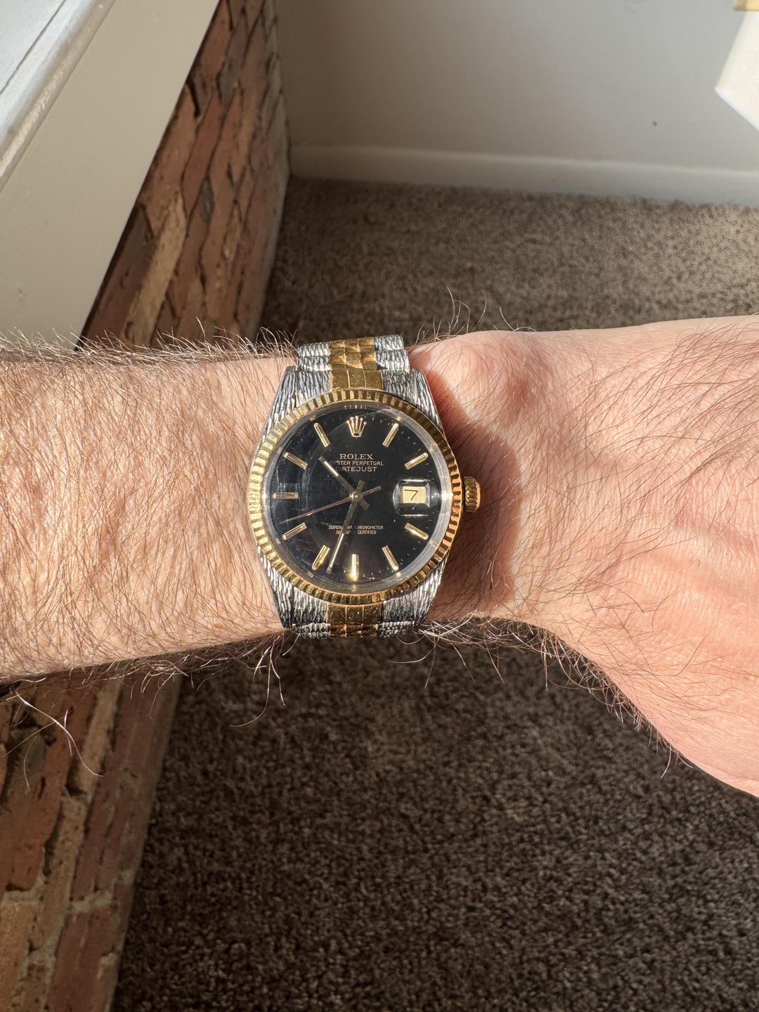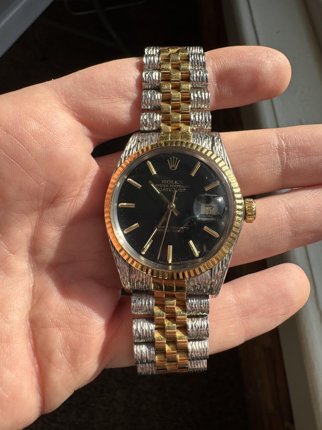 Hey everyone! Today I’m listing something that doesn’t show up very often. This is no ordinary 1985 Datejust. This Rolex pretty much screams 80’s. This 16013 was confirmed to be originally retailed by John Bull, a jeweler in the Bahamas. In fact, the person that sold this to me, a trusted friend and watchmaker, ended up traveling to their location, which is still open in Nassau, and confirmed that the numbers and finish quality do indeed match up to the time that this was factory-ordered. For those who don’t know, John Bull had received a very limited number of Submariners that ended up with this finish: 50 to be exact. To be able to directly act upon the finish of a Rolex is essentially unheard of, especially today. Günter Miethe, the watchmaker for John Bull, was tasked with making these pieces come to existence. After the limited 50-piece run, a few select clients were able to order the model of their choice with Günter’s unique finish. This Datejust is one of them. A few GMT-Masters and Daytonas have been auctioned off by the likes of Phillips and Monaco Legend Auctions, each bringing a strong five-figure hammer price. This piece features a black dial that has started to patina into a stunning, deep chocolate hue in sunlight. Being a later 16013, the gold on this is 18k. Another added benefit is its quickset date feature! It is currently running at an exceptional \~ -2 s/per day based on my observations, although YMMV. About 2 years ago the bracelet was out to Mark Sirianni, AKA “The Watch Doctor” and he was able to repair the bracelet stretch to the point where there is very little flex. This watch has not been polished to my knowledge and retains very sharp lugs. The acrylic crystal was replaced about 2 years ago with a NOS OEM crystal and is still in fantastic condition. Apart from that, nothing else has been done to change the original look of this watch. The goal with this piece was to get it back to 100% daily driver condition, while changing as little as possible in regard to aesthetic aspects. This piece really needs to be seen in the metal to fully appreciate its appeal. I’m generally not a fan of two-tone watches, but this one just hits different! In the sun it really shines and the finish adds a little 'je ne sais quoi' to its appeal. It’s by far the watch that gets the most double takes and questions from discerning eyes! — REFERENCE: 16013 DATE: Serial dates this to 1985 CONDITION: See pictures for condition. The cool thing about this remarkable finish is that it really doesn’t show scuffs or scratches. There are a few expected scratches on the clasp and the polished sides of the case, but besides that it’s pretty clean! MOVEMENT: 3035 automatic Swiss-made Rolex movement. BRACELET: Two-tone jubilee bracelet with authentic John Bull finish. Aside from the links pictured, it also comes with one extra link. (Obviously, links can’t be purchased for this bracelet as it’s one of a kind.) The bracelet was recently restored by Mark Sirianni, AKA “The Watch Doctor", so it has very minimal stretch, especially for a 1985 jubilee! ACCESSORIES: Watch only. PRICE: I’m asking a very fair $4975 OBO which will include fully insured, 2-Day FedEx shipping anywhere in the CONUS. PAYMENT: Wire transfer or crypto preferred. Sale only, no trades. TIMESTAMP: [https://imgur.com/a/V4whspP](https://imgur.com/a/V4whspP)