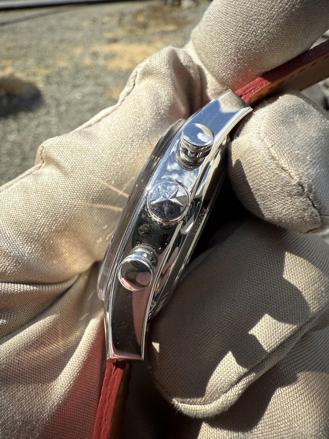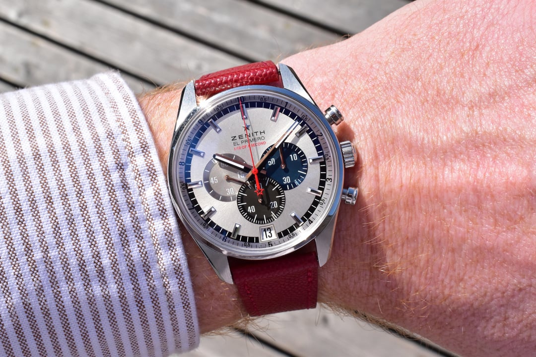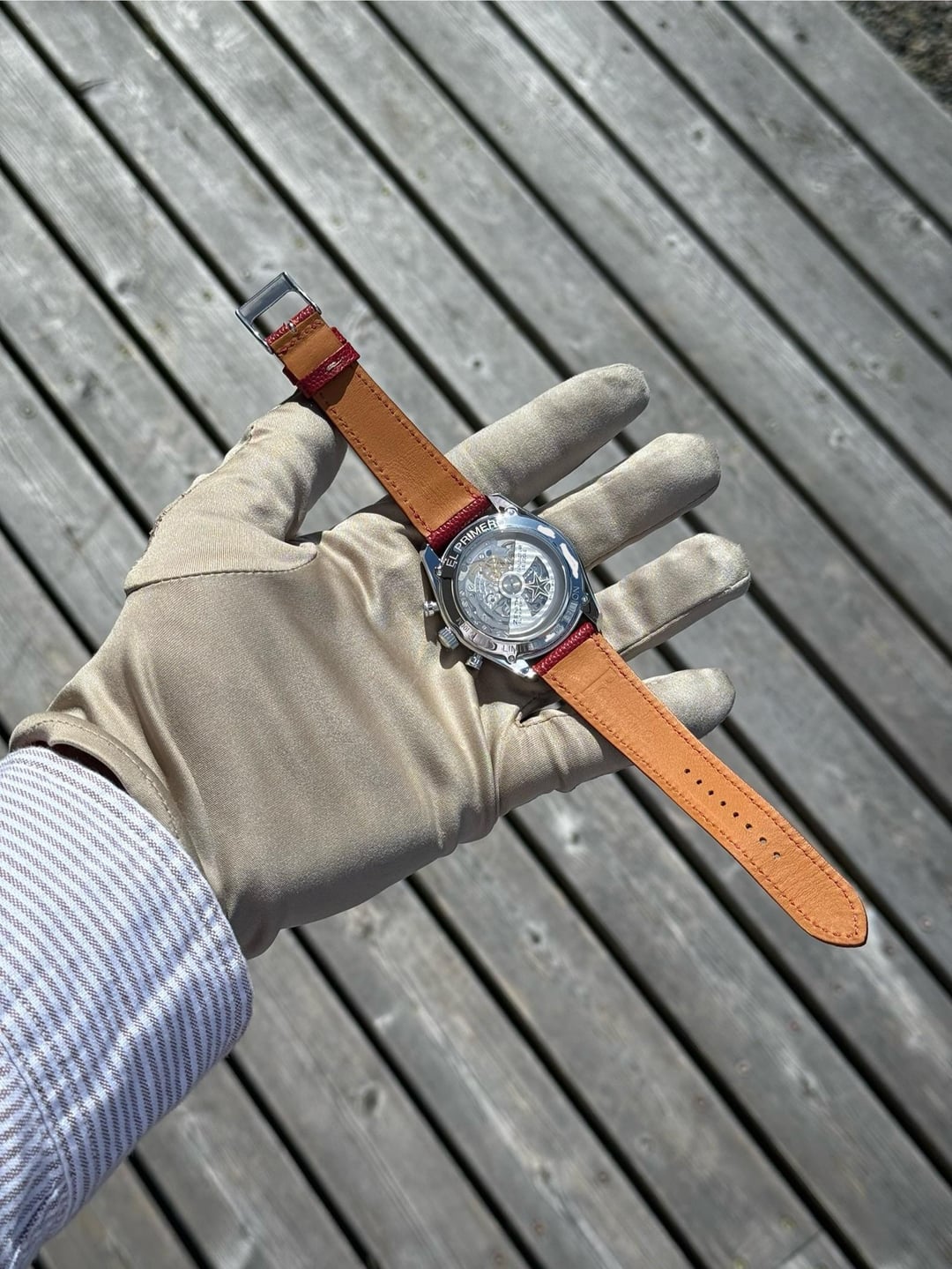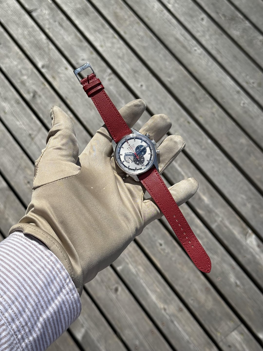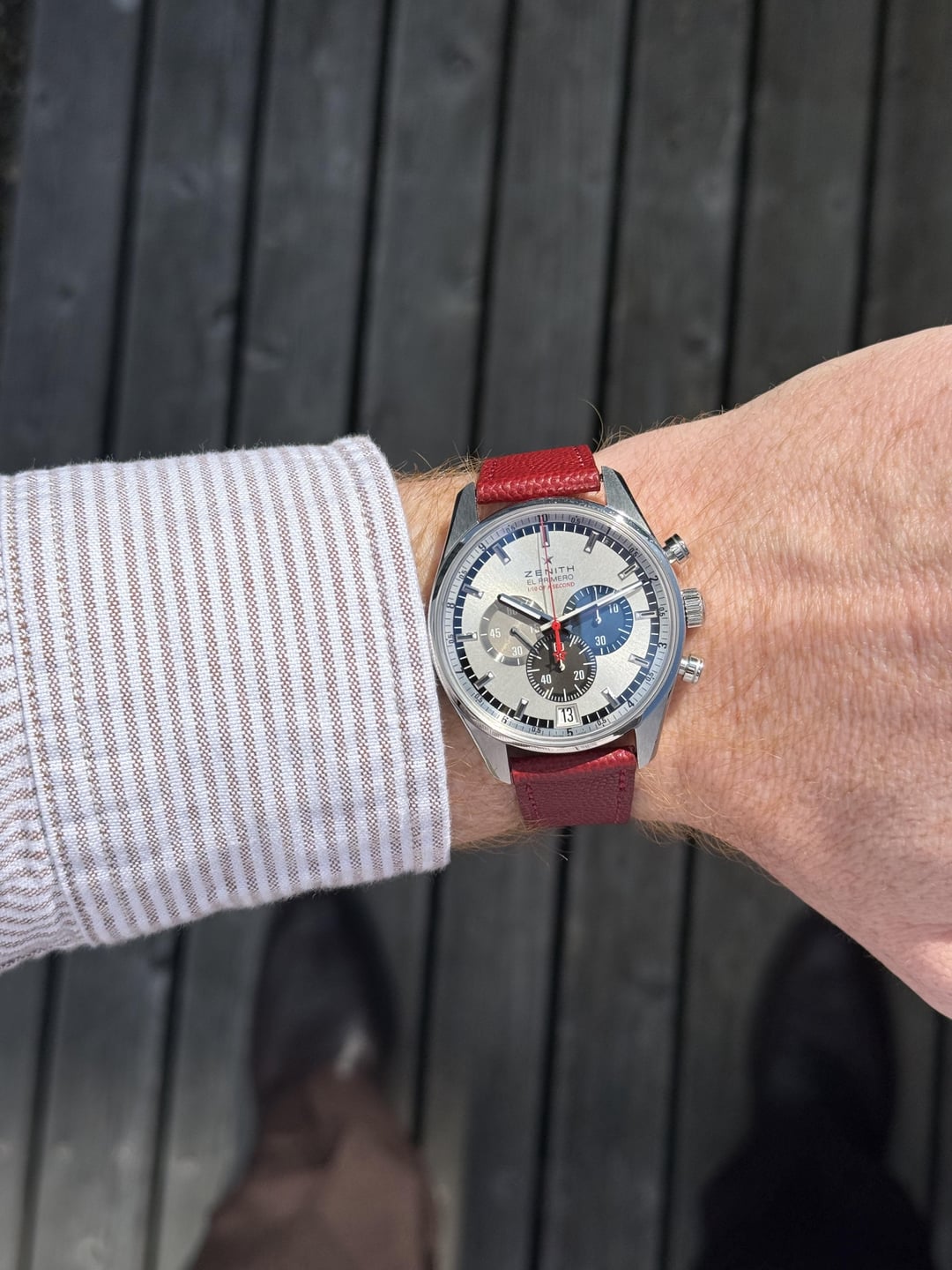 Feeling like Mr wonderful on this red strap. This one is going to be red hot for the summer! Model: El Primero Striking 10th Ref# 03.2041.4052/69.M2040 Case Material: Stainless Steel Case Dimensions: 42mm Bezel: Stainless Steel Bezel Dial: Silver Dial Band Material: Aftermarket Red & A 2nd Brown Leather Strap. With Original Buckle Max Wrist Size: 7.75 in. Original Purchase Date: December 2014 Movement: Automatic, Mechanical Accessories: Box & Card Price: $5,675 shipped! Bank wire price. Can take cards for an added fee. WA Residents subject to sales tax. Email: [email protected]