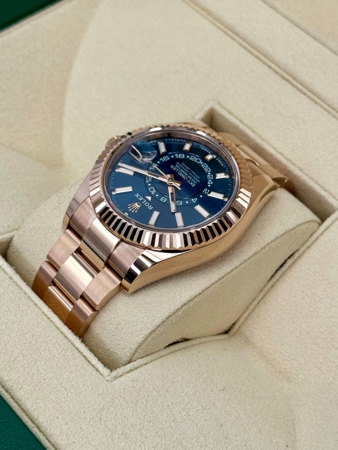 🔵NEW 2025 Rolex Sky-Dweller 42mm 336935 Everose Gold with Oyster Bracelet and Blue Dial 🔵TRADE or SELL us your luxury watch, all brands considered. Message me details. **Includes the following:** ✔️Original Rolex Double boxed ✔️Box and Papers - Yes ✔️Warranty card dated 2025 ✔️5 year manufacturer warranty ✔️Manual and Warranty Booklets ✔️Green and White Hang Tags included ✔️Size: 8.0inch wrist (Full Links) ✔️Watch is BRAND NEW/UNWORN ✔️Trades welcome ✔️Appraisal included Business Name: **My Watch LLC** LOCATION: Oak Park, Michigan ✔️[MyWatchLLC.com](http://mywatchllc.com) for current inventory ✔️Google Business Listing [https://g.co/kgs/Cmd6FPW](https://g.co/kgs/Cmd6FPW) ✔️Business Hours M-F 9-6 ✔️Facetime/Video chat/calls welcome to view the watch interested. ✔️Contact: 248-422-0909 via text or call for quickest response. 🟢TERMS: Visit [MyWatchLLC.Com](http://mywatchllc.com) for payments accepted 🟢REFERENCES/REVIEWS: We are well reviewed on all platforms from google, trust pilot, rolexforums, additionally we have 300+ reference in multiple FaceBook watch groups, reference checks welcome. 🟢SHIPPING: If you are not local, we offer Fully Insured FedEx overnight shipping in the USA for a fee. International shipping available. [https://mywatchllc.com/products/rolex-sky-dweller-42mm-336935-rose-gold-blue-dial](https://mywatchllc.com/products/rolex-sky-dweller-42mm-336935-rose-gold-blue-dial)