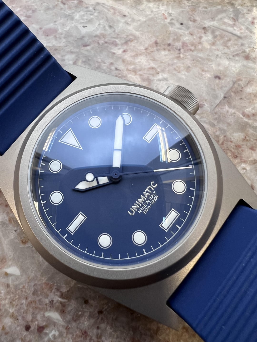 Hey Watchexchange! Unimatic refines its utilitarian field watch formula with the U2S-T-MP, a sandblasted Grade 2 titanium evolution of the Modello Due. At just 45g without the strap, it’s super light but visually grounded thanks to its monolithic matte finish and no-nonsense silhouette. The dial is a nice shade of blue and the case remains a sleek and easily wearable 38.5mm, now with 300m water resistance and drilled lugs for strap-swapping versatility. Inside ticks the ever-reliable Selitta SW200-1 and the blue lume from the Super Lumina BGW09 is a nice touch. **Condition:** Overall excellent. Keeping good time. **Scope of delivery:** Inner box, papers, additional textile strap, and a one-year after market warranty. **Specs:** Reference number: US2-T-MP Case size: 38.5mm Lug-to-lug: 47.5mm Case thickness: 11.6mm + 2.7mm for the domed sapphire Water resistance: 300m **Price:** $650 shipped CONUS **Methods of payment:** Zelle is preferred; Venmo/CashApp/PayPal F&F only with transaction history **Trades:** Not at this time. **References:** Hundreds of successful transactions in watch trading. See my eBay account under the same name. Many references in Facebook groups, watch forums, and on WUS. **Timestamp:** https://imgur.com/a/7OqlqE8 **Photo album:** https://imgur.com/a/BZ0a96o