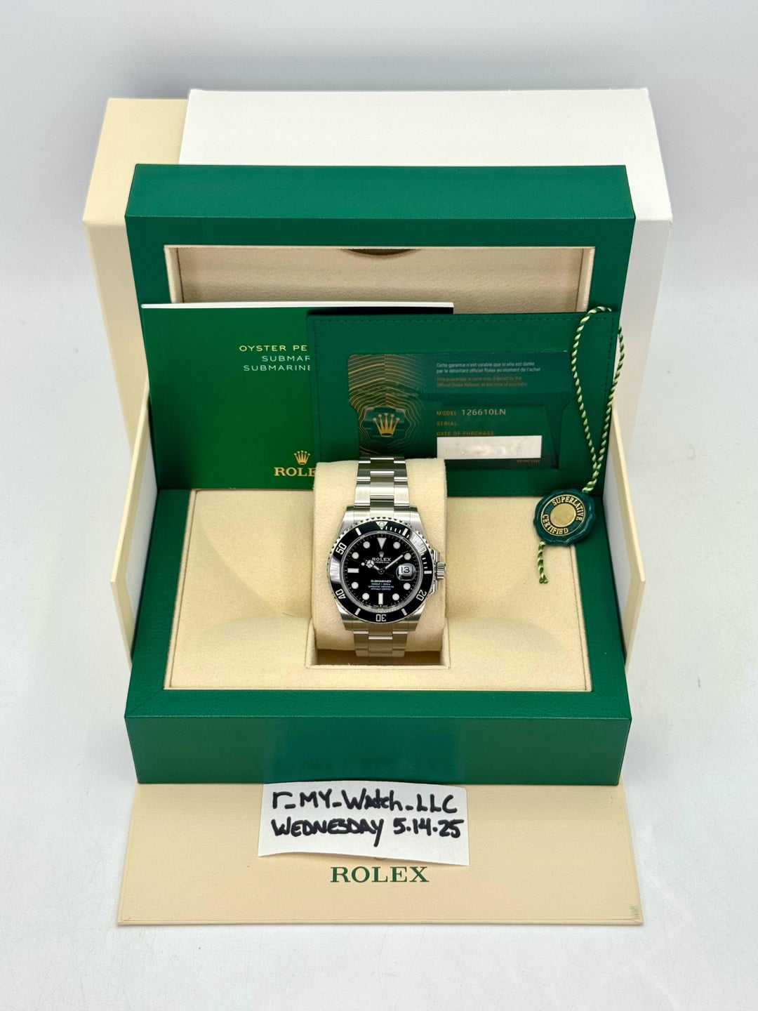 🔵2023 Rolex Submariner Date 41mm 126610LN Stainless Steel Black Dial Oyster Bracelet with Glidelock and Black Ceramic Bezel 🔵TRADE or SELL us your luxury watch, all brands considered. Message me details. **Includes the following:** ✔️Original Rolex Double Boxed ✔️Box and Papers - Yes ✔️Warranty card dated 2023 ✔️5 year manufacturer warranty ✔️Manual and Warranty booklets ✔️Green Hang Tag included ✔️Material: Oystersteel ✔️Size: 8.25inch wrist (Full Links) ✔️Watch is in excellent overall condition. Please see photos for details. ✔️Trades ;welcome ✔️Appraisal included  Business Name: **My Watch LLC**  LOCATION: Oak Park, Michigan ✔️[MyWatchLLC.com](http://mywatchllc.com) for current inventory ✔️Google Business Listing [https://g.co/kgs/Cmd6FPW](https://g.co/kgs/Cmd6FPW) ✔️Business Hours M-F 9-6 ✔️Facetime/Video chat/calls welcome to view the watch interested.  ✔️Contact: 248-422-0909 via text or call for quickest response. 🟢TERMS: Visit [MyWatchLLC.Com](http://mywatchllc.com) for payments accepted 🟢REFERENCES/REVIEWS: We are well reviewed on all platforms from google, trust pilot, rolexforums, additionally we have 300+ reference in multiple FaceBook watch groups, reference checks welcome. 🟢SHIPPING: If you are not local, we offer Fully Insured FedEx overnight shipping in the USA for a fee. International shipping available. [https://mywatchllc.com/products/2023-rolex-submariner-41mm-126610ln-stainless-steel-black-dial-1](https://mywatchllc.com/products/2023-rolex-submariner-41mm-126610ln-stainless-steel-black-dial-1)