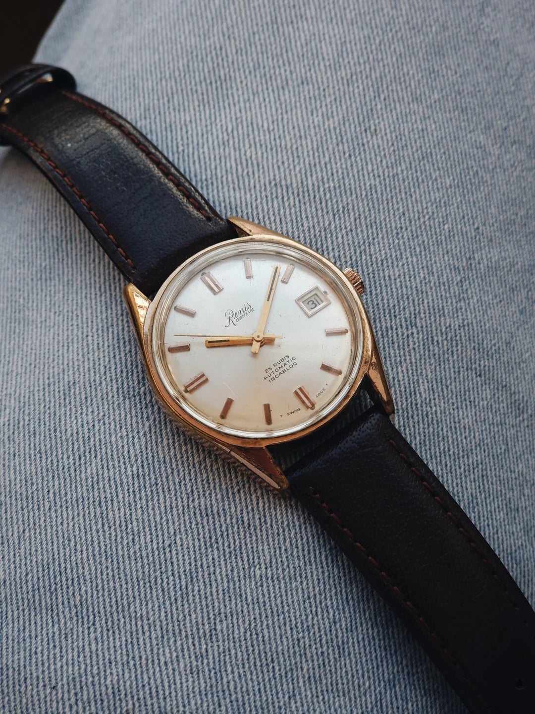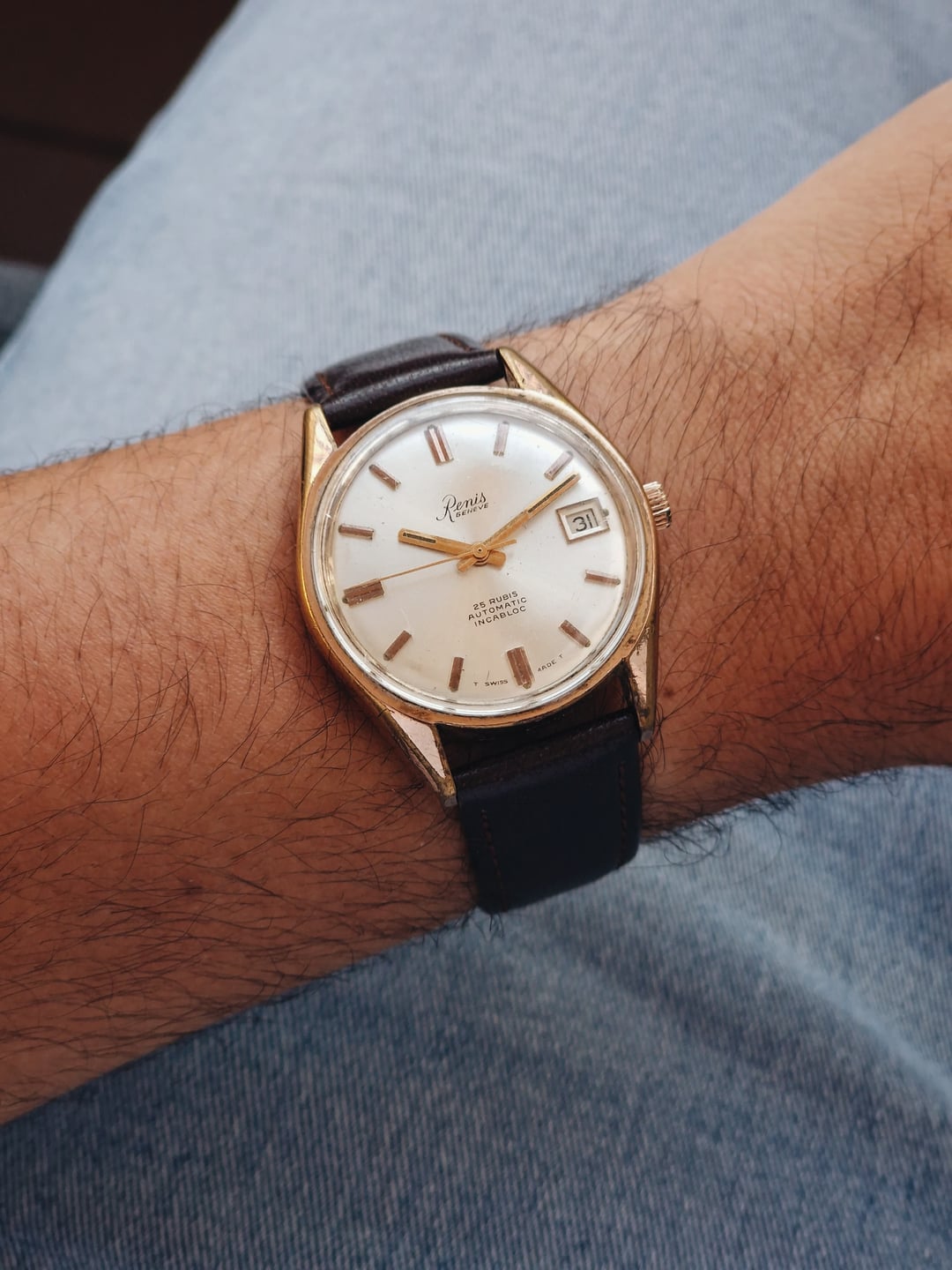 Rénis was an old Swiss brand established in 1958 by Aetos Watch SA. The piece you see here has a solid automatic movement (AS 1906) and a rose gold-plated case. Pretty cool, if you ask me. **Condition:** Okay. The case is losing some of its plating, especially on the lugs and sides. **Case Size:** 35.8 x 40.1mm, with a thickness of 8.9mm. **Movement:** AS 1906, automatic with 25 jewels and a beat rate of 21,600 bph. Service history is unknown, but it works well. **Price:** Asking $45. Please add $20 for worldwide shipping. Payment methods include Wise, ACH transfer, Revolut, Bitcoin (On-Chain or Lightning), or PayPal G&S for buyers with solid references. Add +6% for currency conversion fees on the latter. I’m located in Portugal, but worldwide shipping isn’t an issue. Established seller with over 220 transactions – buy with confidence! Make sure to follow me on Instagram (@daily.worn) to check out the newest additions. Feel free to message me if you have any questions. [Pictures](https://imgur.com/a/daGosvg) [Timestamp](https://imgur.com/a/7qtkZSn)