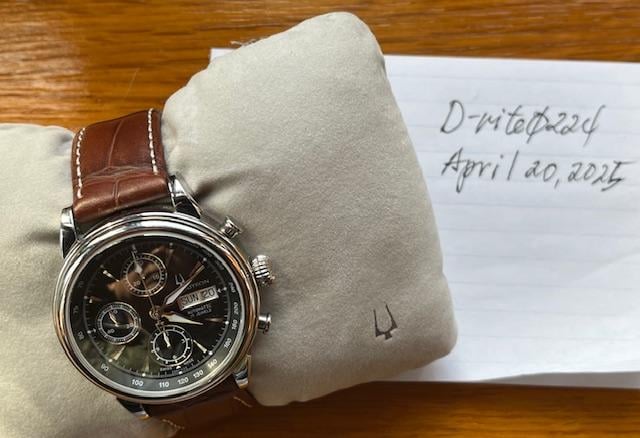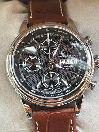 Bulova Accutron Gemini Chronograph Automatic Black Dial Men's Watch - C899183/26C02 Selling my Bulova Accutron Gemini chronograph. Purchased this in May, 2023 as NOS. Wore it several times for special occasions, so it is still in pristine condition. I have not been wearing it lately and am paring down my collection. I wound it a few days ago and it is keeping good time. Full kit with presentation box, outer white box, manual, and blank warranty card. Description from the web: Silver-tone stainless steel case with a brown leather strap. Fixed silver-tone stainless steel bezel. Guilloche texture black dial with silver-tone hands and Arabic numeral hour markers. Minute markers around the outer rim. Dial Type: Analog. Luminescent hands and markers. Day of the week and date display at the 3 o'clock position. Chronograph - three sub-dials displaying: 60 second, 30 minute and 12 hour. Tachymetre scale. Automatic movement, ETA/VALJOUX Cal. 7750 25 jewels Swiss Automatic. Scratch resistant sapphire crystal. Transparent see through case back. Round case shape, case size: 42 mm. Deployment with push button release clasp. Water resistant at 50 meters / 165 feet. Functions: chronograph, day, date, hour, minute, second. Original Bulova brown Alligator style textured leather. Butterfly style ( hidden deployant ) clasp, center opening, with spring release. Accutron Gemini Series. Reduced to $500. Price includes shipping to CONUS .I accept PayPal F&F, Venmo, or Zelle. Please add 4.5% if using PayPal G&S. Please let me know if you have any questions. Comment on this thread first before sending a chat please.