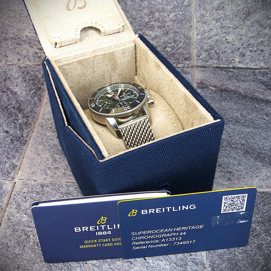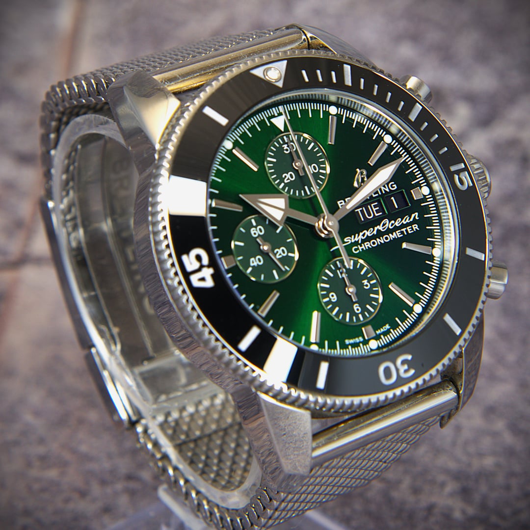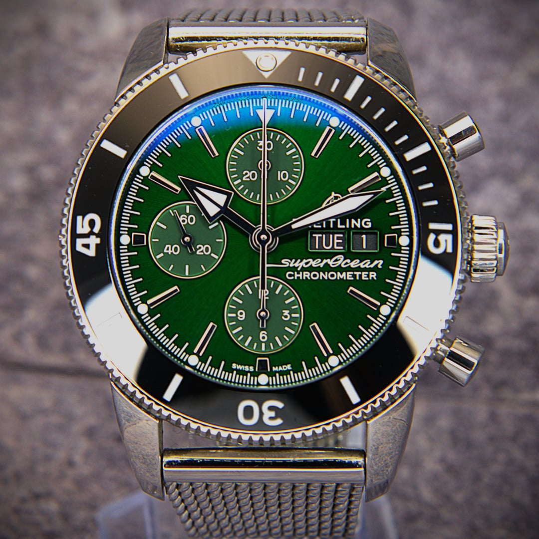 BT Superocean Heritage Chronograph A13313121L1A1 Case: 44mm Condition: Very good condition, showing barely any signs of wear. The sapphire crystal is pristine, and the ceramic bezel insert is flawless. The case and bracelet exhibit only the faintest indications of careful handling, if any. It has been handled with the utmost care by its previous owner and presents beautifully on the wrist. Accessories: Original BT box, Instruction Manual, and International Warranty Card Experience the perfect fusion of elegance and performance with the Breitling Superocean Heritage Chronograph A13313121L1A1. A true icon of dive watch legacy, this timepiece seamlessly blends Breitling’s rich maritime heritage with cutting-edge technology and breathtaking design. The captivating green dial, evoking the spirit of oceanic adventure, offers unparalleled legibility and a distinct presence on the wrist. $4️⃣7️⃣5️⃣0️⃣ + 🏷️ MSRP: \~7.1k Shipping available to anywhere in CONUS. Shop with confidence, many references available and authenticity guaranteed! NY residents subject to sales tax without resale certificate IG: royaltimepiecesltd Timestamp: [https://imgur.com/pyE7ZeG](https://imgur.com/pyE7ZeG)