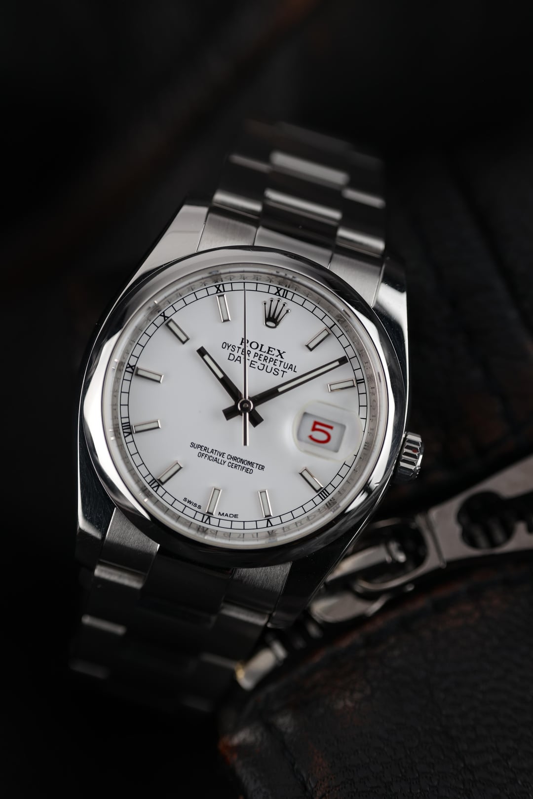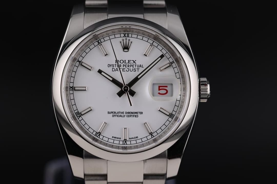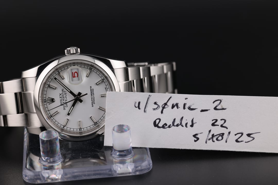 This is a 2011+ Rolex Datejust 116200, featuring a clean white dial paired with polished baton hour markers and a smooth domed bezel, giving it a sharp and versatile look. Sized at 36mm, this modern iteration of the Datejust maintains the iconic proportions while incorporating updated features, including the solid-link Oyster bracelet with a robust and comfortable clasp. The watch is powered by the Rolex calibre 3135 movement, which is running strong with an amplitude of over 290 degrees, well within healthy parameters and suggesting no immediate need for service. This particular example is from 2011 or later (random serial), with the engraved rehaut and no-hole case, further modernizing the design while keeping the timeless character of the Datejust line. Condition is overall good with minor wear consistent with careful use. Offered as watch only, without box or papers. A well-balanced piece for someone seeking the reliability of a newer Rolex with the classic aesthetic the Datejust is known for. Timestamp: [https://static.wixstatic.com/media/17bf69\_1fd1b87384a3400d923d0afb317787e1\~mv2.jpg](https://static.wixstatic.com/media/17bf69_1fd1b87384a3400d923d0afb317787e1~mv2.jpg) Yours for $5900 via bank wire or Zelle. Have references on WUS, Reddit, TRF, and 100% feedback on eBay. You can reach me via 312-278-3218 / PM / [[email protected]](mailto:[email protected]). Follow me @ [www.timepiecetreasurebox.com](http://www.timepiecetreasurebox.com), on IG @ [timepiece\_treasure\_box](https://www.instagram.com/timepiece_treasure_box/), or on FB @ [Timepiece Treasure Box](https://www.facebook.com/profile.php?id=61566943652417). Thanks for looking.