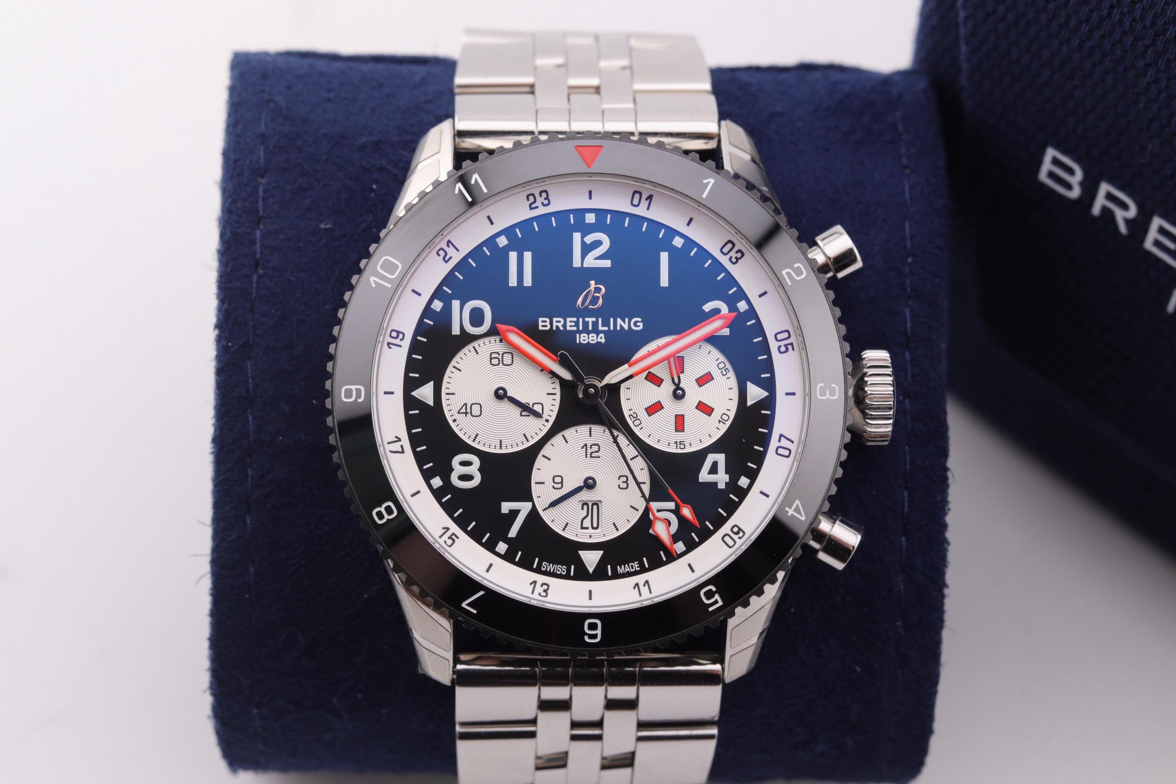 Up for sale is a **Breitling Avi B04 Chronograph GMT 46 Super Mosquito YB0445** Size: 46mm Location: U.S. / Georgia Condition: Excellent condition overall. The sapphire crystal is clean with no scratches or chips. The black dial is clean and free of wear. The stainless steel case, with some factory stickers still attached, shows minimal to no visible wear. Missing the original leather strap, but fitted with a genuine Breitling Bentley Chronomat full-linked bracelet, I would consider this to be an upgrade. Automatic chronograph GMT movement keeping good time with no issues. Full kit with original box and papers, still under warranty. [Pictures](https://www.dropbox.com/scl/fo/mnv3v9fl7trqf5i1a2t1t/AM65cm40pVzwq0OUae78wX8?rlkey=xs8alty7nmj04zrhimw4t8z5s&st=edi9rft6&dl=0) [Timestamp](https://www.dropbox.com/scl/fi/xq22vsyl1j4jd6oy8uyso/IMG_7155.HEIC?rlkey=sjnt7kvtqx1qq4u1asoq8l6k8&st=pdm9axg6&dl=0) **Price: $4999** payment methods accepted are Zelle, Paypal G&S+3.5%(for qualified buyers), and Bank Wire. I will also accept cryptocurrency and silver/gold bullion. I ship within 24hrs of receiving payment. I’m willing to ship almost anywhere with buyer paying shipping Any watch offered can be polished and serviced prior to shipping for an additional cost. Lead time varies. READ BEFORE SENDING TRADE OFFERS: If you send me a trade offer and it has no price or “trade value” it will be ignored. No trades on or for watches under $1k. GA residents may be required to pay state sales tax IG: thewatchtradingpost Please feel free to reach out to me with any questions or concerns at [email protected] or message me privately on here and I’ll respond ASAP. I’m also open to phone calls and FaceTimes during the day. There has been ongoing issues with Reddit chat/messages recently. Email is the fastest way to get into contact with me.