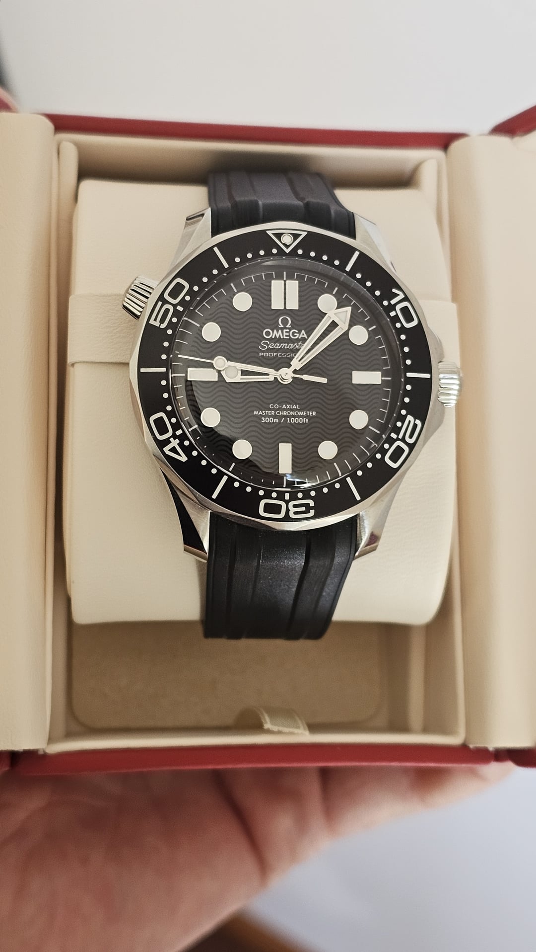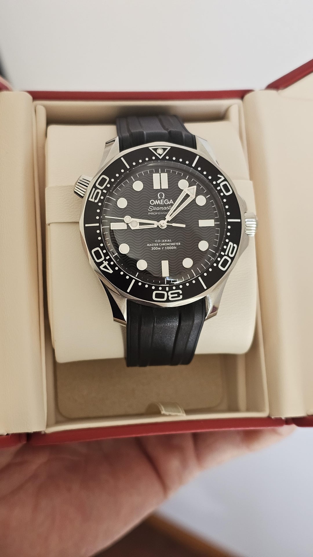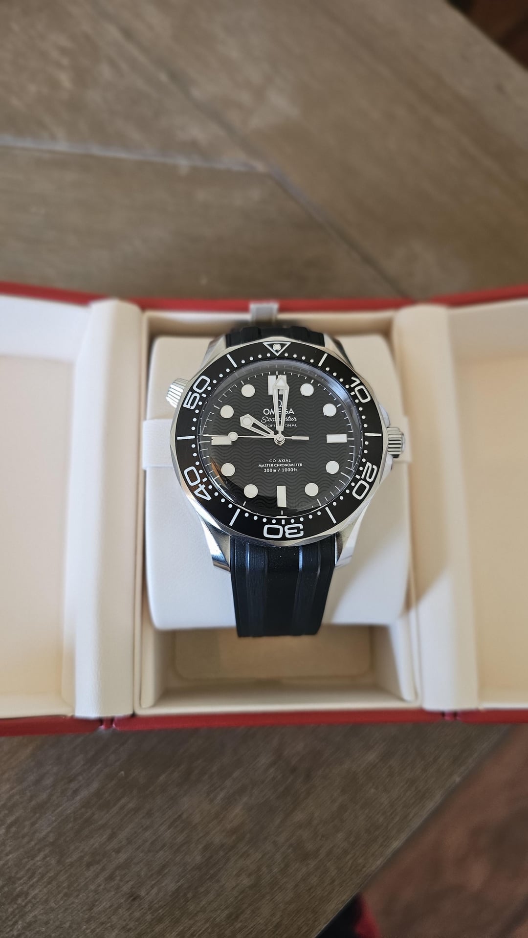 **[WTS] Omega Seamaster Diver 300M - Black Dial - Rubber Strap - Full Kit - $7200 CAD (OBRO)** **Price:** $7200 CAD (approximately $5200 USD), or best reasonable offer **Watch:** Omega Seamaster Diver 300M Co-Axial Master Chronometer **Reference:** 210.32.42.20.01.003 **Condition:** Excellent - Full kit with box, papers, and warranty card **Location:** Canada **Payment Methods:** E-transfer preferred for Canadian buyers, PayPal G&S (+3%) for international **Shipping:** Shipping to Canada included, PM me for CONUS & international **Description** Up for sale is my Omega Seamaster Diver 300M with the black aluminum bezel and black rubber strap. This is the modern iteration of Omega's iconic diver, featuring their Master Chronometer movement with exceptional accuracy and magnetic resistance. The watch is in excellent condition with minimal signs of wear, and comes as a complete set with all box and papers. The black dial with laser-engraved wave pattern looks stunning in any light, and the rubber strap provides exceptional comfort for daily wear. **Specifications** * **Case Size:** 42mm * **Case Material:** Stainless steel * **Bezel:** Black oxalic anodized aluminum with white Super-LumiNova diving scale * **Crystal:** Domed sapphire with anti-reflective coating * **Dial:** Black with laser-engraved wave pattern * **Movement:** Omega Caliber 8806 Co-Axial Master Chronometer * **Power Reserve:** 55 hours * **Water Resistance:** 300m (30 bar) * **Strap:** Black rubber with stainless steel tang clasp **What's Included** * Omega Seamaster Diver 300M watch * Inner and outer boxes * Warranty card * Pictogram card * METAS Master Chronometer card * Instruction manual **Condition** Watch is in excellent condition with minimal signs of wear. The aluminum bezel and dial are pristine with no scratches. The case shows very minor surface marks from light use. The rubber strap is in excellent condition with minimal wear. The crystal is flawless, and the watch is running perfectly within COSC specifications. **Images** Please see post. Feel free to ask if you'd like to see photos of other angles, etc. **Timestamp** [Timestamp photo](https://i.imgur.com/XslllVU.jpeg) This iconic Omega Seamaster Diver 300M was made famous by James Bond and represents one of the finest luxury diving watches available today. The aluminum bezel version offers a more affordable entry point into the Seamaster family while maintaining all the performance and style of the flagship model. Don't hesitate to ask any questions. Thanks for looking! EDITED because my AI assistant apparently doesn't know what a date window is.