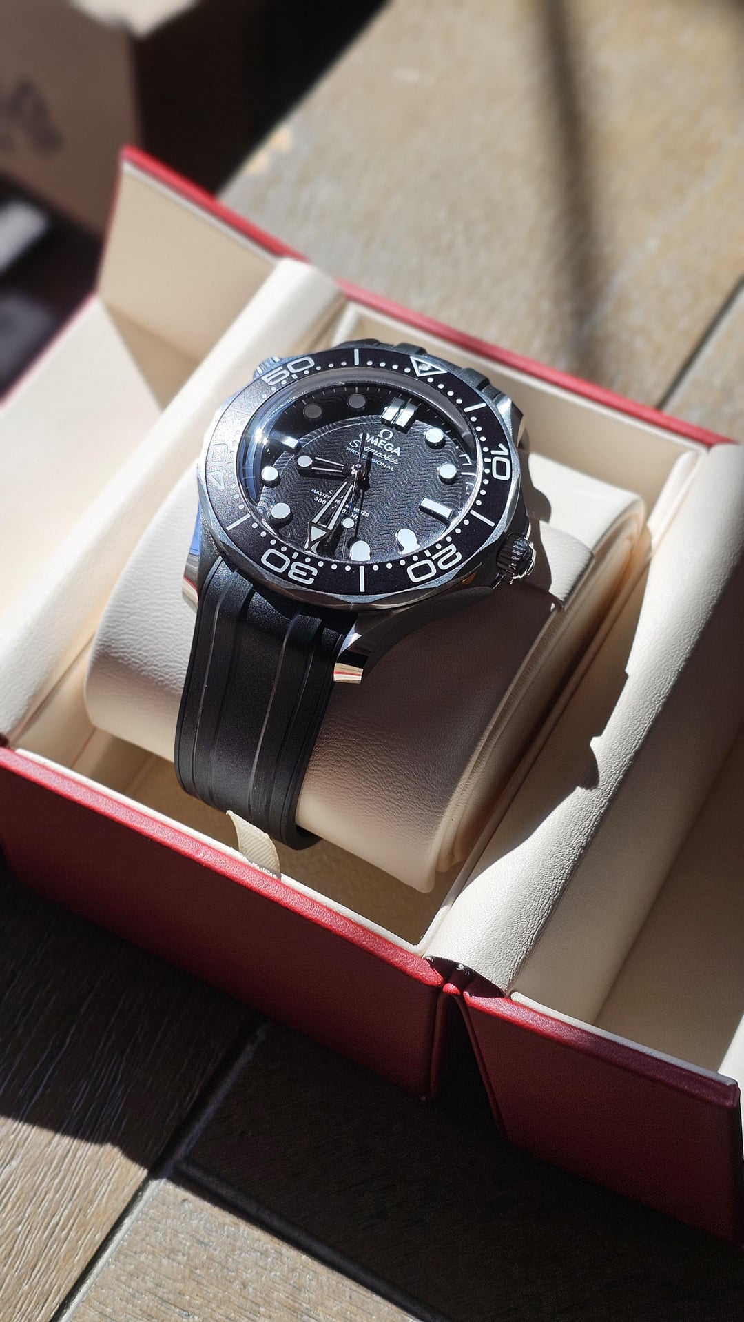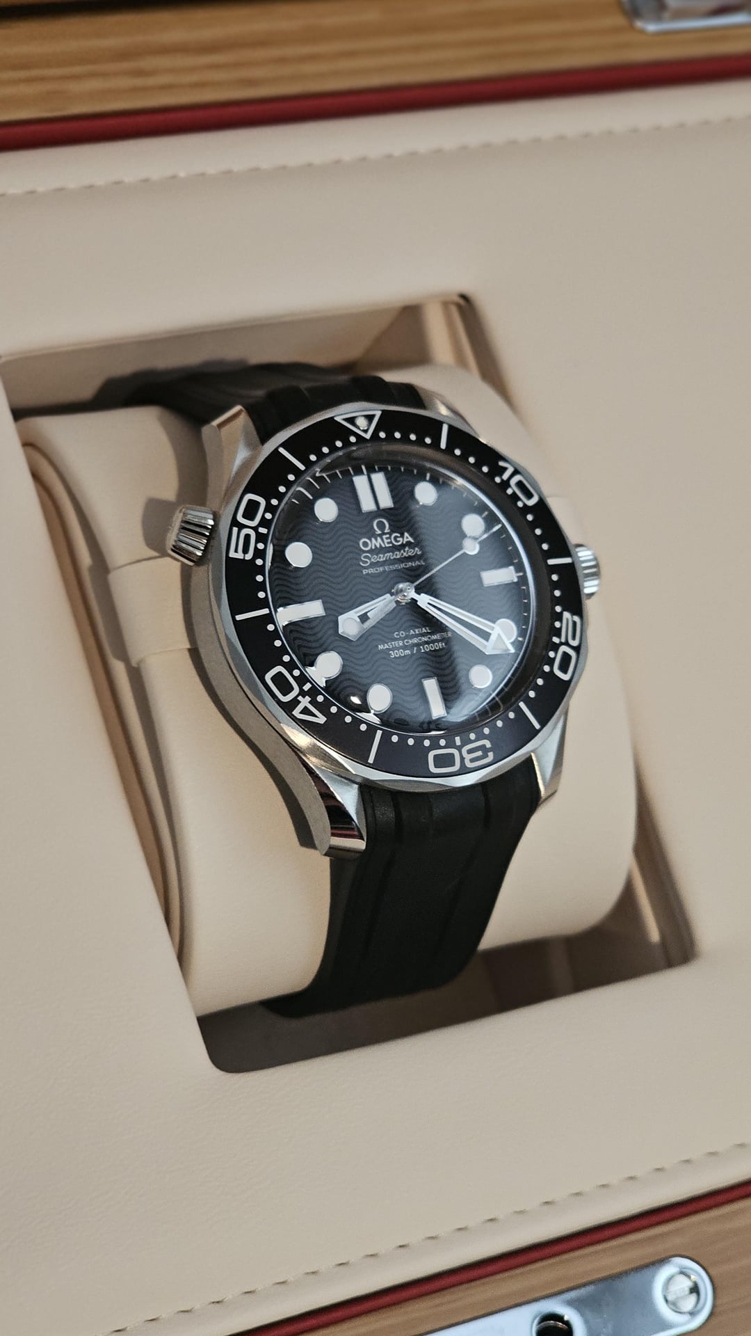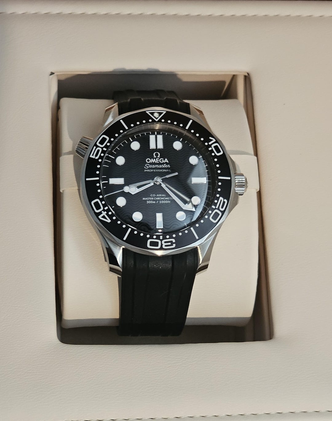 **[WTS] Omega Seamaster Diver 300M - Black Dial - Rubber Strap - Full Kit - $7200 CAD (OBRO)** **Price:** $7200 CAD (approximately $5200 USD), or best reasonable offer **Watch:** Omega Seamaster Diver 300M Co-Axial Master Chronometer **Reference:** 210.32.42.20.01.003 **Condition:** Excellent - Full kit with box, papers, and warranty card **Location:** Canada **Payment Methods:** E-transfer preferred for Canadian buyers, PayPal G&S (+3%) for international **Shipping:** Shipping to Canada included, PM me for CONUS & international **Description** Up for sale is my Omega Seamaster Diver 300M with the black aluminum bezel and black rubber strap. This is the modern iteration of Omega's iconic diver, featuring their Master Chronometer movement with exceptional accuracy and magnetic resistance. The watch is in excellent condition with minimal signs of wear, and comes as a complete set with all box and papers. The black dial with laser-engraved wave pattern looks stunning in any light, and the rubber strap provides exceptional comfort for daily wear. **Specifications** * **Case Size:** 42mm * **Case Material:** Stainless steel * **Bezel:** Black oxalic anodized aluminum with white Super-LumiNova diving scale * **Crystal:** Domed sapphire with anti-reflective coating * **Dial:** Black with laser-engraved wave pattern * **Movement:** Omega Caliber 8806 Co-Axial Master Chronometer * **Power Reserve:** 55 hours * **Water Resistance:** 300m (30 bar) * **Strap:** Black rubber with stainless steel tang clasp **What's Included** * Omega Seamaster Diver 300M watch * Inner and outer boxes * Warranty card * Pictogram card * METAS Master Chronometer card * Instruction manual **Condition** Watch is in excellent condition with minimal signs of wear. The aluminum bezel and dial are pristine with no scratches. The case shows very minor surface marks from light use. The rubber strap is in excellent condition with minimal wear. The crystal is flawless, and the watch is running perfectly within COSC specifications. **Images** Please see post. Feel free to ask if you'd like to see photos of other angles, etc. **Timestamp** [Timestamp photo](https://i.imgur.com/XslllVU.jpeg) This iconic Omega Seamaster Diver 300M was made famous by James Bond and represents one of the finest luxury diving watches available today. The aluminum bezel version offers a more affordable entry point into the Seamaster family while maintaining all the performance and style of the flagship model. Don't hesitate to ask any questions. Thanks for looking! EDITED because my AI assistant apparently doesn't know what a date window is.