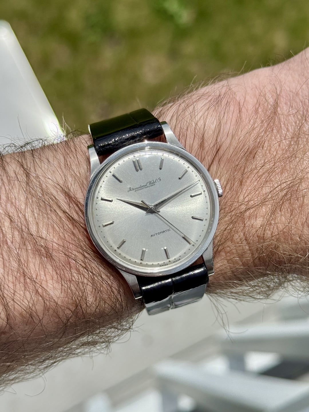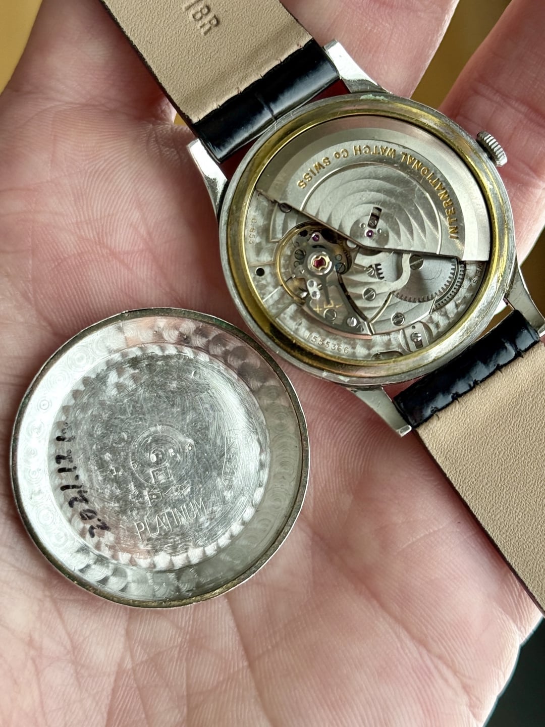 # 1961 Platinum IWC Video: [https://youtube.com/shorts/i64VrSk9JtA?feature=share](https://youtube.com/shorts/i64VrSk9JtA?feature=share) For sale is an exceptional example of a vintage platinum-cased IWC Calatrava. The caliber 853 inside is an automatic movement featuring the reliable, efficient, and shock-resistant Pellaton winding system exclusive to IWC. The case is sharp with thick lugs, sharp edges, and fully intact brushed finishing. The interesting thing about the case, other than platinum being the rarest precious metal used in watches, is that during the 1960’s import duties were very high on platinum in Japan. So IWC contracted with their distributor in Japan, Isomura, to manufacture the case in-country and shipped the incomplete watches to Japan for final assembly. These watches are denoted with a small Japanese flag on the inside of the caseback, and are very rare. The case measures 35mm wide without crown, with a 42.6mm lug to lug length and 18mm lug width. Because of the relatively very large dial it wears a bit larger than the case might suggest. Wrist shot is of it on my \~6.75" wrist for reference. Service history unknown but there are some service markings in the case and movement is in strong running condition per timegrapher. Watch comes on a new, unworn MiUSA alligator strap. Imgur album: [https://imgur.com/a/1961-iwc-platinum-853-b1nqS05](https://imgur.com/a/1961-iwc-platinum-853-b1nqS05) Timestamp: [https://imgur.com/a/rElJWLB](https://imgur.com/a/rElJWLB) I'm asking **$2,895 including fully insured shipping** in the US, paid via wire, Zelle, or Venmo F&F. Happy to do a video call to show the watch. I will ship internationally and only charge the difference in cost on top (Wise accepted for international payments). I’m not interested in trades. Feel free to reach out with any questions!
