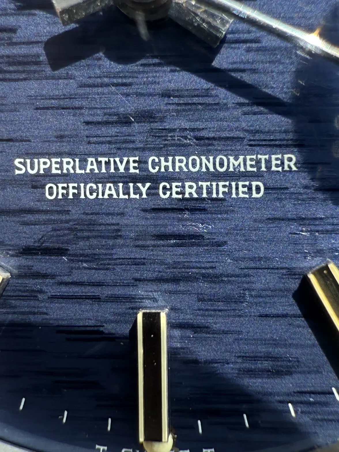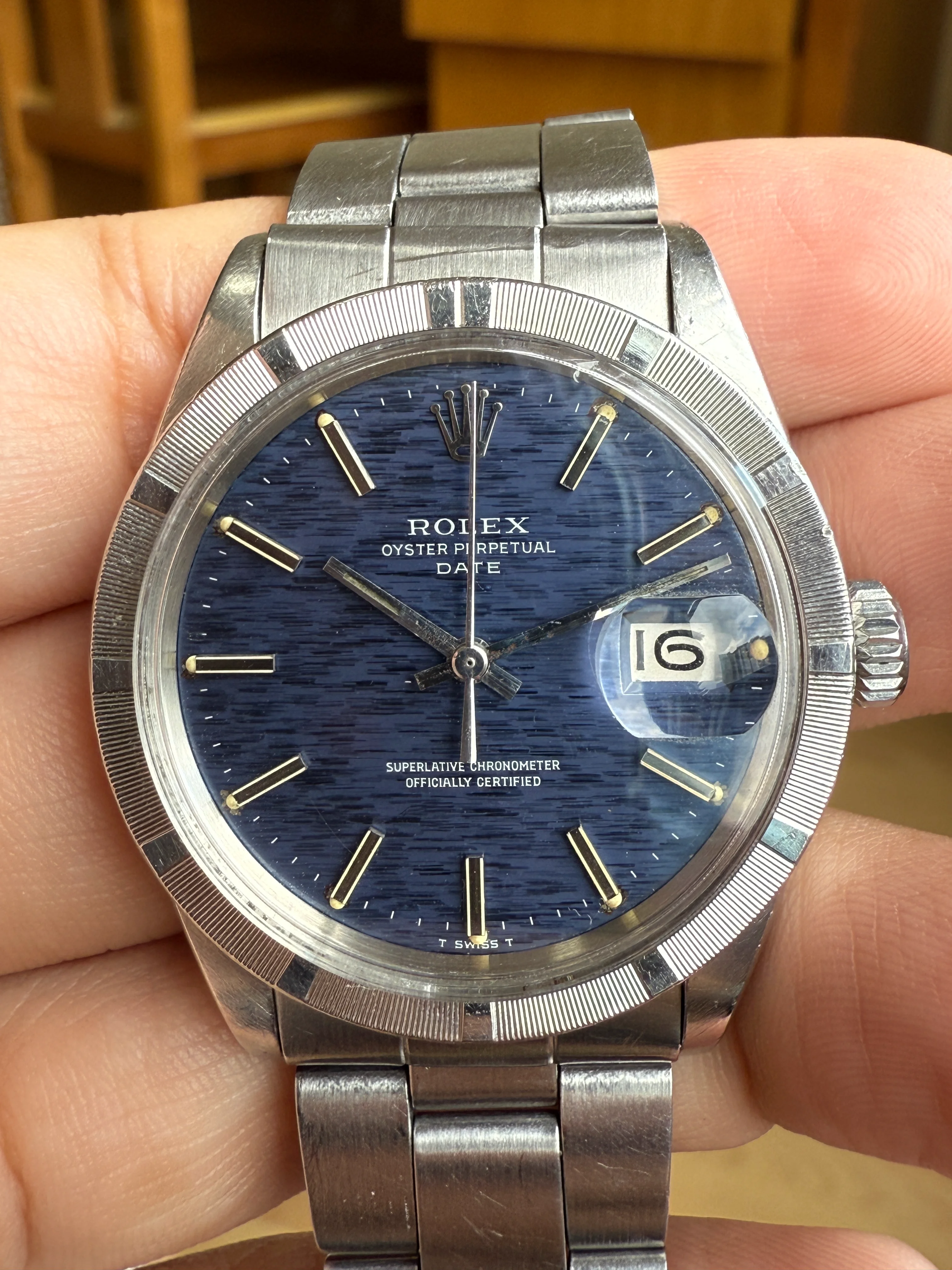 - Dial: Original blue mosaic/shantung/brick dial in very good condition, solid hour markers with lume, baton hands; date at 3; prints, hands, hour markers are all good.