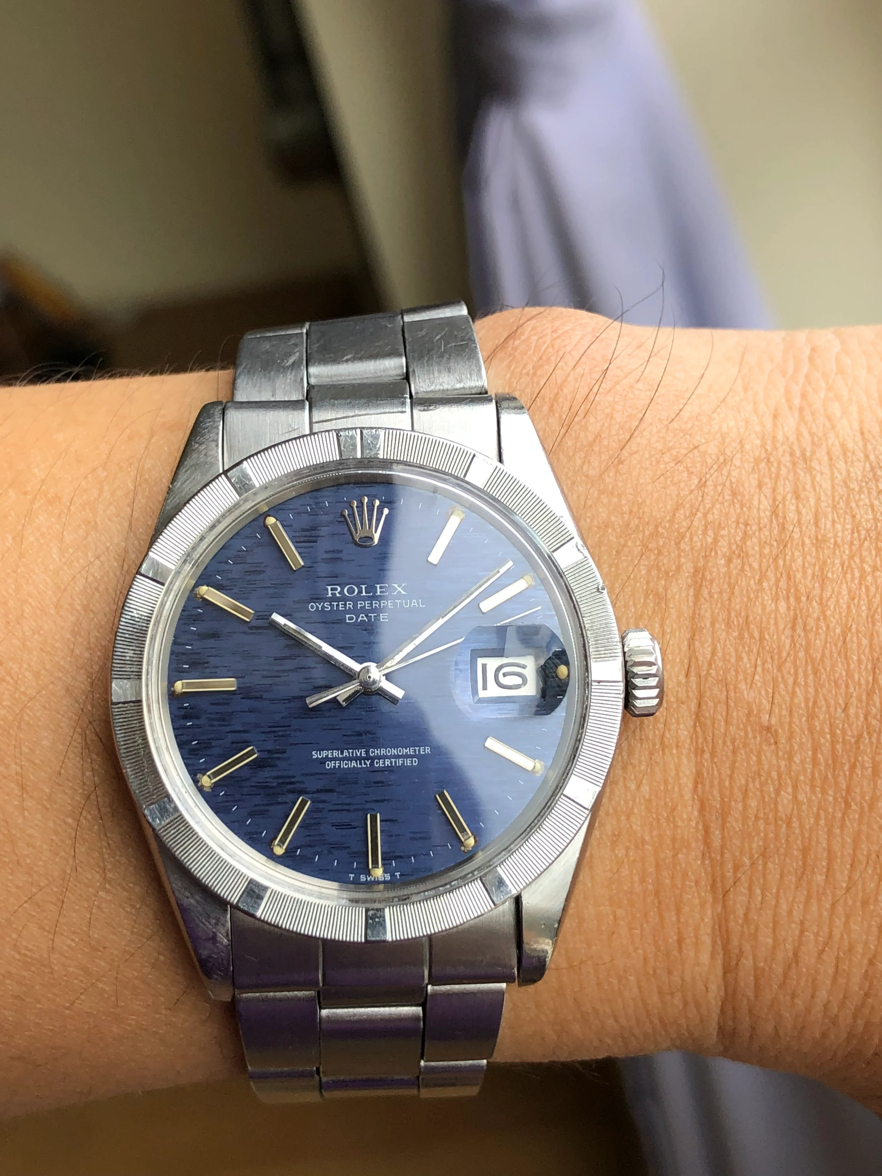 A very nice stainless steel Rolex Oyster Perpetual Date 1501, rare blue mosaic/shantung dial, lume, original Rolex bracelet 7835/257 in very good condition.