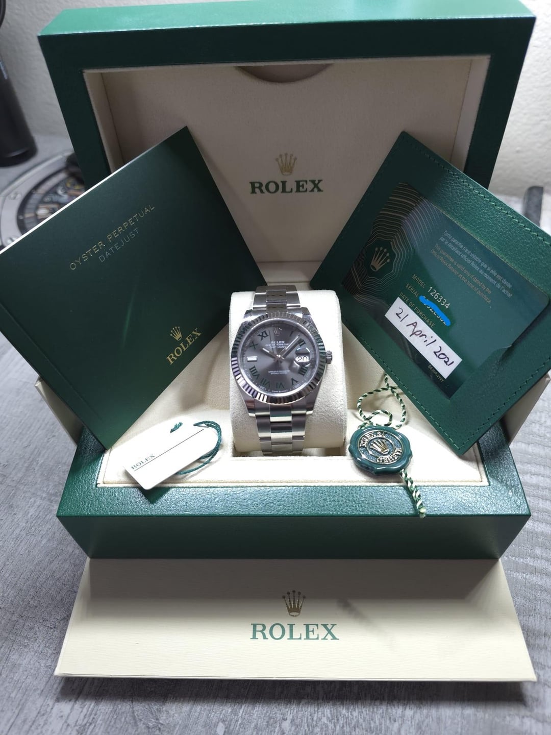 **Rolex Datejust 41 “Wimbledon”** **Ref: 126334** This stunning Wimbledon Datejust 41 comes from the original owner and remains in excellent condition with little to no signs of wear. It comes as a complete set with the Rolex double box, serial tag, green hang tag, booklets, and warranty card dated 4/21/2021. A highly sought-after configuration with the signature Wimbledon dial—perfect for collectors and everyday wear alike. Price = $12,750 shipped Pics & Timestamp = [https://imgur.com/a/Rul8r5a](https://imgur.com/a/Rul8r5a) IG = watchfornia Cheers, Adam