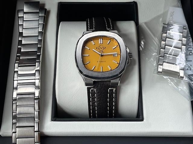 Gevril GV2 Potente Yellow Dial Selling my yellow dial GV2. Watch is in pristine condition, no rashes on the case, crystal, and bracelet. I have worn it mainly on the OEM Gevril brown leather with signed deployant clasp. Description from the web: Silver-tone stainless steel case and bracelet. Fixed silver-tone stainless steel bezel. Yellow dial with silver-tone hands and index hour markers. Minute markers around the outer rim. Dial Type: Analog. Luminescent hands and markers. Date display at the 3 o'clock position. Automatic movement. Scratch resistant sapphire crystal. Pull / push crown. Transparent see through case back. Cushion case shape, case size: 40 mm, case thickness: 12.5 mm. Band width: 20 mm. Deployment with push button release clasp. Water resistant at 50 meters / 165 feet. Functions: date, hour, minute, second. Potente Series. Luxury watch style. Watch label: Swiss Made. GV2 by Gevril Potente Yellow Dial Men's Watch 18111B. I am asking $550. Price includes shipping to CONUS. I will ship internationally and we can discuss splitting costs. I accept PayPal F&F, Venmo, or Zelle. If using PayPal G&S, please add 4.5% to cover the fees. Let me know if you have any questions or want more pics. Please comment here before sending me a chat.