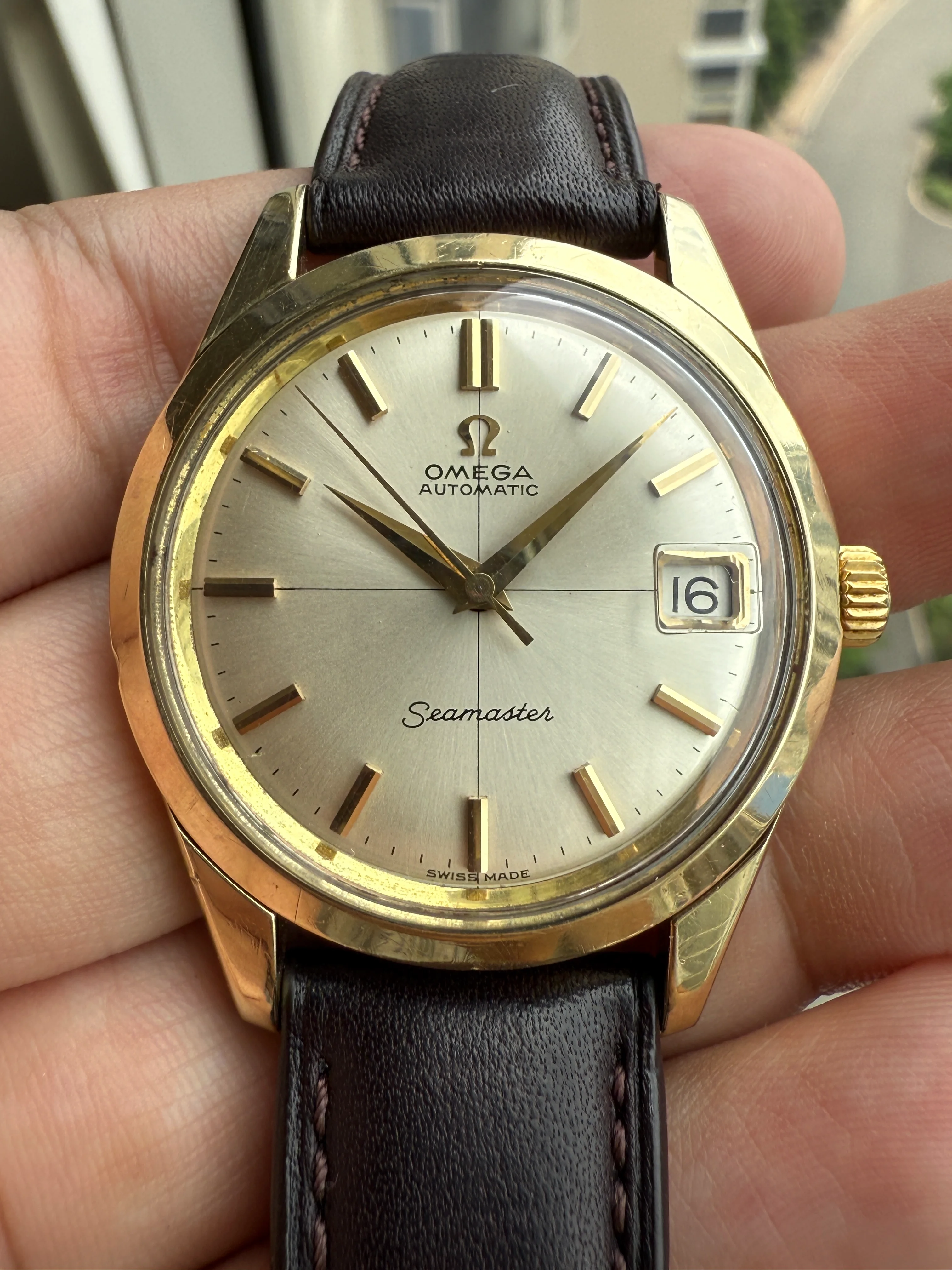 Omega 166.010, gold capped, cross hair dial, gold plated buckle, leather strap, serviced, free shipping