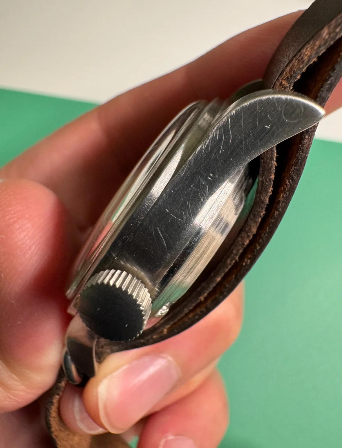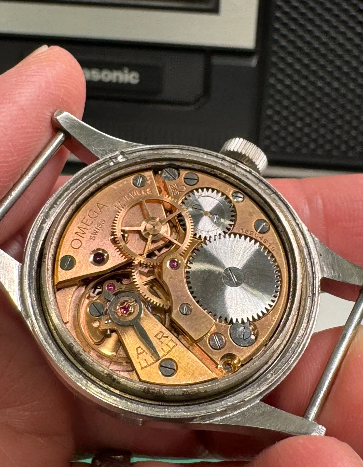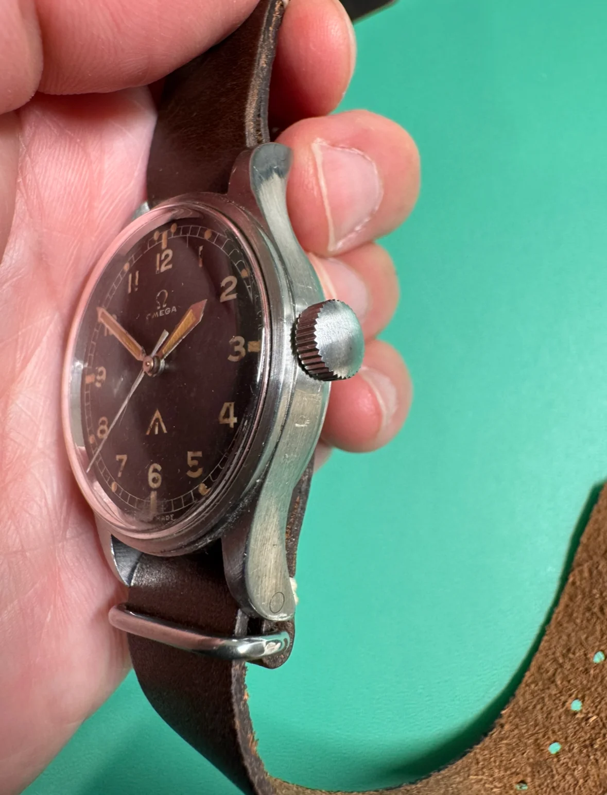 I have here an Omega thin arrow RAF 1953 watch. Original radium dial. Watch is running strong. Case is in great condition. Dial has some marks as shown but overall looks attractive to me and the lume has a warm patina. I included pictures of the caseback, dust cover, movement, and close ups of the lugs. Comes with an extract from the archives showing it was issued to the UK. AJTT mentions that only 5,900 pieces were made, that the same basic design was relaunched in 1957 as the "Railmaster," and that there are some interesting antimagnetic faraday cage type features such as an extra thick dial of 1 mm compared to the standard of 0.4 mm with the dial and dust cover being made of "mumetal," a nickel iron alloy. As you might know, the thin arrow was recalled for radiation and most of these were redialed by the MOD as the "fat arrow" tritium variant. Few of the original thin arrow dials survived, here's your chance to get one.