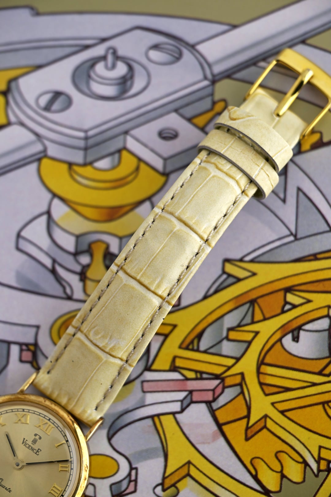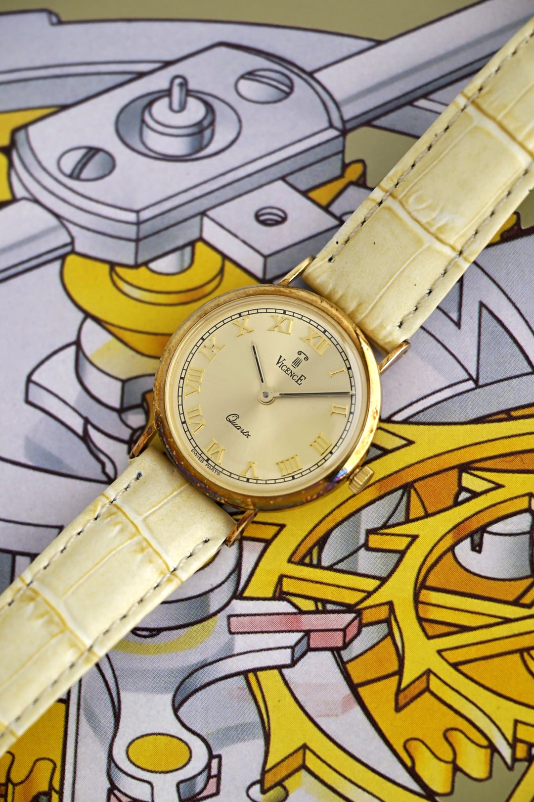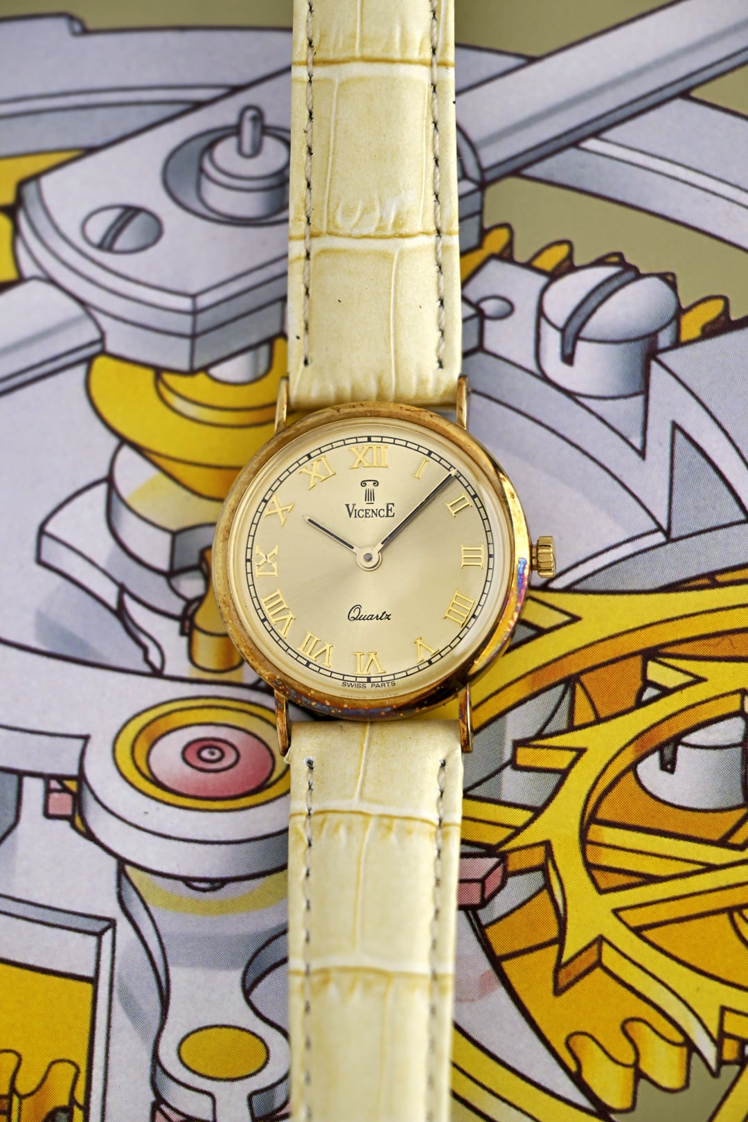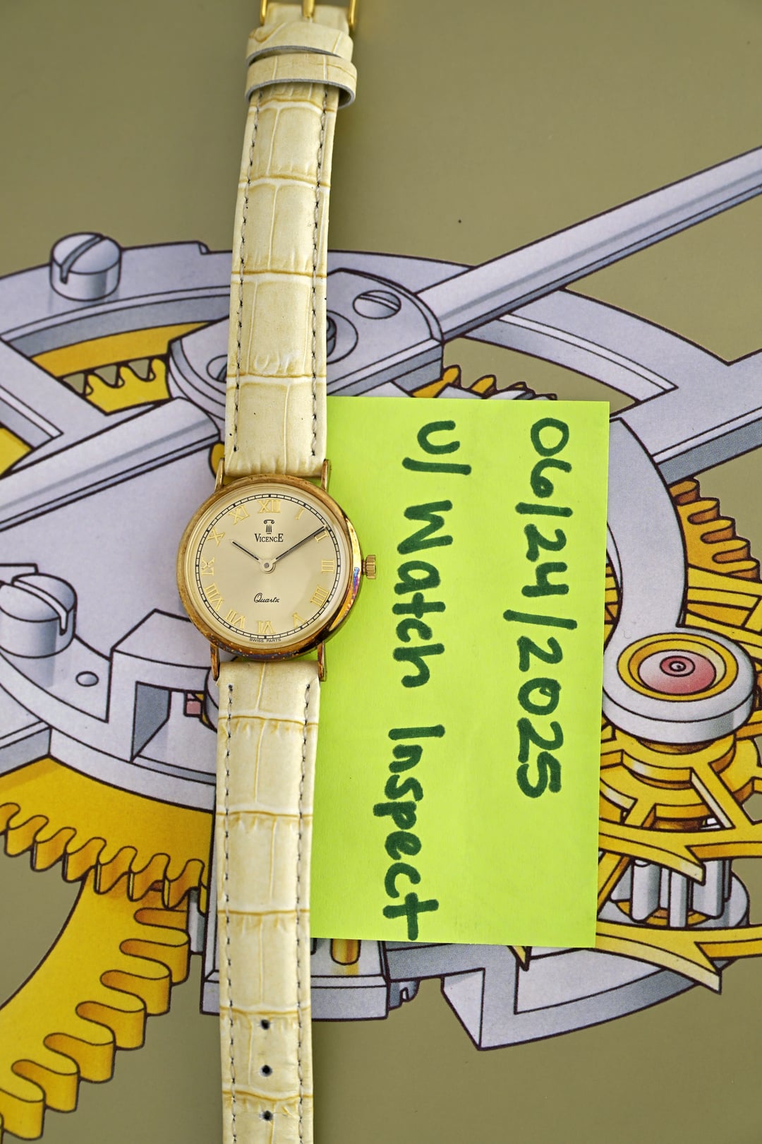 **Please leave a comment before reaching out.** **Specifications:** • **Case Size:** 26mm • **Lug Width:** 14.25mm • **Lug to Lug:** 31mm • **Thickness:** 8.35mm • **Max Wrist Size:** 7.1-7.25 in • **Water Resistance:** 30 m (3 ATM) • **Year:** 1990-1999 • **Movement:** Quartz • **Case Material:** Yellow Gold • **Band Type:** Two-Piece Strap • **Band Material:** Leather • **Origin:** Switzerland [Album](https://watchinspect.com/album/vincence-vintage-90s-ladies-14k-solid-gold-quartz-watch-swiss-movement-leather) ## 📦 Shipping & Payment **Shipping:** * 🚚 Free USPS priority shipping within USA** 2-4 Day * 🚀 Overnight (+$25) | 🌎 International (+$40) * All parcels are insured **Payment Options:** * **Established Users** with more reviews/verifiable address: Zelle, Paypal, Debit/Credit Card Via watchinspect.com (our official website), Bank Transfer, Wise, Revolut, CashApp, Venmo, or Crypto USDC. * **New Users with no/low reviews**: Debit/Credit Card Via watchinspect.com (our official website), Wise, Zelle, Cashapp, or Crypto USDC