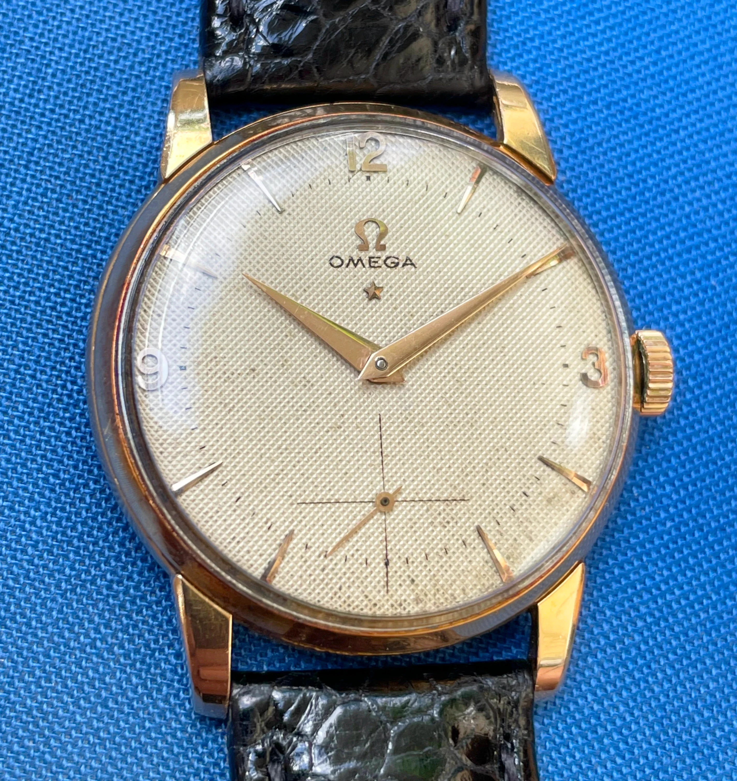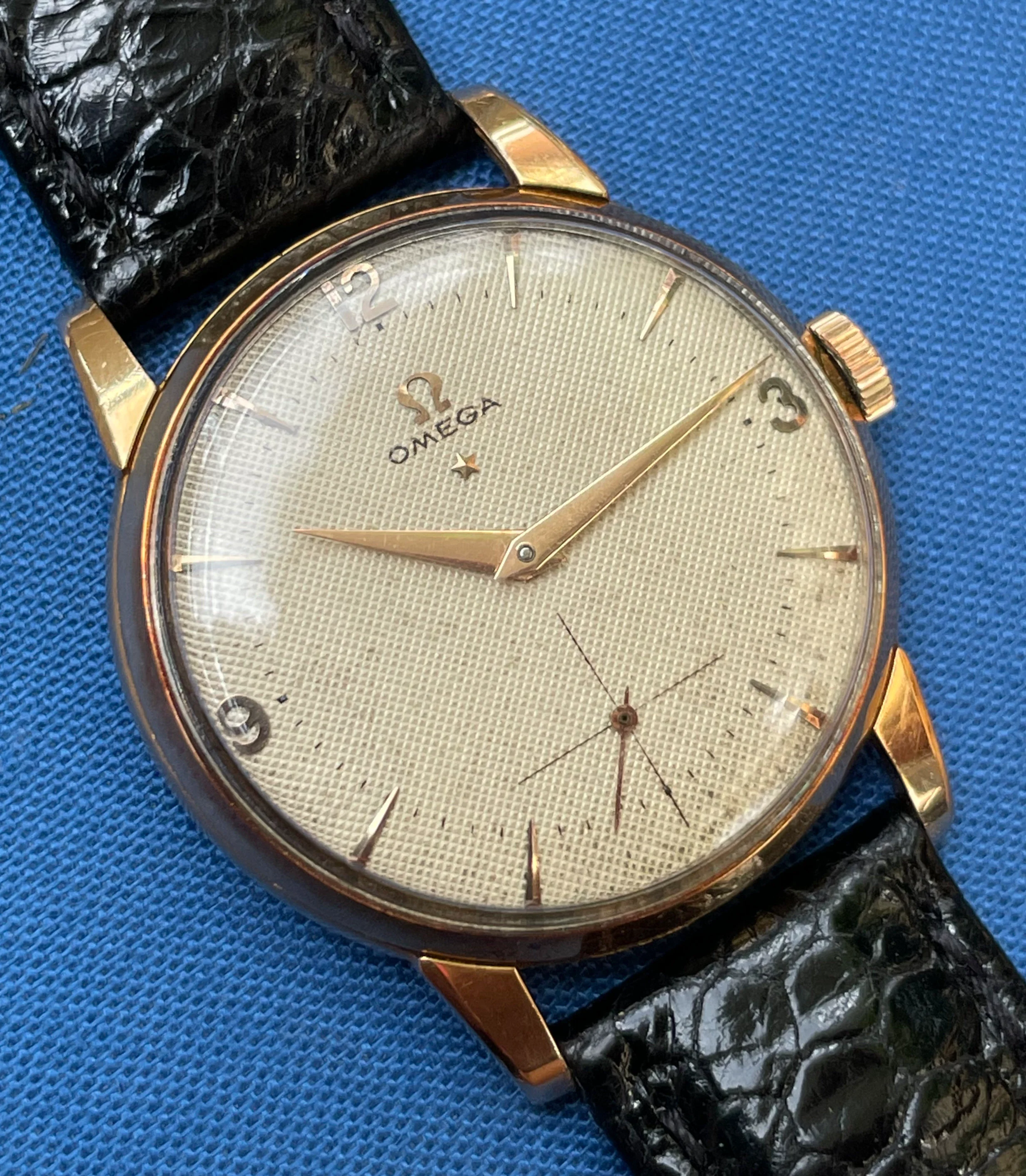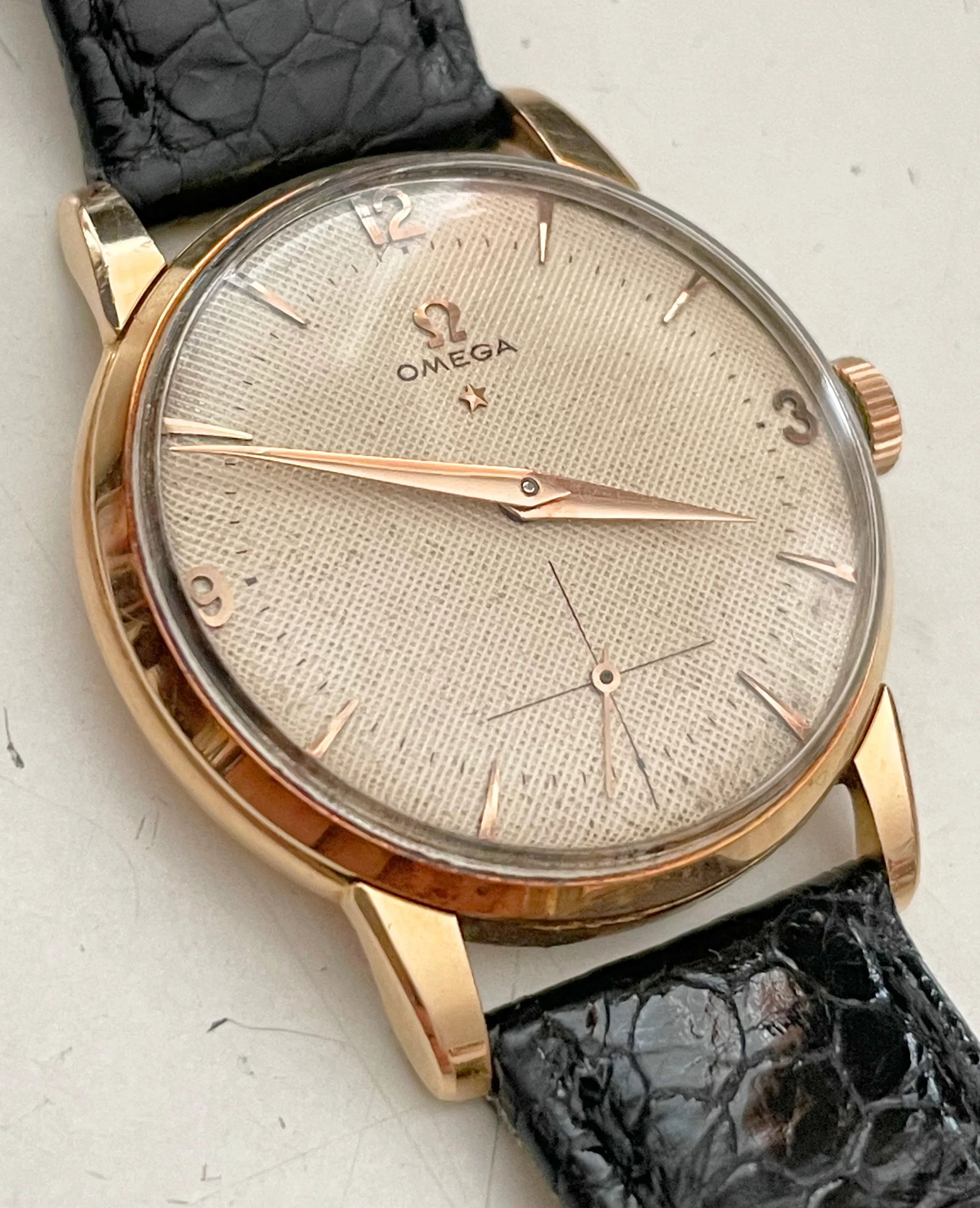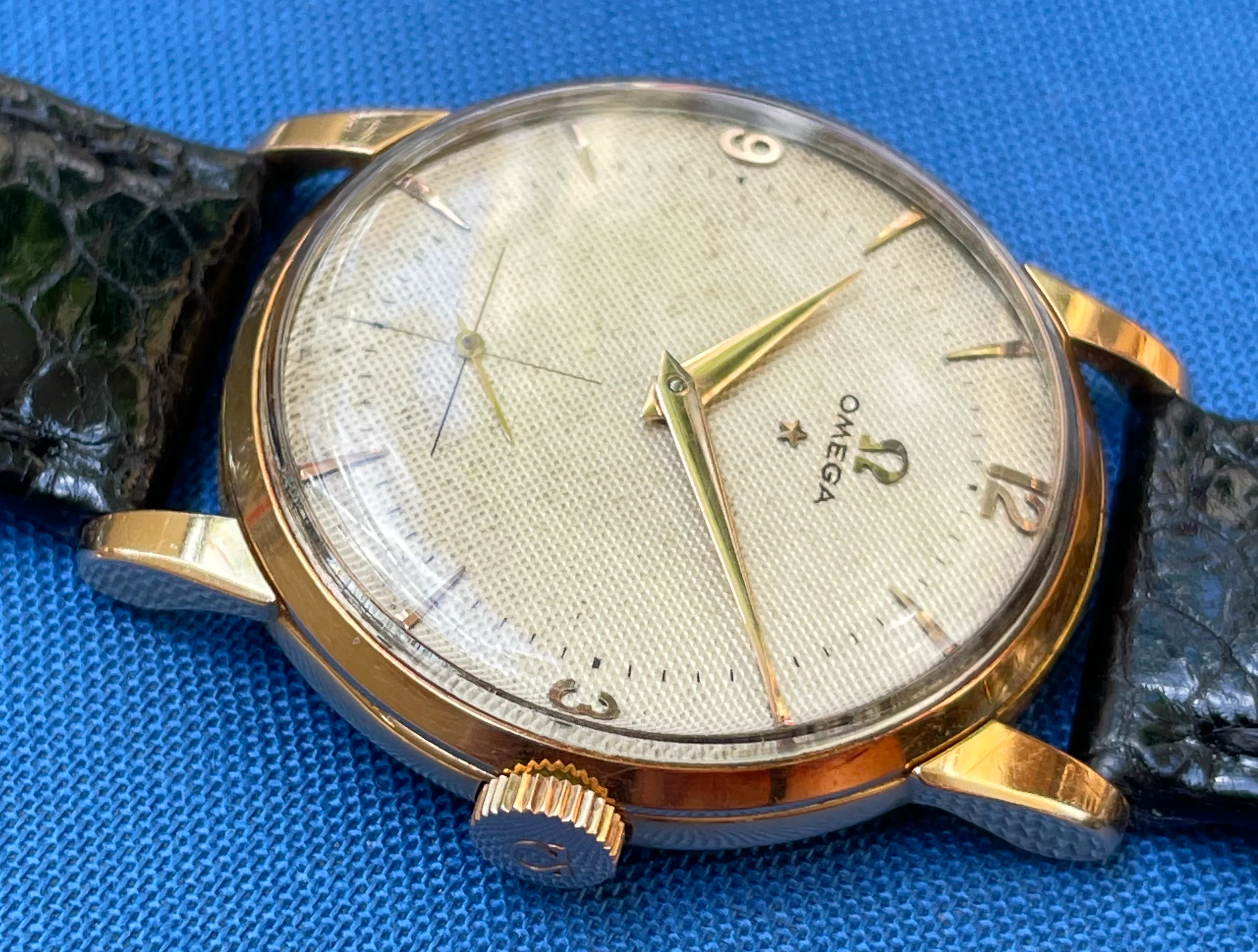 for sale is an Omega OT 2918 in a 33.5mm 18k rose gold case. The condition is nice for its age, with a few signs of wear here and there, but no mistreatment, not polished and of course an original waffle dial, which already has some patina. The little star on it is interpreted in different ways; one nice story, for example, is this: