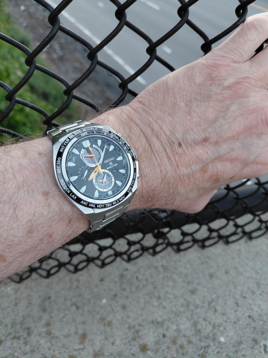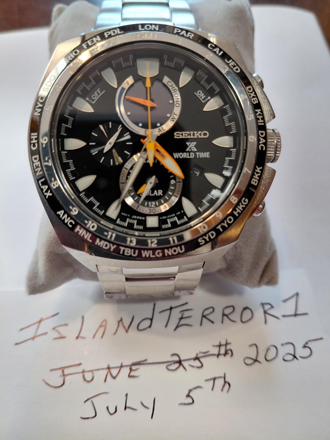 Link to Seiko website specifications [https://www.seikowatches.com/in-en/products/prospex/ssc487](https://www.seikowatches.com/in-en/products/prospex/ssc487) SSC487 Prospex Solar World time Alarm Chronograph Very good condition, minimal visable wear , Sapphire crystal flawless New Capacitor fully charged , 2 extra links with pins currently sized for 7"ish wrist , clasp has 4 micros screw down crown 44.6mm X 12.3 thickness , 22mm lug width lug to lug is 52mm Very nice example with orange accents and Monsteresque indices No box , but , will come securely wrapped Just slightly to large for my 7" wrist of I'd keep it . Added a few wrist shots $ 165 shipped USA via USPS priority Zelle preferred or PayPal Friends and Family add $ 4.93 fee