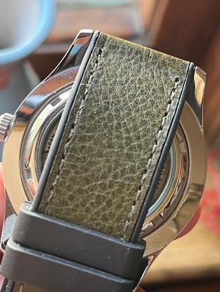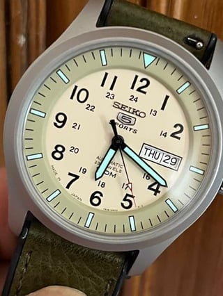 Selling my beige Seiko 5 field watch. The beige dial takes on a greenish hue depending on the light. I have worn it on this green hybrid leather-rubber strap (included), so the original nylon strap is unworn. The watch is in excellent condition and there are no scratches on the case or crystal. The green lume is vibrant. I would rate it a 9.5/10. Features: Automatic Movement: Seiko Caliber 7S36 movement Power Reserve 40 hours Stainless Steel Case Nylon strap Beige Dial Black indices with Luminous hands and markers See-through case back 100m Water resistant 23 Jewels Hardlex Crystal Day and date display at 3 o'clock position Case Diameter: 42 mm (excluding crown) Case Diameter: 43mm (including crown) Case thickness 12mm Lug width 22mm I am asking for $175, which will include shipping to CONUS. I accept PayPal F&F, Venmo, or Zelle. Please add 4.5% if using PayPal G&S. Please let me know if you have any questions.