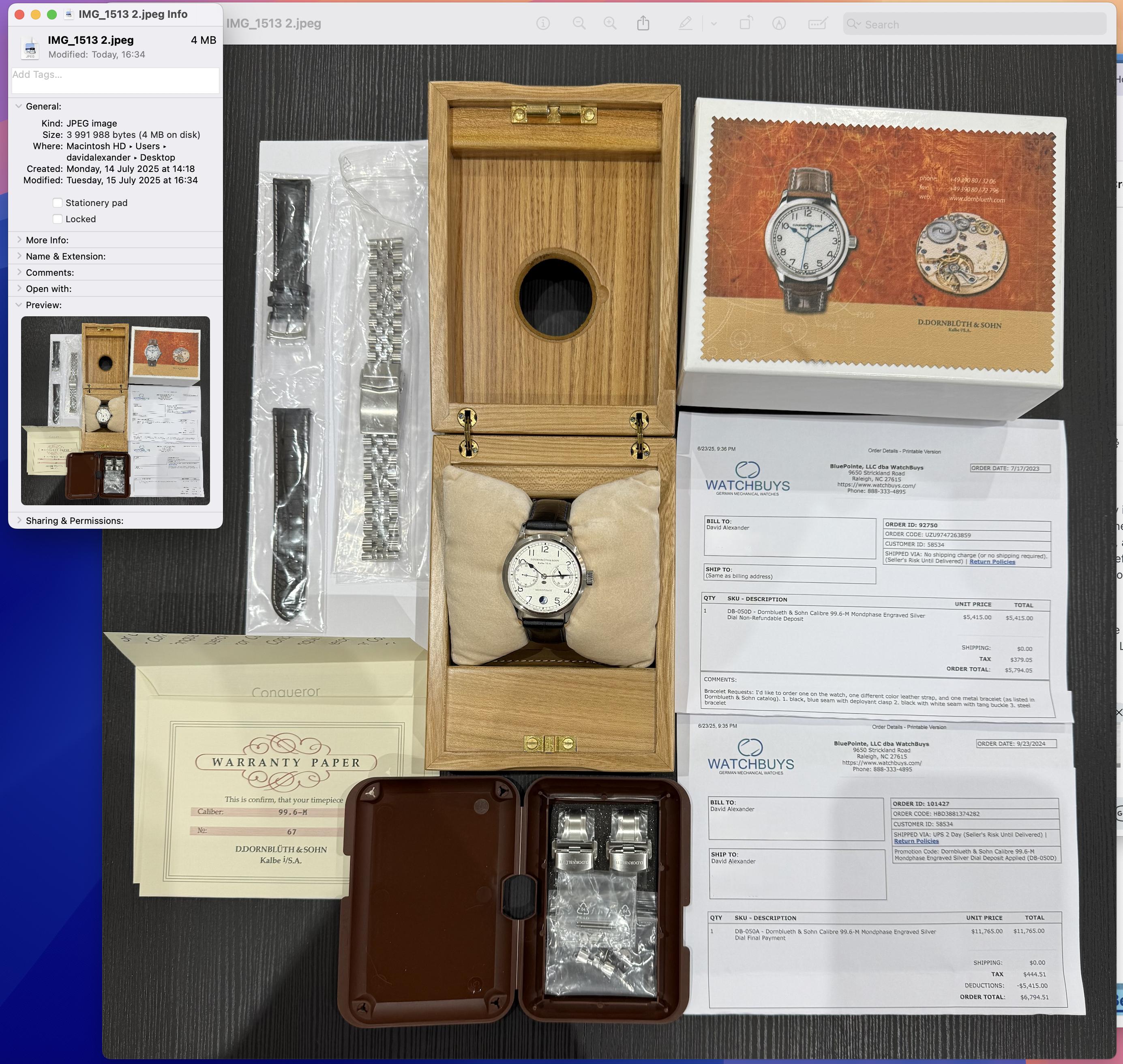 Model & Reference Dornblth&Sohn 99.6 MMondphase (2024) Condition Mint / unworn. Tried on only indoors, never sized or worn outside No marks on case, crystal, sapphire back, or hardware Case 40mm 10mm nickel-free stainless steel, polished & burnished Double screw union construction; domed AR sapphire crystal Oversized signed crown; sapphire display back Dial & Hands Hand-engraved, silver white brass dial with black infill (chronometer grain) Central hours/minutes, power reserve at 3 o'clock, oversized eccentric seconds at 9 o'clock Moon phase at 6 o'clock with 59 59-day countdown pointer Heat-blued, hand-polished steel hands Movement In-house hand-wound calibre (37mm, 4.4mm high, 19 jewels, 18000vph) 50h power reserve; bevel gear PR differential Custom red gold plated three-quarter plate with yellow gold hand-engraved logo & serial number. Geneva stripes, retracing ratchet, double sunburst crown wheels Included Straps / Bracelet (all unused) Black alligator strap with blue edge (matches blued hands) Black alligator strap with white stitching (echoes dial) Stainless steel bracelet with OEM hardware kit Full Set Inner & outer boxes, warranty card (valid to July 2026), polishing cloth, and receipts to prove provenance. Spare spring bars & strap changing tool Why It Stands Out for Your Customers The engraved dial and red gold movement plate are factory upgrade options Zero wait time vs. current \~18-month order backlog Collector grade condition and versatile attachment options Logistics Watch is in hand; based in Lisbon, Portugal. Because I have only purchased watches prior, never sold, we can work with an escrow service if preferred.