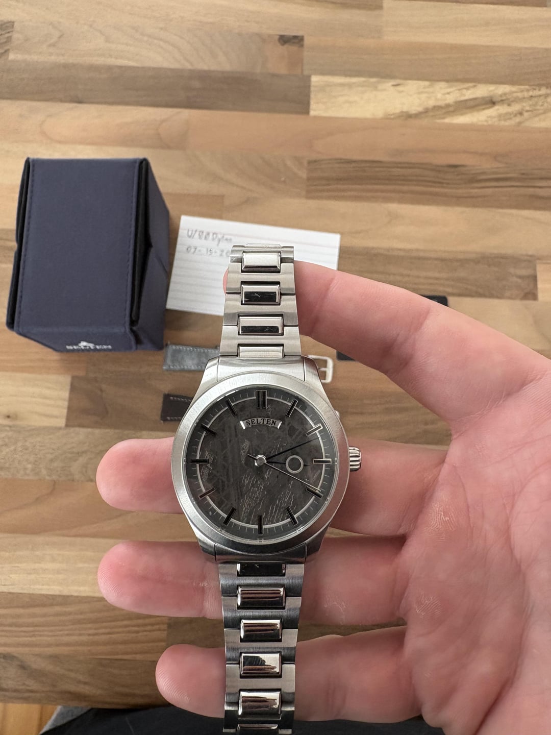 WTS\] Selten 01.01 Full Kit for $520 This listing is for a Selten Series 01.01 Natural Meteorite dial, butterfly style bracelet, and two Has No Bounds straps. Reason to sell: I have a Selten 00.13b that I wear predominantly and bought this watch for the dial but I have only worn it a handful of times. I also bought a Tudor 925 from the sub and that leaves next to no wrist time in the future for this guy. Condition: Very good, there are a few scratches on the underside of the lugs from swapping the bracelet on and off. Price: $520 shipped CONUS. No trades, please. Payment: Zelle or Venmo. Includes: Watch head, bracelet, warranty card, Selten fabric pouch, extra links, two Has No Bounds straps Refunds/Returns: I cannot accept returns or issue refunds so please ask for more information, photographs or videos if you require. References: I have not made any sales through Reddit but I have bought 17 times from [r/PMsforsale](https://www.reddit.com/r/PMsforsale/) and once from r/Watchexchange. Feedback can be found at: [https://www.reddit.com/r/PMsFeedback/search/?q=u%2F00dylan&cId=a04144a7-0f6b-4d8f-86f5-518937e036f4&iId=21f2ed25-f10e-4b13-a3b4-bec48ac83d47](https://www.reddit.com/r/PMsFeedback/search/?q=u%2F00dylan&cId=a04144a7-0f6b-4d8f-86f5-518937e036f4&iId=21f2ed25-f10e-4b13-a3b4-bec48ac83d47) Gallery: [https://imgur.com/a/HZ4I9CE](https://imgur.com/a/HZ4I9CE) CASE Hand Finished 316L Stainless Steel Case DIAL Meteorite HANDS Blue Heated Pontife Style MOVEMENT Seiko NH35 Automatic POWER RESERVE 41 Hours CASE DIAMETER: 40mm THICKNESS 13mm (Excl. glass) WATER RESISTANCE 50 meters LUG WIDTH: 20mm GLASS Flat Sapphire Crystal with AR Coating (Front) Flat Sapphire Crystal (Back) Exhibition Caseback with Custom Rotor Individually Etched Serial Number Plate