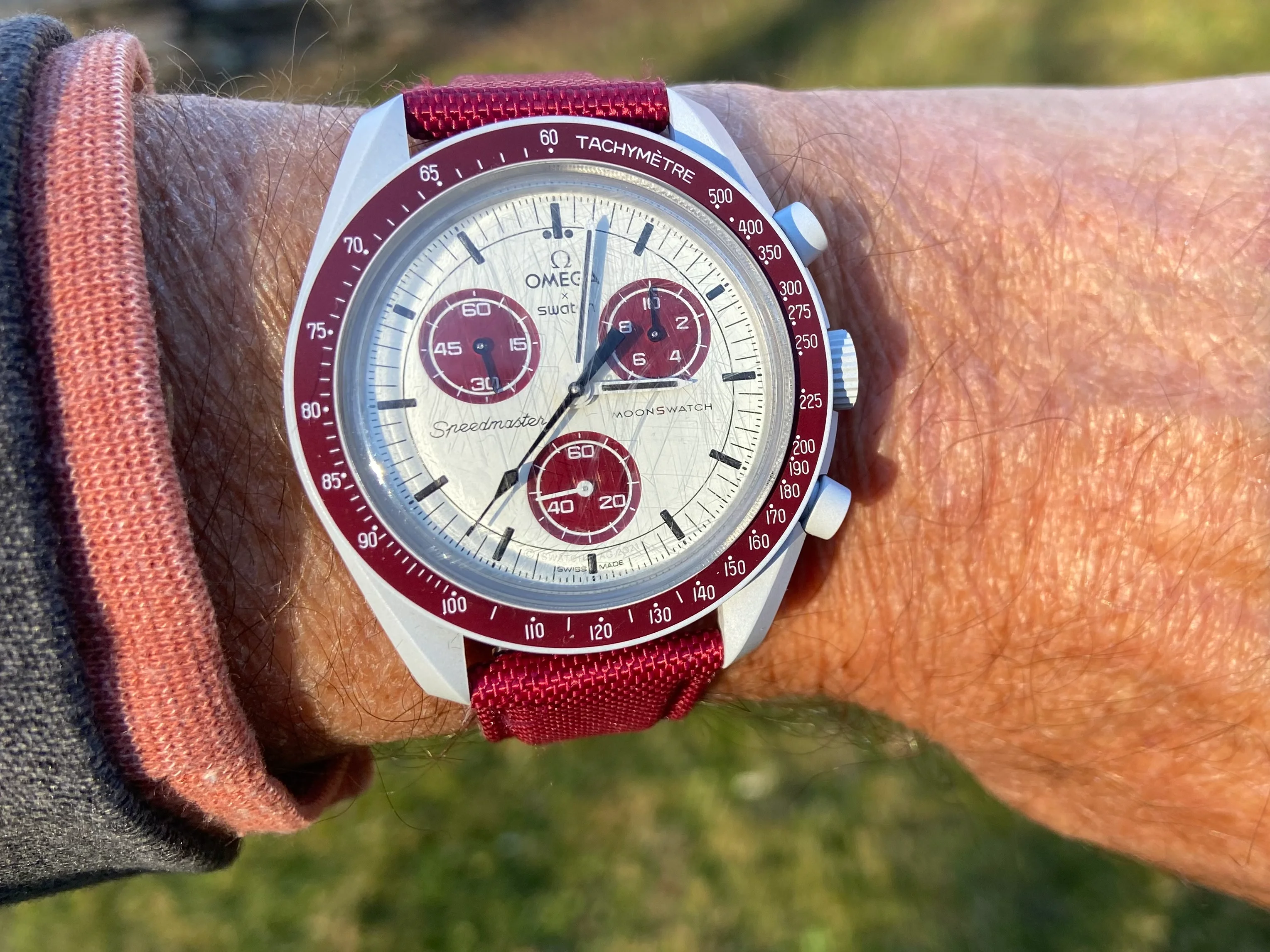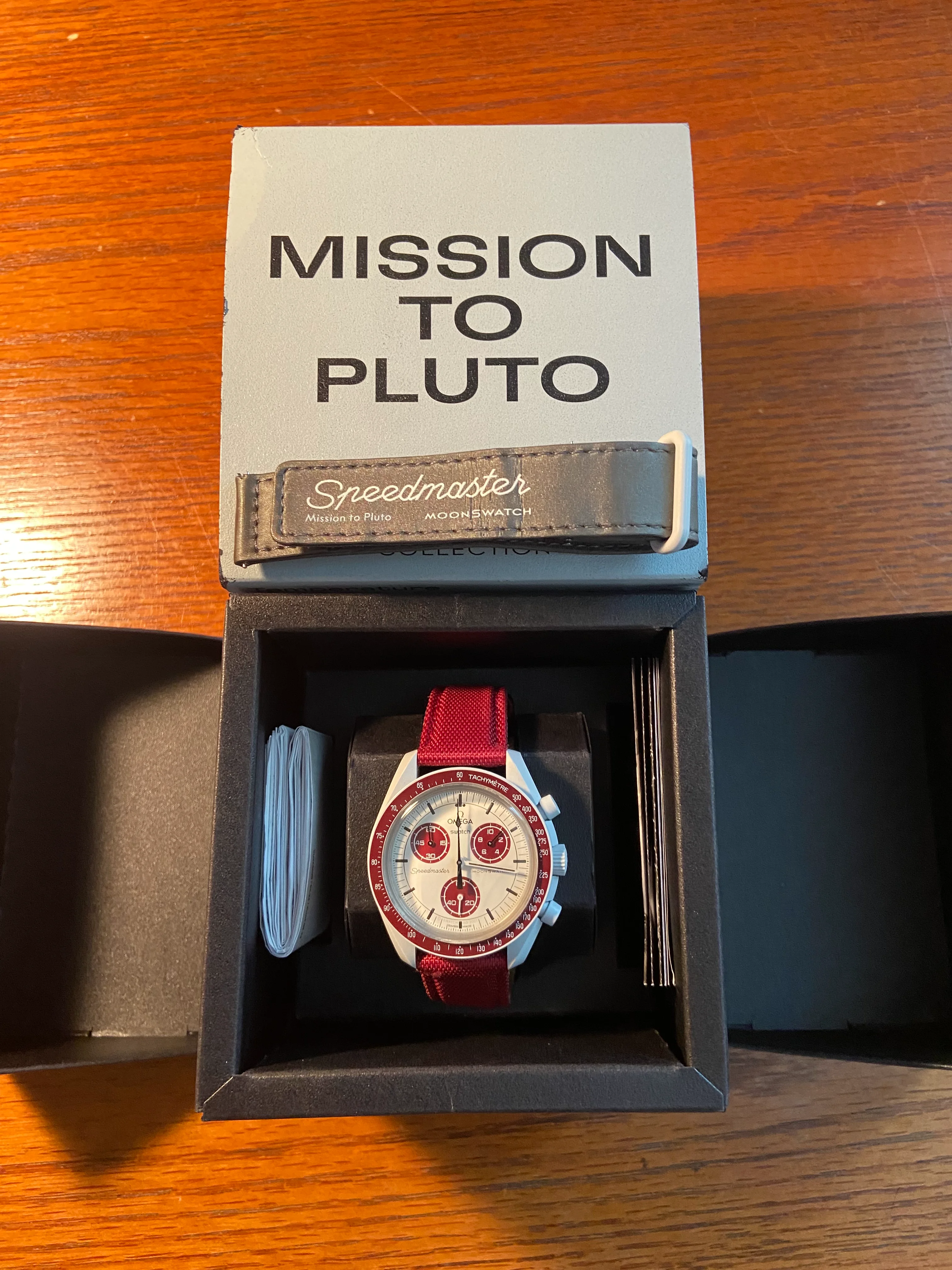I purchased this Mission to Pluto MoonSwatch used last year and wore it a few times. It was originally purchased in November, 2022. I put a new battery in a few months back, so it should be good to go for a while. As you can see from the photos, it's on a nylon type strap and the back of the strap is leather. It comes with the original gray strap. I'm only looking to cover the cost of shipping. I'd like to see this go to someone who will wear it, or maybe know of someone who would like to have it. As you can see from one of the photos, the crystal was quite scratched, but I used up quite a bit of polywatch and it's pretty clear now.