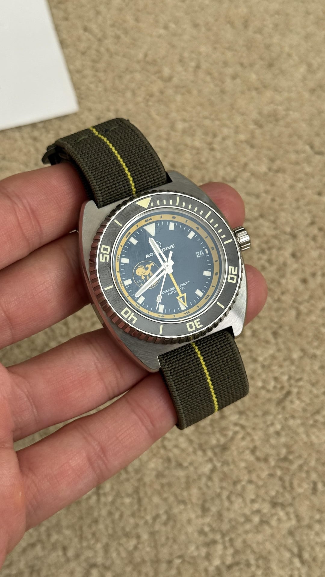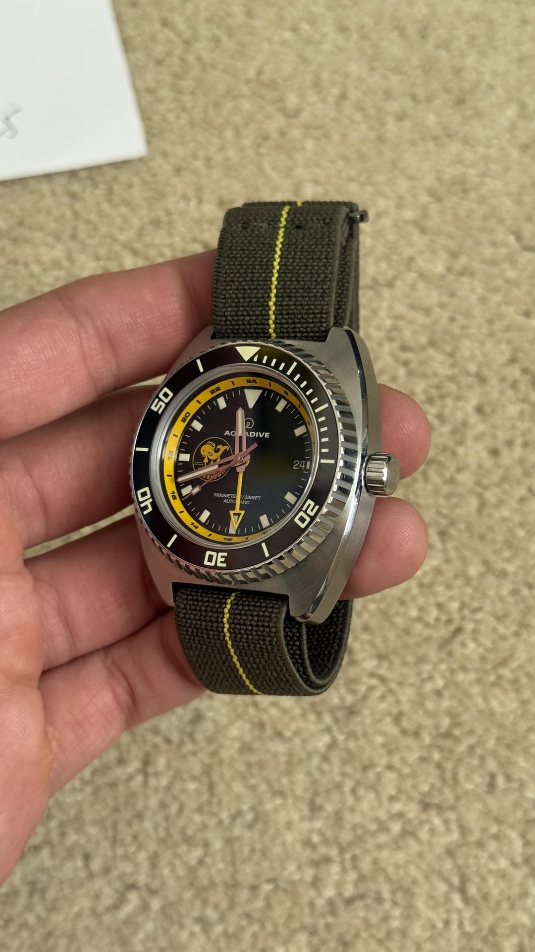 Catch and release on this one that was just received in a trade. Priced to sell!! Beautiful 2020 Aquadive Poseidon GMT in yellow. Comes with the tube, paperwork for the movement and a Watch Steward MN strap. Please do your research and confirm your intent and ability to complete the purchase prior to reaching out. I’m looking for $1,000. No trades. Payment via Zelle preferred - Venmo and PayPal for heavily referenced members. CONUSA Shipping is included in my price.
