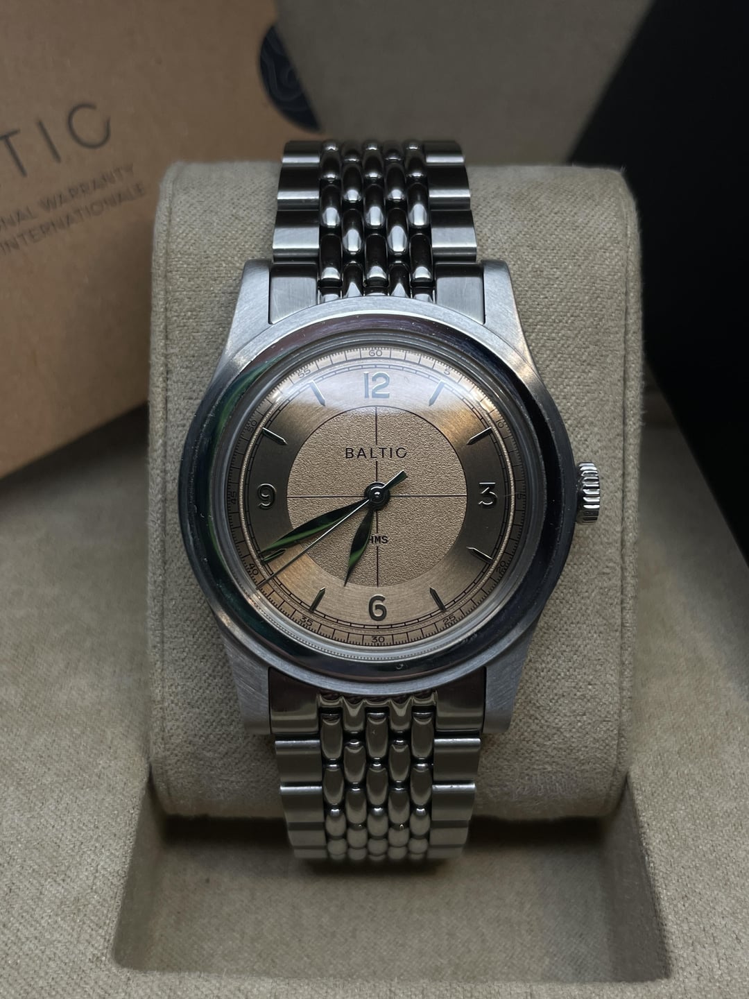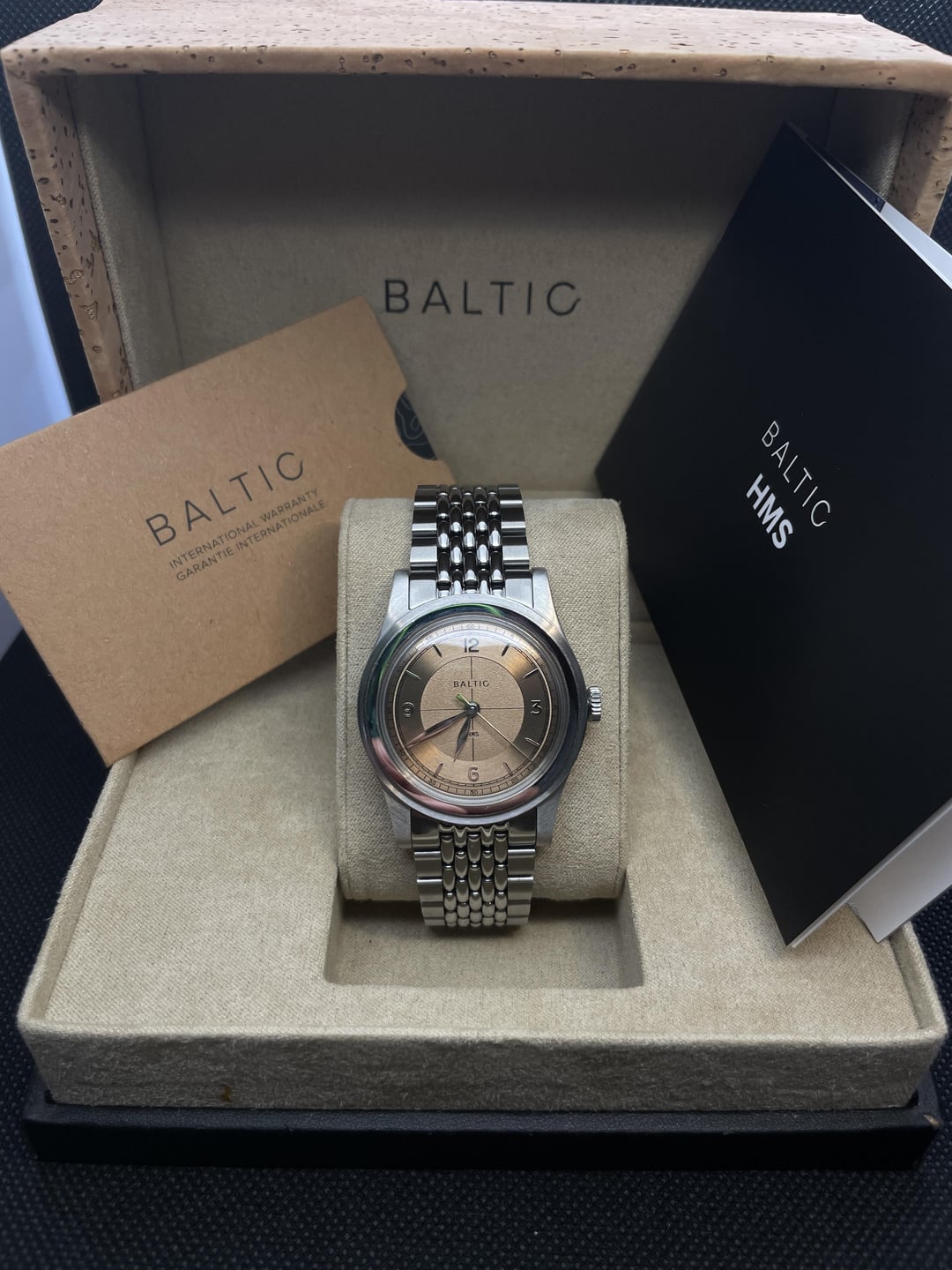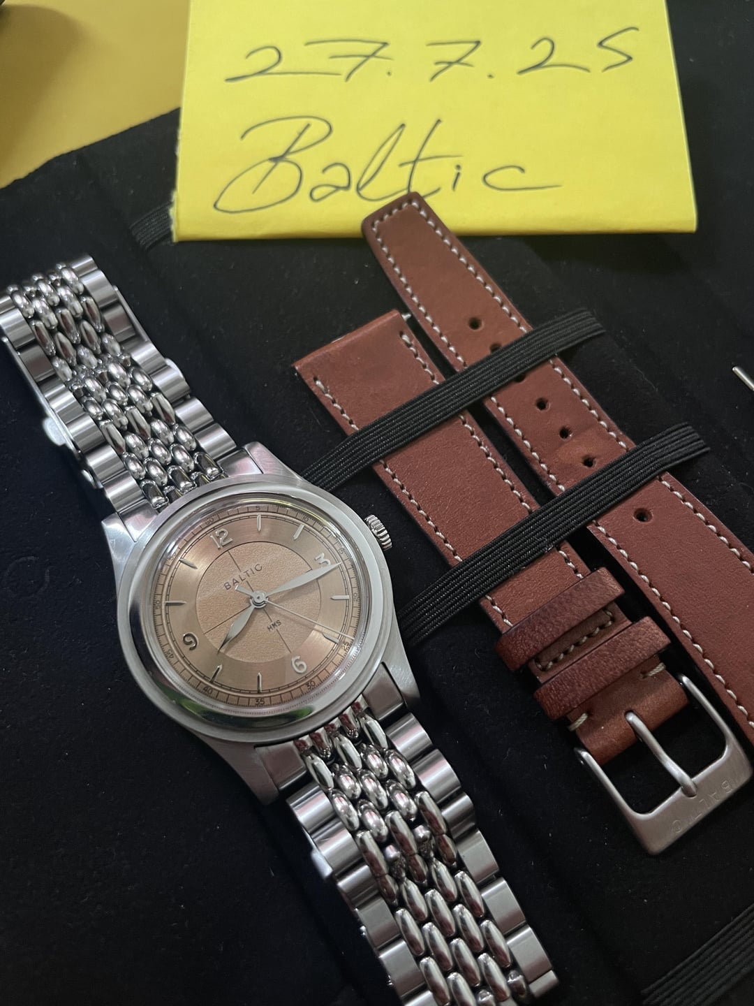 Selling my Baltic HMS 003 Salmon Dial – classic vintage style, elegant look **Condition** Front: scratch-free Back: minimal signs of wear Original leather strap in excellent shape **Specs** 36.5 mm case 46 mm lug-to-lug 13 mm thick (10 mm without crystal) 20 mm lug width Automatic Miyota 8315, 60h power reserve High-domed Hesalite crystal 50 m water resistance Brushed and sandblasted salmon dial **Comes with original leather strap + original Beads of Rice stainless steel bracelet (retail €130.90)** **Price 330€ + shipping** **Location Germany** Payment PayPal F&F Let me know if you need a title or photo caption too.