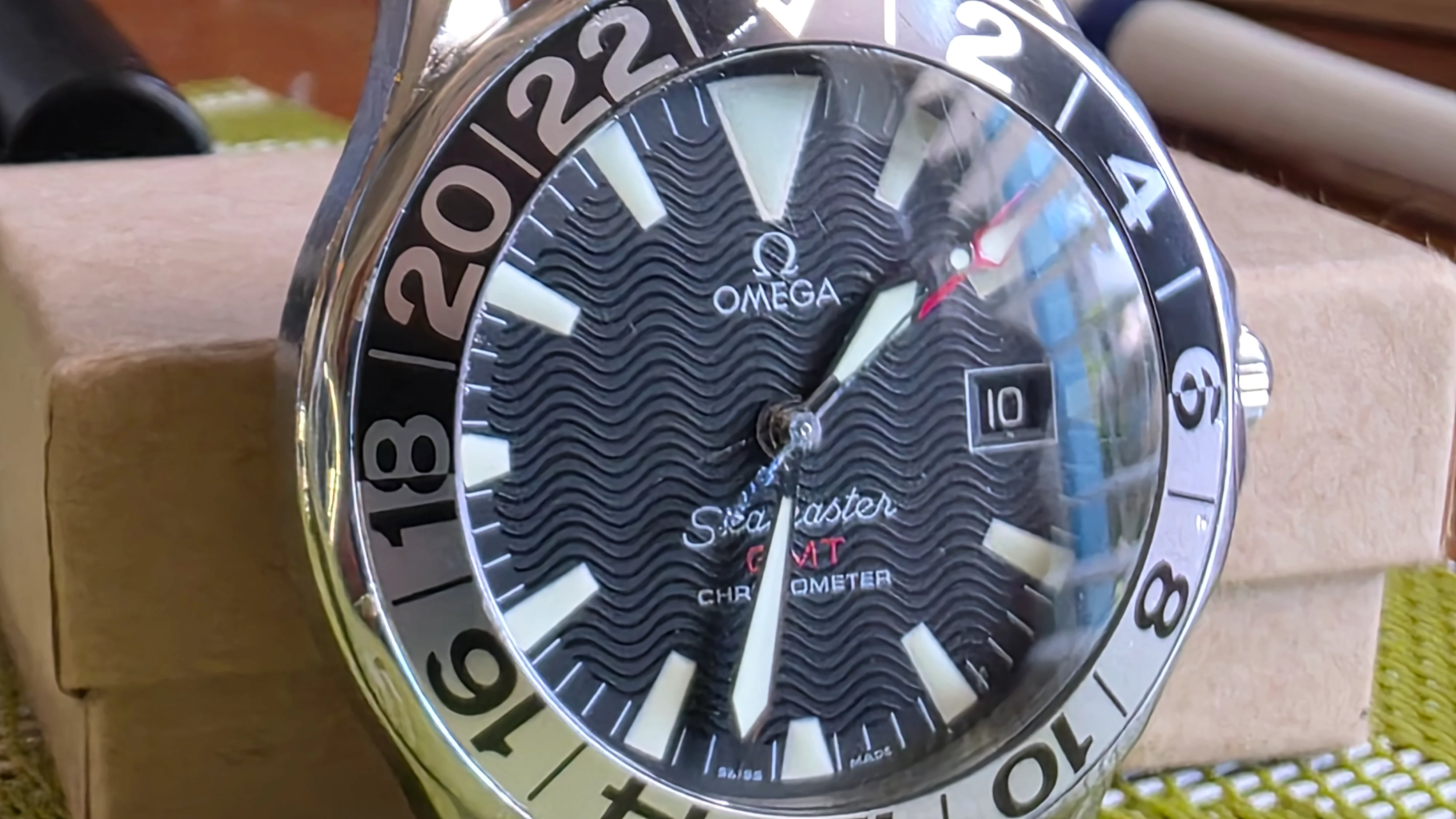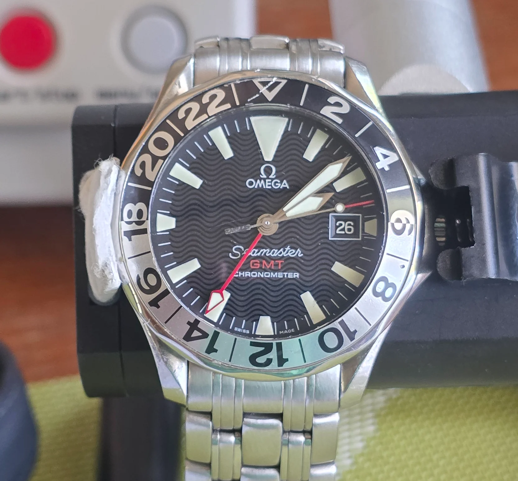 ~ Dial: matte black dial with the signature Seamaster wave pattern, large luminous “Sword hands” and hour markers, and a bold, red-tipped GMT hand