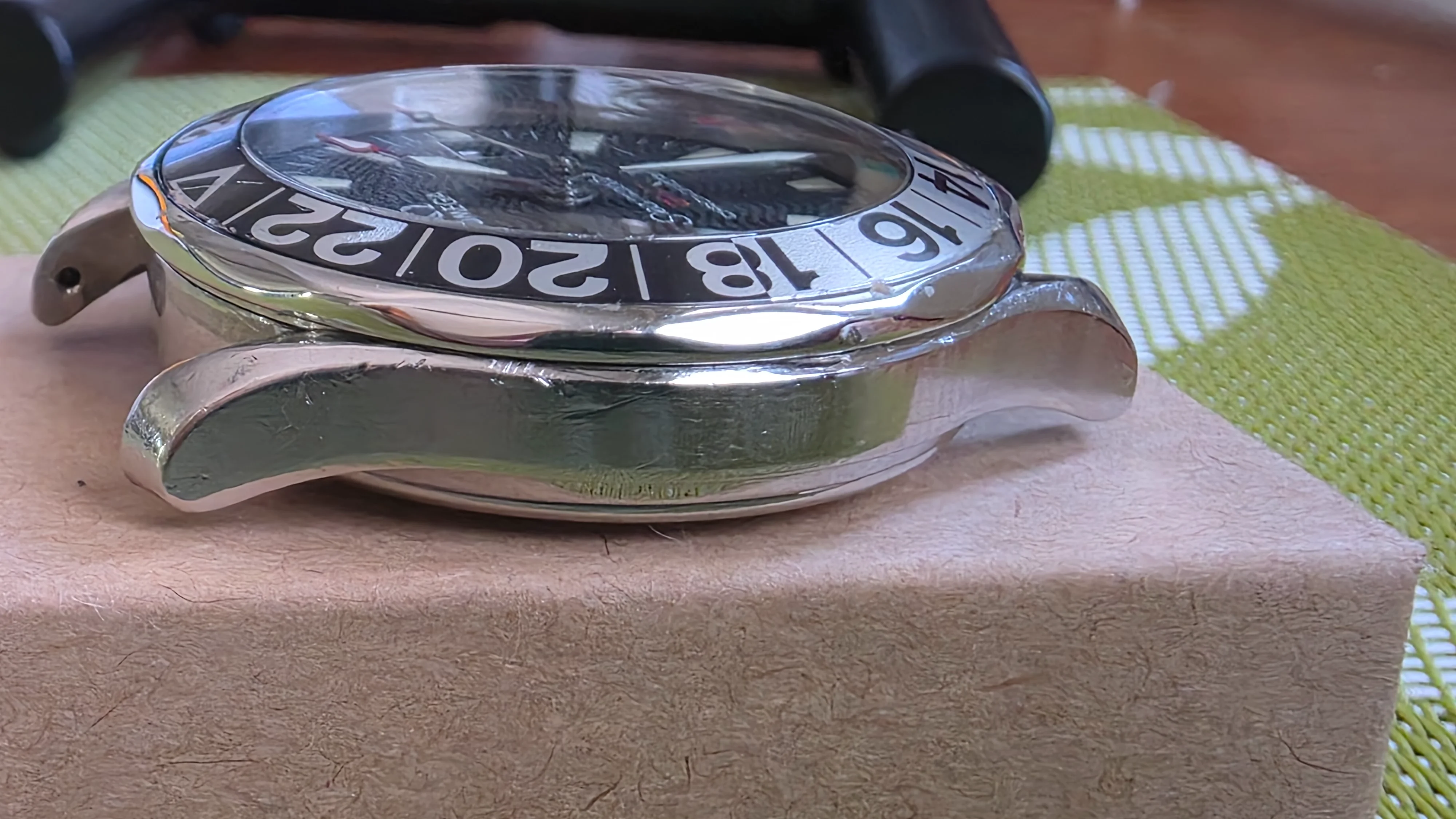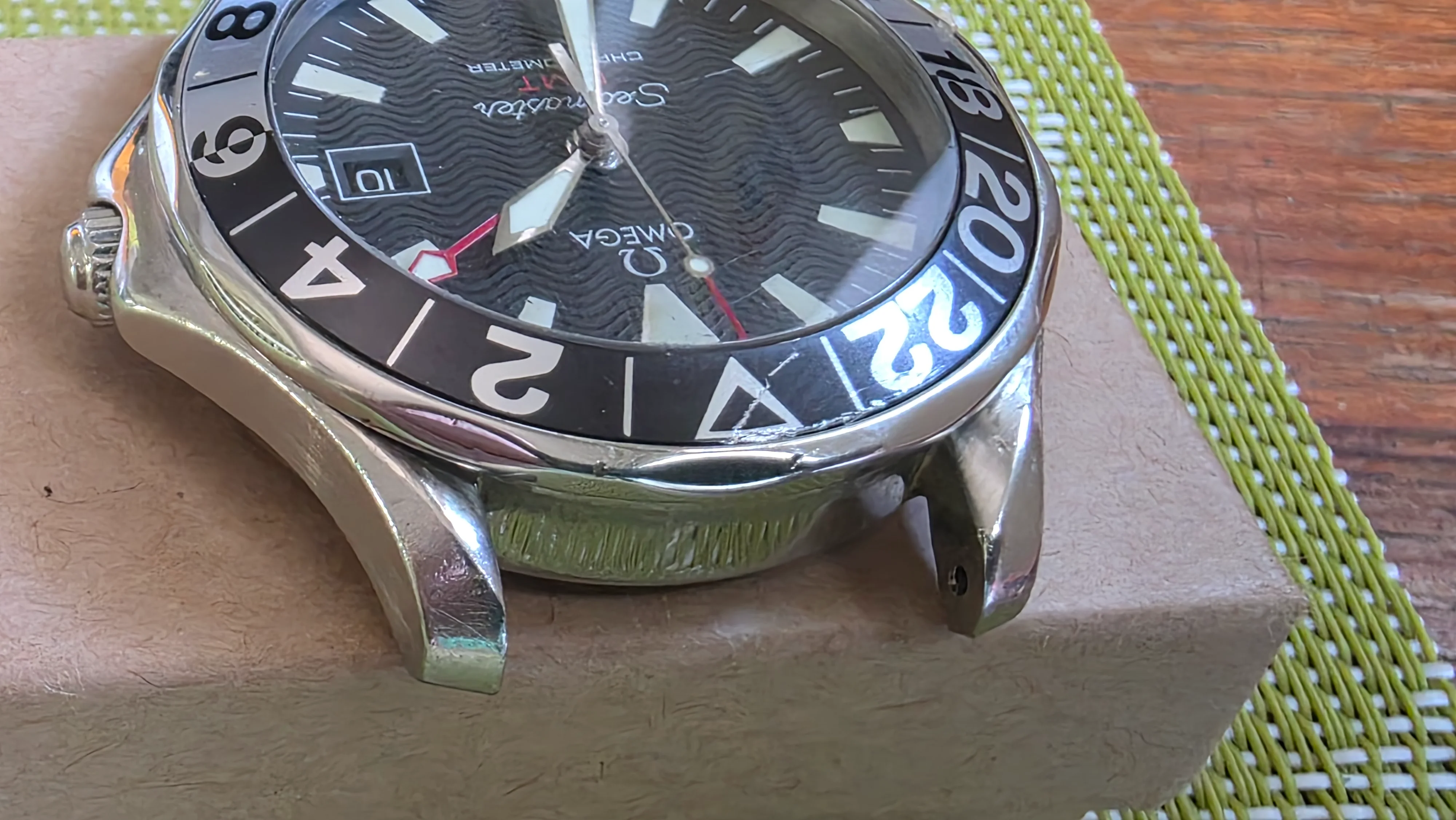 This is a worn watch, so it shows expected signs of use. As careful as I am, there are still wear marks along the case, scuffs on the outer bezel and insert, particularly around the 12:00 mark. Please refer to the photos for close-ups. The crystal has a couple scratches which are visible to the eye. The watch still presents well on the wrist, though of course macro photos will exaggerate imperfections. Please ask if you would like more photos of certain angles that I may have missed. This would be a good candidate for polishing, which would bring it back to its beautiful original condition.