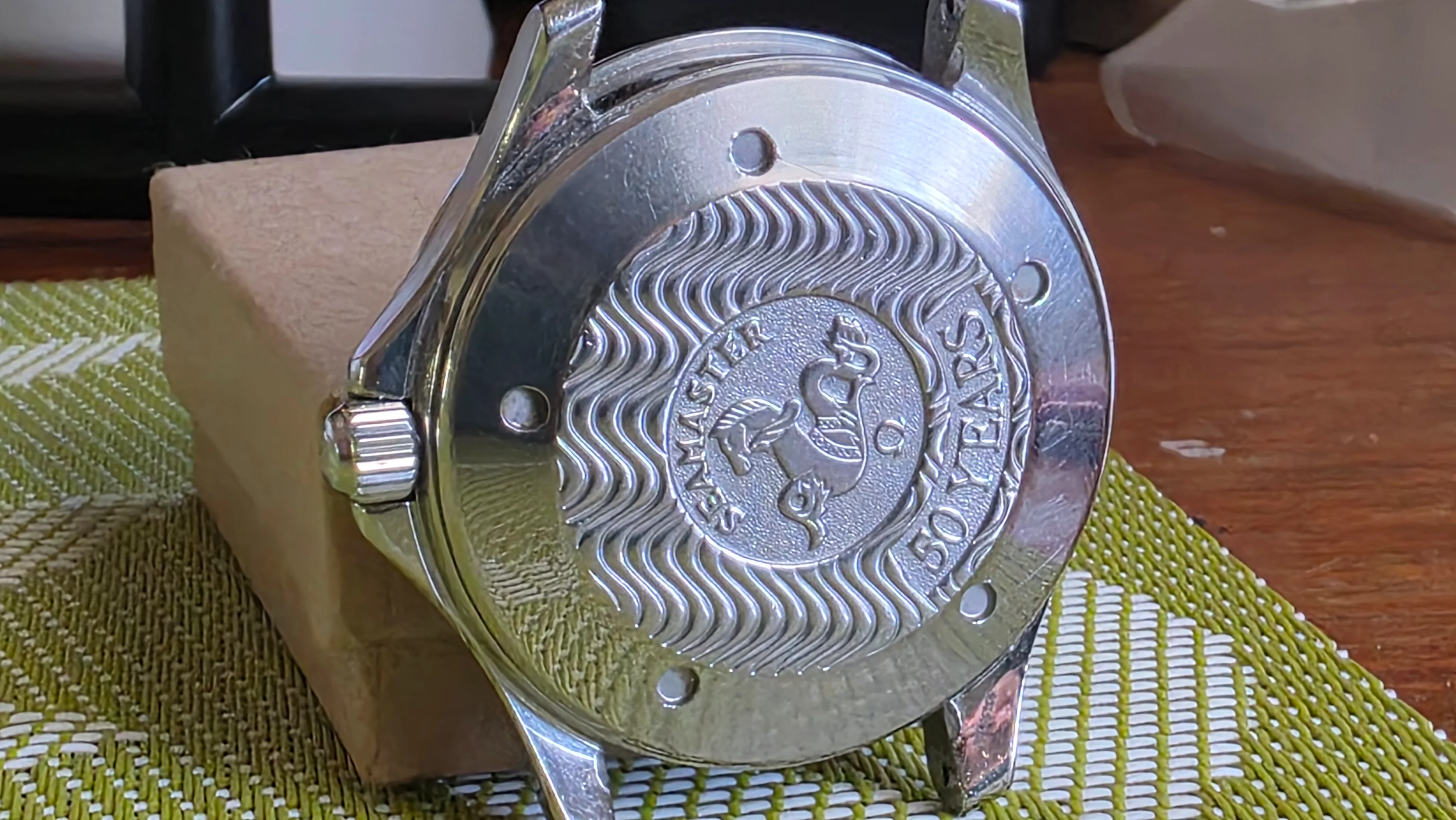 ~ Case Back: Solid stainless steel with Omega Seahorse (Hippocampus) and anniversary “50 YEARS” engravings.