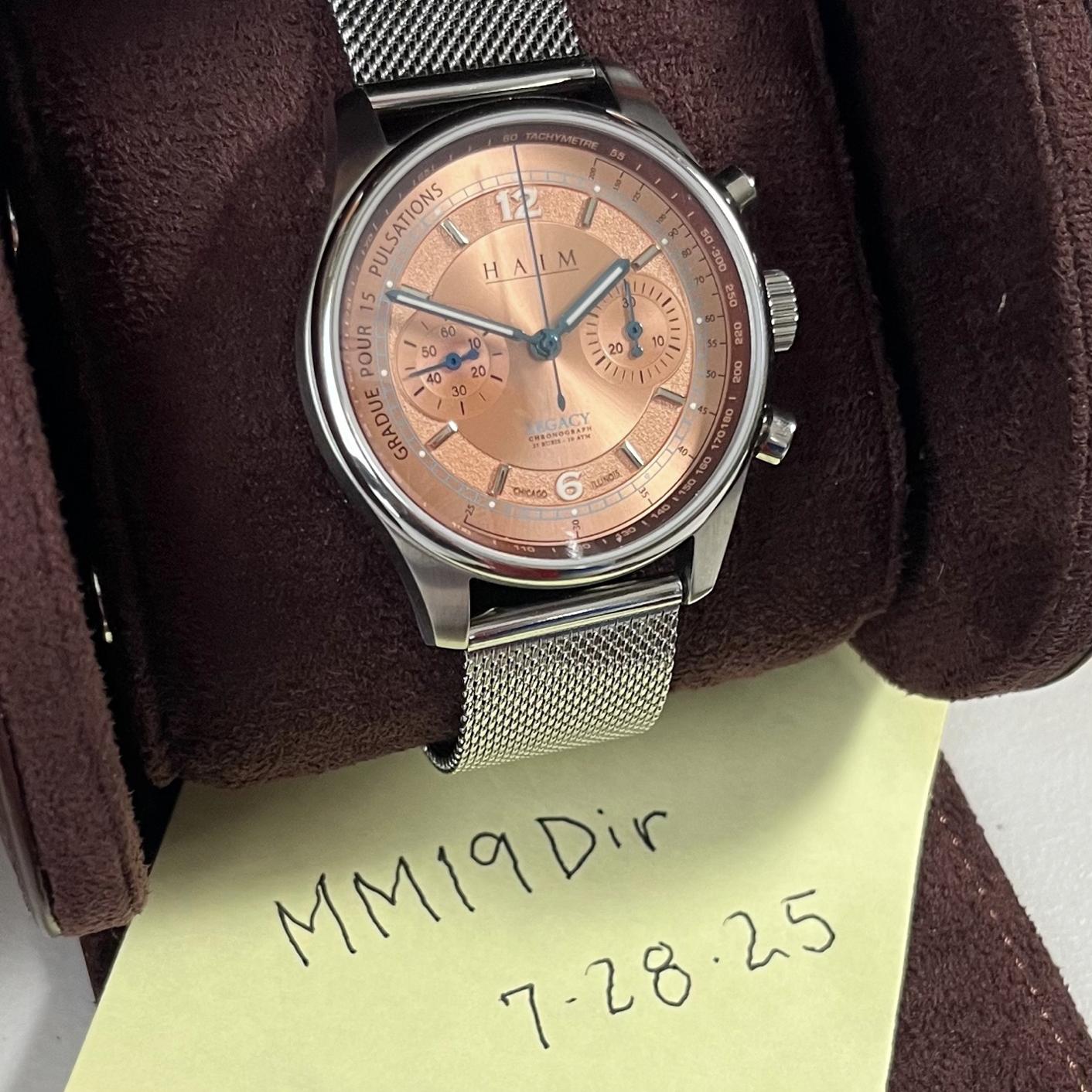Offering for sale this HAIM Watch Company Legacy SE mechanical. No longer in production, the piece, with its sunray & textured salmon dial, complemented with black and baby blue text, provides a sharp and elegant wrist presence. The Legacy SE comes with the the installed mesh band as well as an unused soft leather strap. In addition, there’s a padded leather travel case. The clear sticker on the display caseback has collected some dust around the edges and so obscures the text engraved around the circumference: HAIM WATCH CO. LEGACY SE CHRONOGRAPH DESIGNED IN CHICAGO STAINLESS STEEL WATER RESISTANCE 10ATM MANUAL WIND. The watch was purchased new in 2022, has been worn perhaps a half-dozen times, and the only flaw I’m able to see is a bit of scuffing on the mesh band clasp. My household is non-smoking. The sale is part of a paring down of my collection. Full gallery here: [https://imgur.com/a/LF14Rgs](https://imgur.com/a/LF14Rgs) From the HAIM website: · Case size: 39.5mm x 47mm (lug to lug) · Watch thickness: 13mm · Case material: 316L marine-grade stainless steel. · Crystal: Curved Sapphire Crystal with Anti-reflective coating. · Lug size: 20mm · Water resistance: 10 ATM (100 meters) · Hands: Swiss Superluminova luminous · Bracelet: Bespoke Genuine Leather 20mm strap with 18mm Haim pin buckle with quick release function. · Movement: ST1901 manual wind mechanical movement with column-wheel (Mechanical). Price: $470 through PayPal, including USPS Priority shipping to the CUS.