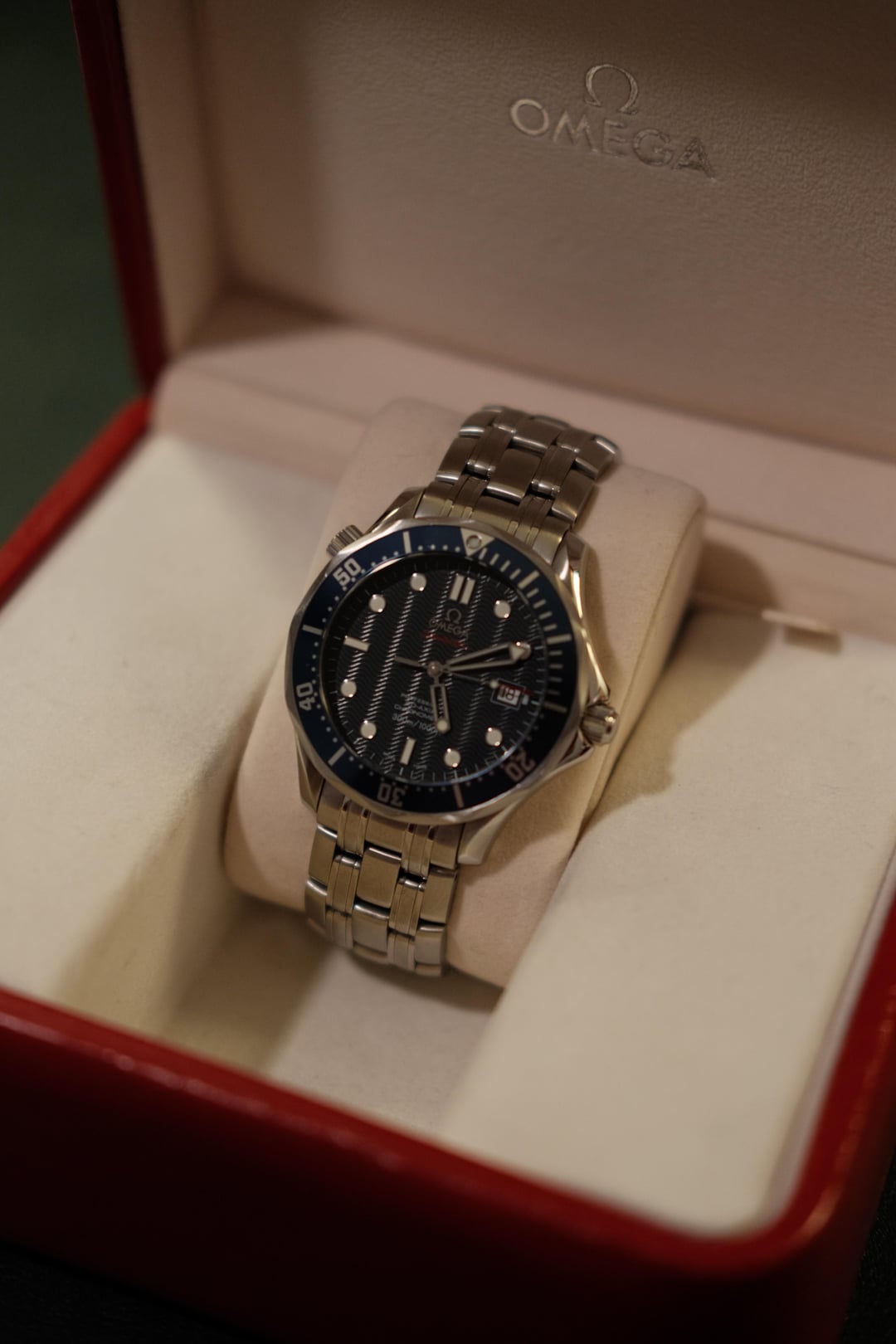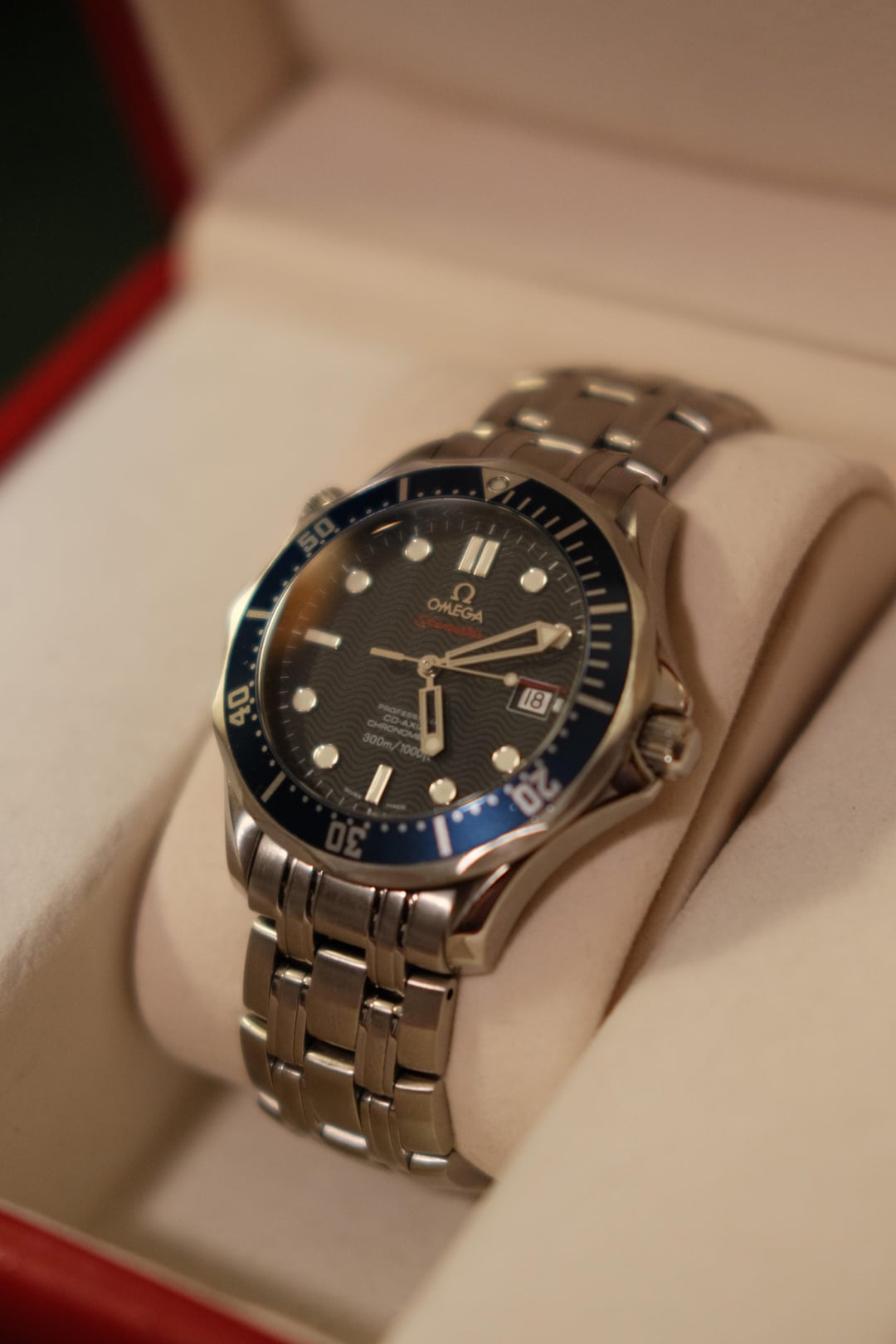 Hi all, up for sale is my Omega Seamaster Professional 300M Co‑Axial Chronometer (Ref. 2220.80) – the iconic diver worn by Daniel Craig as James Bond in Casino Royale. This watch needs little introduction: it's one of the most recognizable Seamasters ever produced, featuring the classic blue wave dial, sword hands, helium escape valve, and 300m water resistance that made the SMP a modern classic. I have worn it only a few months and it was kept in my safe most of the time after I received my Skyfall Aqua Terra. I originally purchased this watch from Delray Watch, and it was recently serviced and pressure‑tested, so it's running perfectly and ready for any adventure. While it's a versatile everyday diver, it also carries that undeniable Bond connection that makes it a standout addition to any collection. If you want more pictures or videos feel free to message me! Details: Model: Omega Seamaster Professional 300M Reference: 2220.80 Case Size: 41mm stainless steel Movement: Omega Co‑Axial Caliber 2500 automatic chronometer Dial: Blue wave dial, applied indices, date at 3 Bezel: Blue unidirectional Crystal: Sapphire, AR-coated Bracelet: Stainless steel bracelet (fits wrists up to 7") Water Resistance: 300m / 1000ft (recently pressure‑tested) Condition: Recently serviced and passed pressure test – running strong and ready to wear. Excellent overall condition with light wear consistent with careful use. Crystal is clean, bezel sharp, bracelet shows superficial slight desk marks. What's included: Original Omega box, originally purchased from Delray Watch I will include a Spectre style nato strap to go with the watch. Price: $3499 USD (FIRM) shipped CONUS. Price includes fully insured Fedex/UPS shipping in the USA— hand delivery in Southern Utah area, Washington county and Iron county. Payment via Zelle, Venmo or PayPal G&S+3%, Paypal F&F for buyers with strong references.