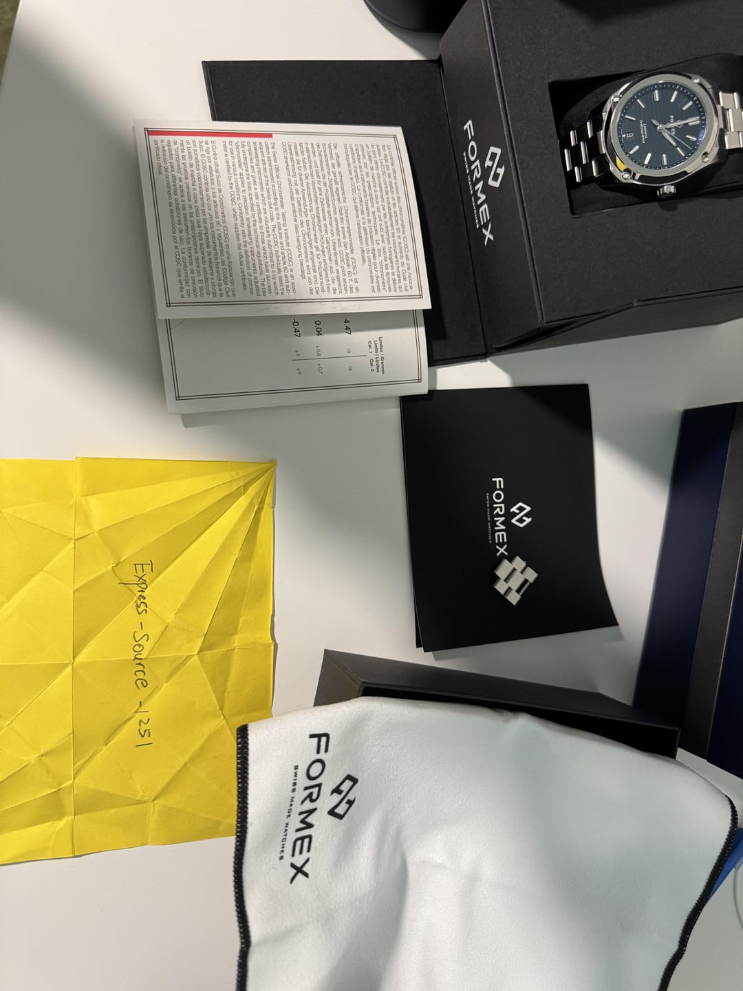 Price: $970 (negotiable) (shipped CONUS, PayPal G&S – fees included) Trades: Looking to trade down (like at least $400-500 in cash, maybe willing to trade for a traska + cash. Condition: Good. Some light wear consistent with careful use, no dings, but there is one deeper scratch shown on bezel near crown, but won’t be noticeable unless you hold it close. Crystal is perfect. Full kit included (watch, bracelet, box, papers). Details: • Model: Formex Essence 39 • Movement: Sellita SW200-1 COSC Certified Automatic • Case Size: 39mm • Water Resistance: 100m • Bracelet with tool-free micro-adjustment Smooth winding, keeps excellent time. Bracelet clasp works perfectly. The is dated 6/10/2025 and has the newest upgraded full tungsten rotor. Shipping: within CONUS. Or local meet up anywhere near Bay Area, or Sacramento. If local meet up price is $930 Payment: PayPal G&S only (no trades at this time).