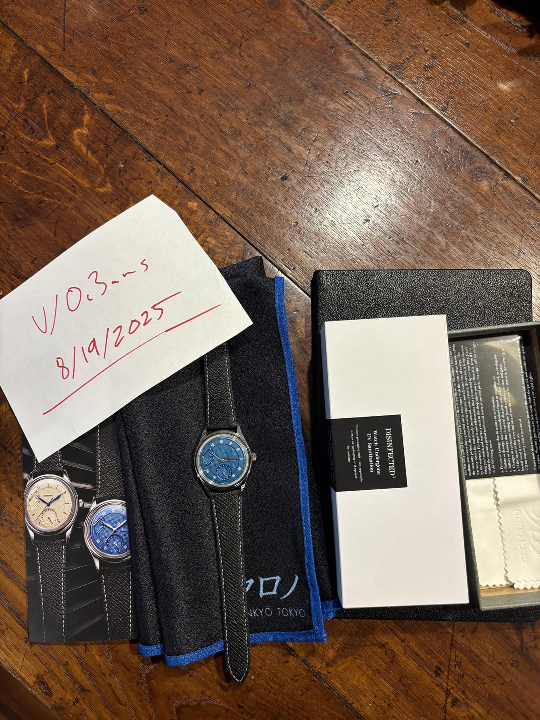 For sale is this beautiful Kurono Tokyo Sensu NOS with a stunning blue dial. This watch was delivered to me in January of this year but I am unfortunately forced to part with it. It the watch’s warranty is valid through Jan 2026. Th watch comes with box and warranty card on its beautiful black leather original strap. (Blue delugs strap in first photos not included in price) $4850 USD Shipped CONUS