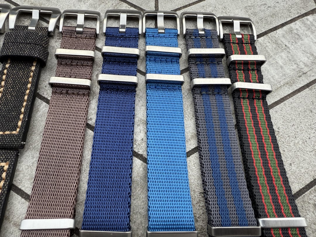 For sale are new 20 mm straps. I will waive the shipping fee if you buy $45 worth of stuff. For users with shipping address in New Jersey, sales tax of 6.625% will be added to the price. Left to right: No. 1 - 2: Aviator style cowhide leather straps, length of 125 mm + 75 mm, 20 mm stainless steel buckle, quick release pins. Price for each is ~~$10~~ $5. For orders under $45, add one time shipping fee of $5. No. 3: Hybrid strap, upper layer is leather and lower layer is FKM rubber. Specs: 3 mm depth, length of 125 mm + 75 mm, 18 mm stainless steel buckle, quick release pins. Price for each is ~~$23~~ $13. For orders under $45, add one time shipping fee of $5. No. 4: Canvas strap, model A. Specs: 115 mm + 75 mm length, 2.8 mm thickness, 18 mm stainless steel buckle, faux leather lining. Price for each is ~~$11~~ $4. For orders under $45, add one time shipping fee of $5. No. 5: Canvas strap, model B. Specs: 120 mm + 75 mm length, 2 mm thickness, 20 mm stainless steel buckle, quick release pins. Price for each is ~~$14~~ $6. For orders under $45, add one time shipping fee of $5. No. 6 - 7: Canvas straps, model C. Specs: 125 mm + 75 mm length, 4 mm thickness, 20 mm stainless steel buckle, leather lining, quick release pins. Price for each is ~~$15~~ $7. For orders under $45, add one time shipping fee of $5. No. 8 - 12: NATO style straps, model B. Specs: high quality soft nylon, 1 .5 mm thick, length of 285 mm, stainless steel hardware. Price for each is $6.50. For orders under $45, add one time shipping fee of $5. Thanks! Timestamp: [https://imgur.com/KXNWSiJ](https://imgur.com/KXNWSiJ)