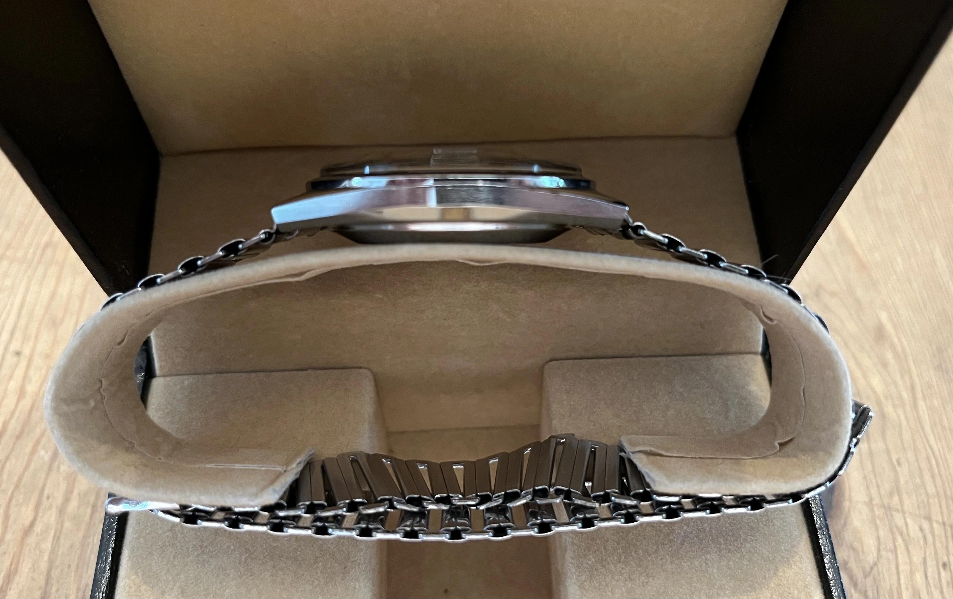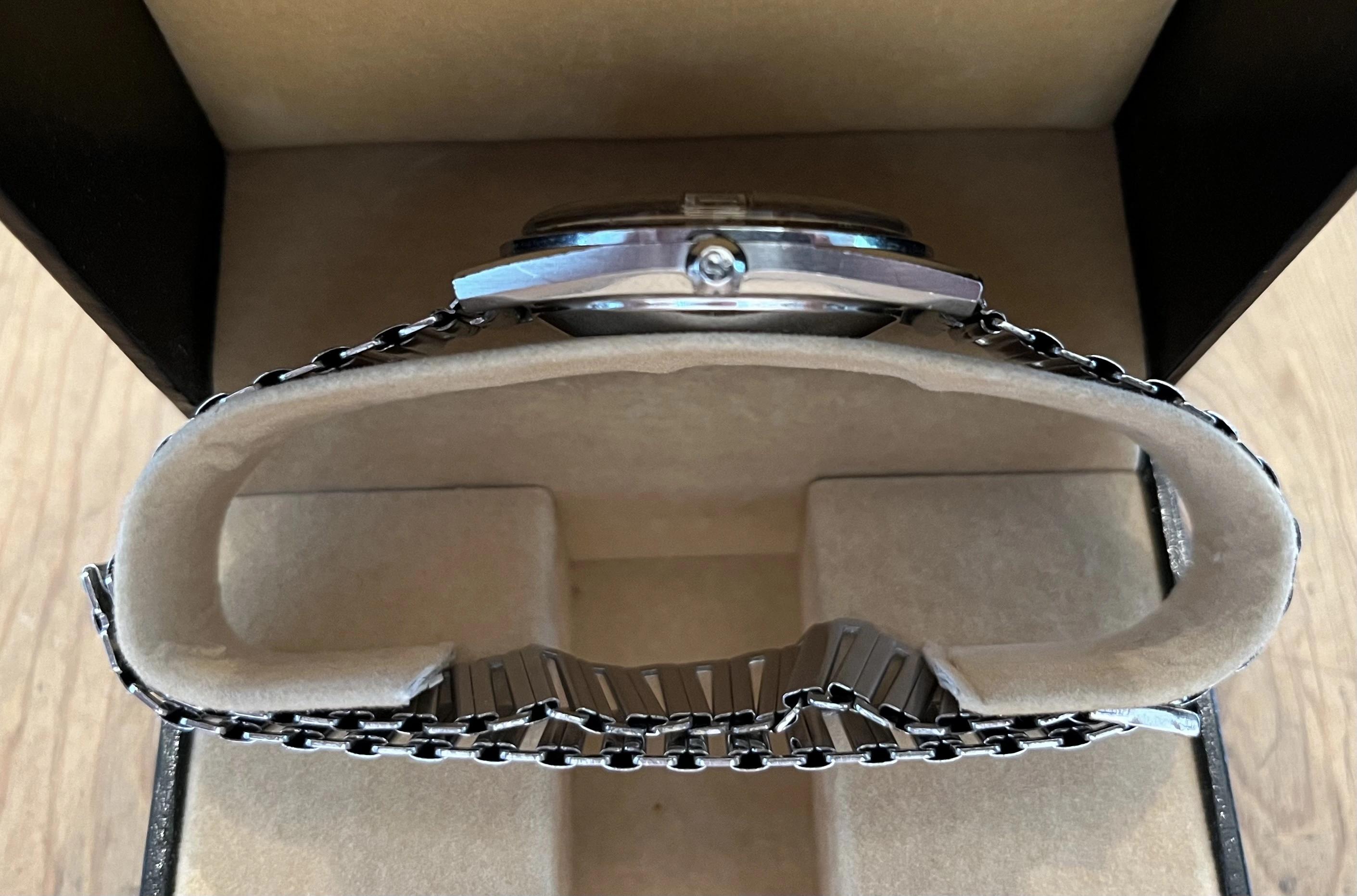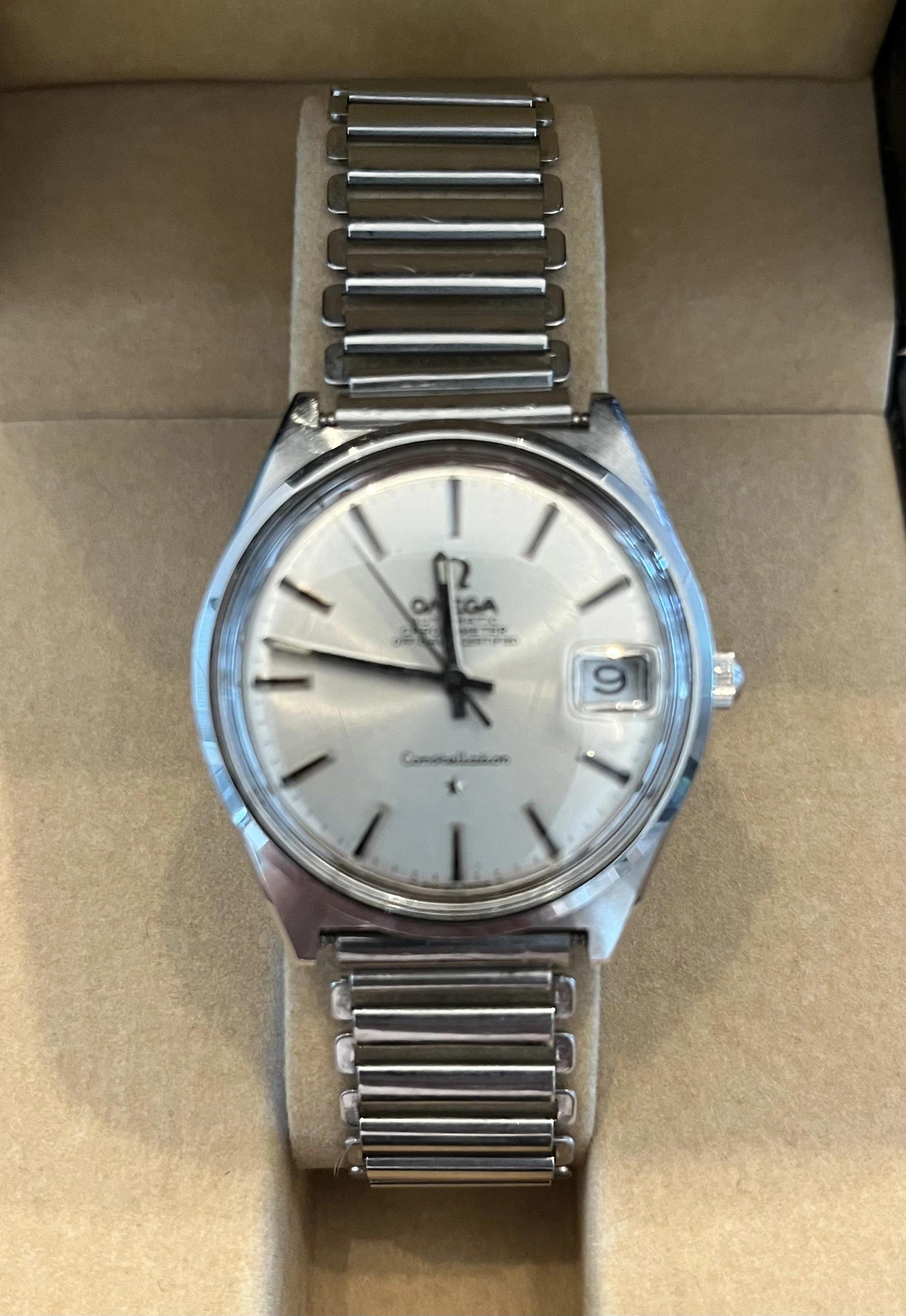Omega Constellation Ref. 168.015 ca.1966-67 on a vintage Bonklip bracelet. Watch is in excellent condition for being nearly 60 and is completely original, down to its dial, hands, crown and crystal. Will include a 7-row BoR straight-end bracelet less clasp in the sale. Timekeeping is okay, but needs a service, although I don’t really mind, and the quick set date function operates perfectly as designed. Just a sweet little Connie that can be worn as is!
