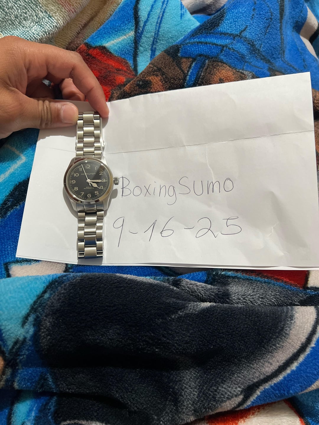 Hamilton Murph 38mm original bracelet, purchased at Jared June of this year. Full box and warranty card of two years and I have email receipt. Asking for 750 plus shipping