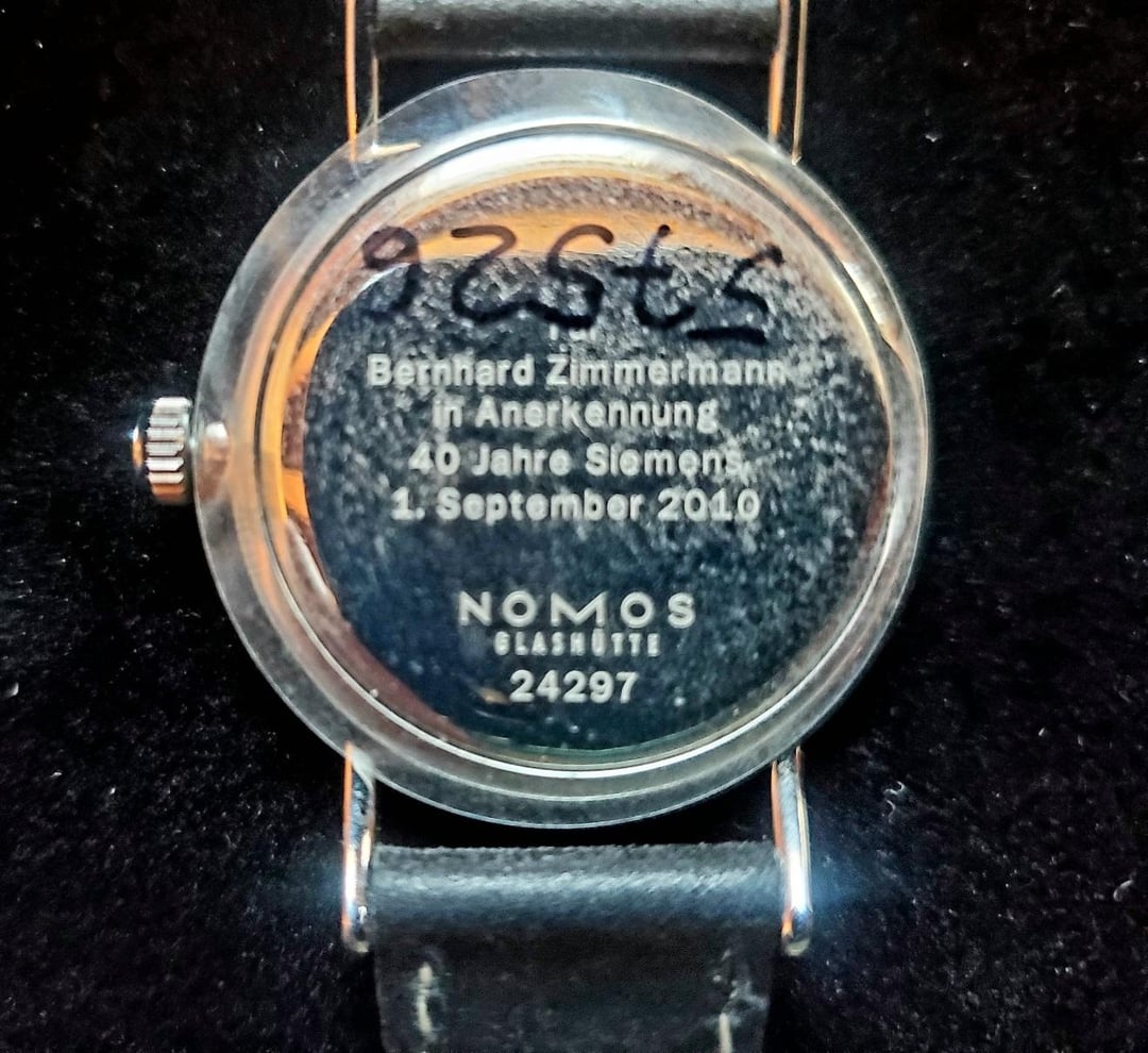 Nomos Ludwig, Siemens commemorative addition in 35mm **Watch**: Silver dial with blued hands. OEM Horween Shell Cordovan leather strap in black **Included**: Original wooden box, book **Condition**: In excellent condition. Was presented to me as NOS on a trade in Germany. There are a couple very small flea bites on the case around 10-11 o'clock that I can't see with naked eyes but can see with 10X loupe. Still has original rear plastic sticker as you can see on the pictures. Want to be very clear and upfront on any imperfections, you can ask questions, of course **Price**: Reduced to $825 shipped CONUS for a quick sale